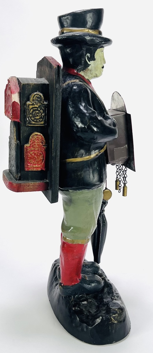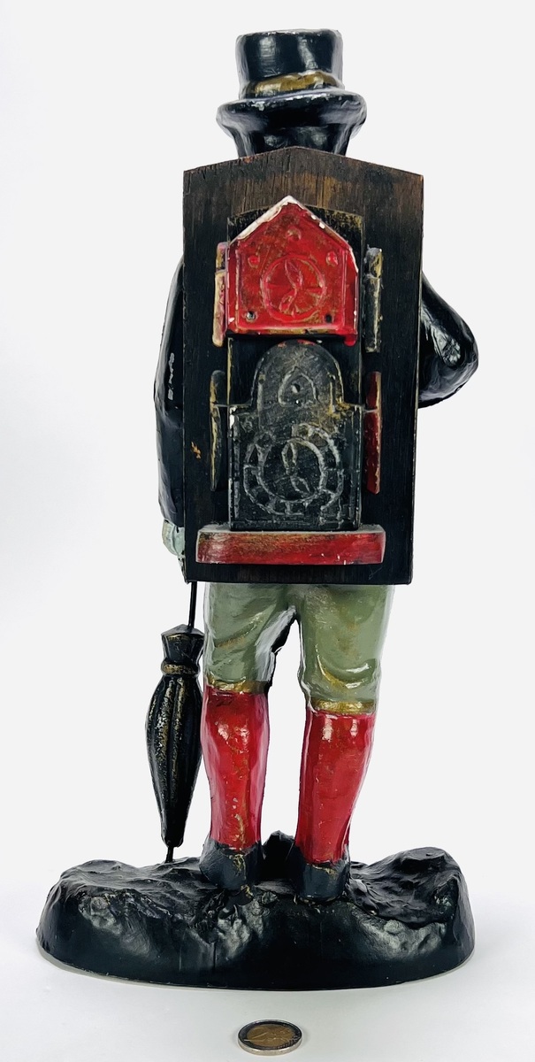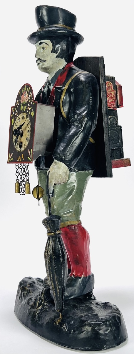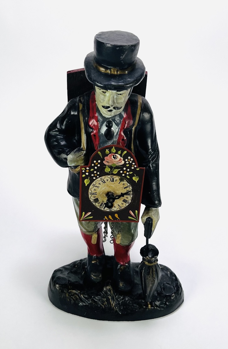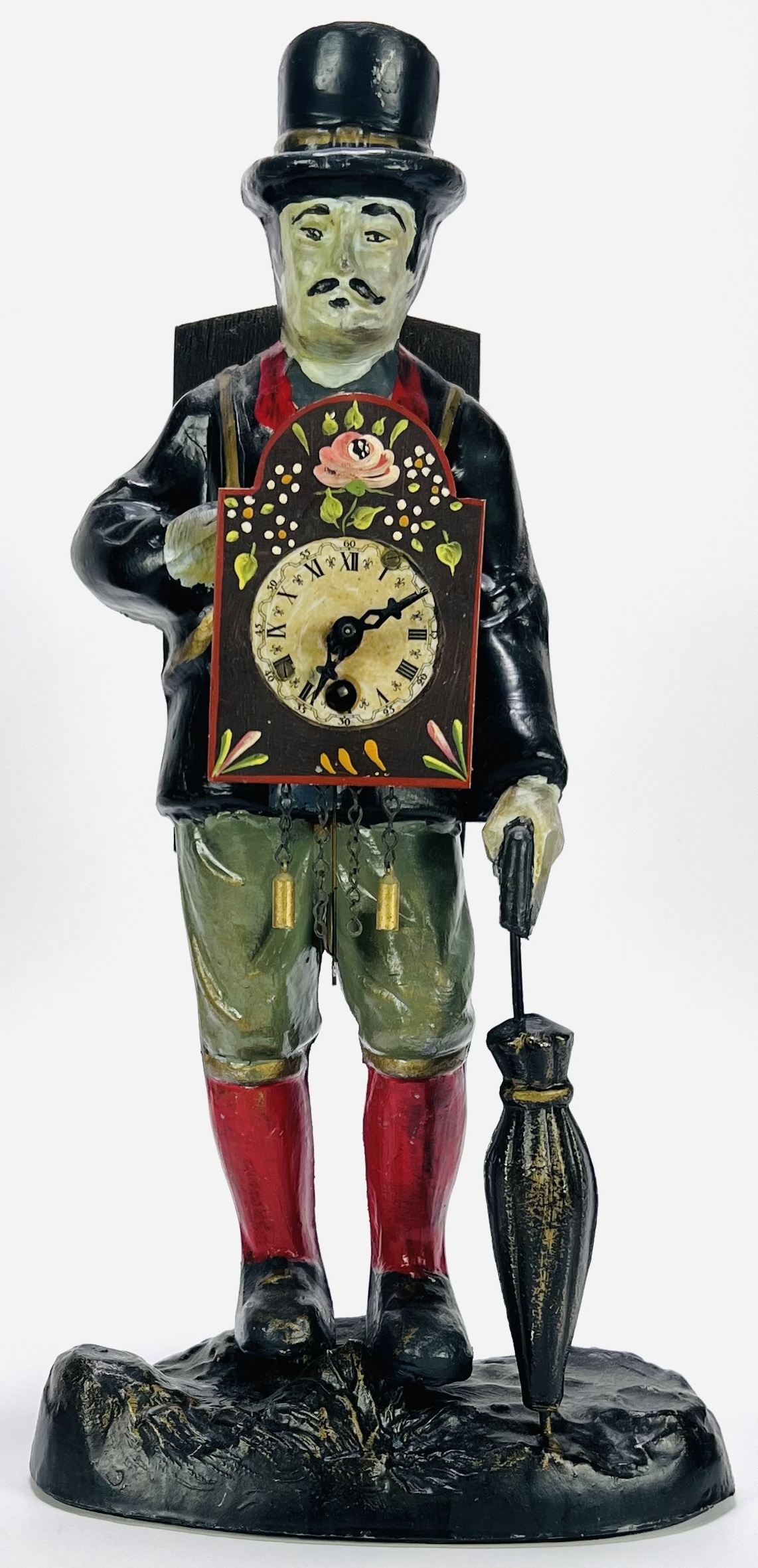 Klok in Biedermeier stijl van een Schwarzwalder klokkenman, vervaardigd uit handbeschilderd metaal en hout. De staande klokkenman draagt een functionele klok met floraal gedecoreerde wijzerplaat en diverse uurwerken op de rug. Kenmerkend zijn de traditionele klederdracht met rode kousen en de paraplu. De klok dateert uit circa 1970 en heeft een Duitse herkomst. De achterzijde van de klokkast is uitgevoerd in kunststof. Klaar om te bieden? Registreer je nu en doe mee aan de veiling! |