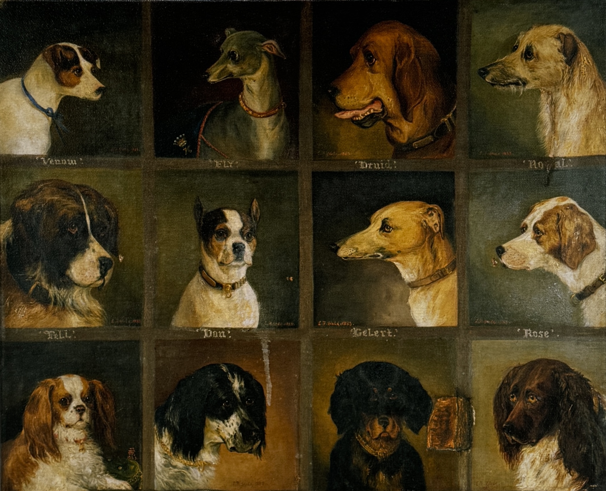 Kunstprint naar een schilderij naar Edwin Frederick Holt (1830–1912), op doek, toont twaalf hondenportretten in een rastercompositie. De voorstelling in academisch-realistische stijl hanteert een palet van warme aardtinten en een gedetailleerde weergave. De print dateert uit de 21e eeuw . Eerst de kunstprint zien voordat je biedt? Bezoek onze kijkdagen op 10, 11 en 12 april! |