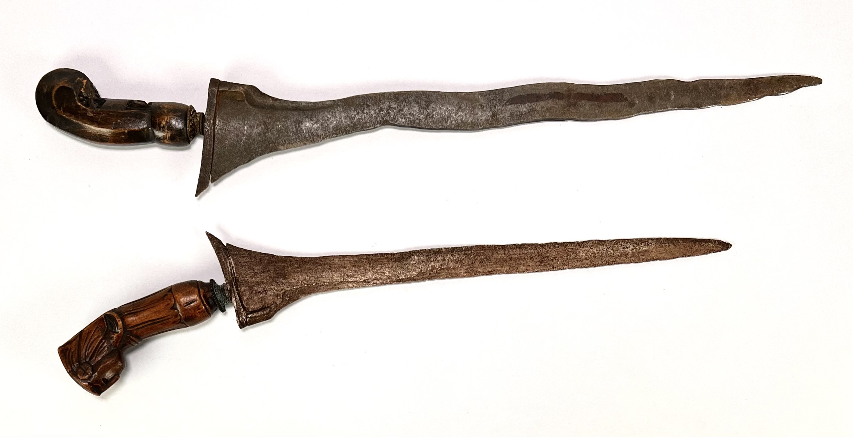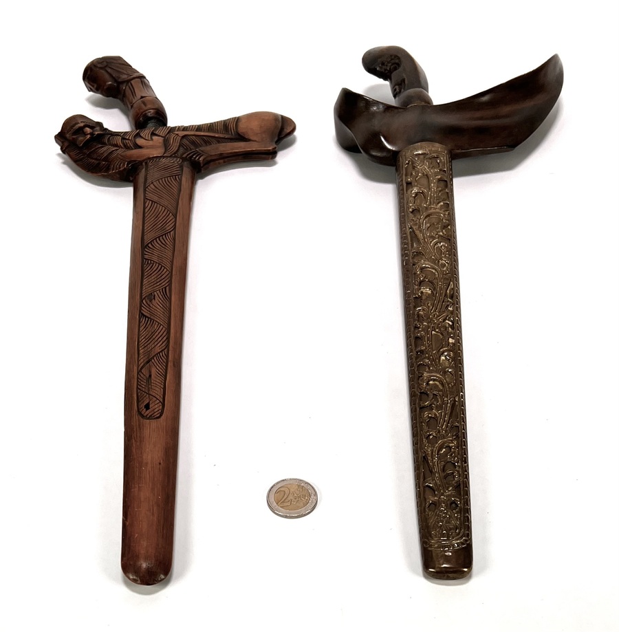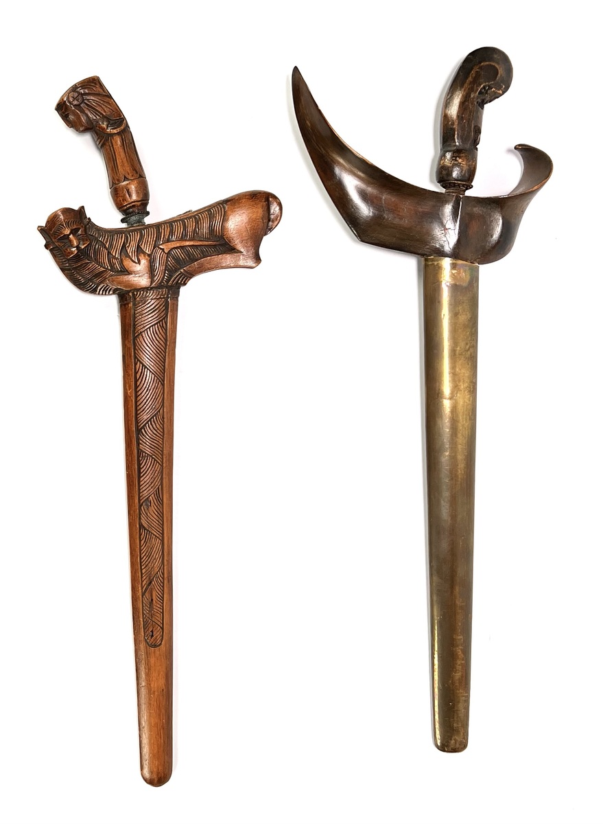Twee krissen in diverse stijlen, een keris lurus met figuratieve greep en rijk gesneden houten schede en een keris luk-5 in Surakarta-stijl. De wilah tonen pamor wos wutah en duidelijke ouderdomssporen. De tweede kris heeft een messing pendok met repoussé florale motieven. Beide krisse dateren uit de late negentiende eeuw en hebben een Javaanse herkomst. Klaar om te bieden? Registreer je nu en doe mee aan de veiling! |