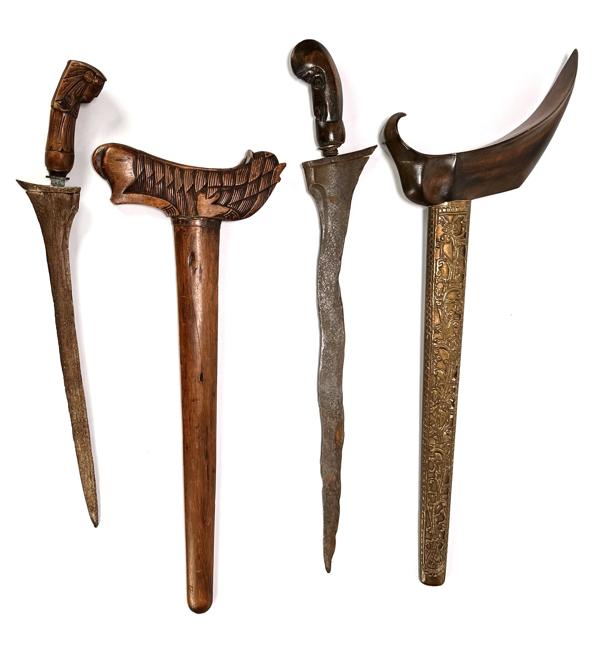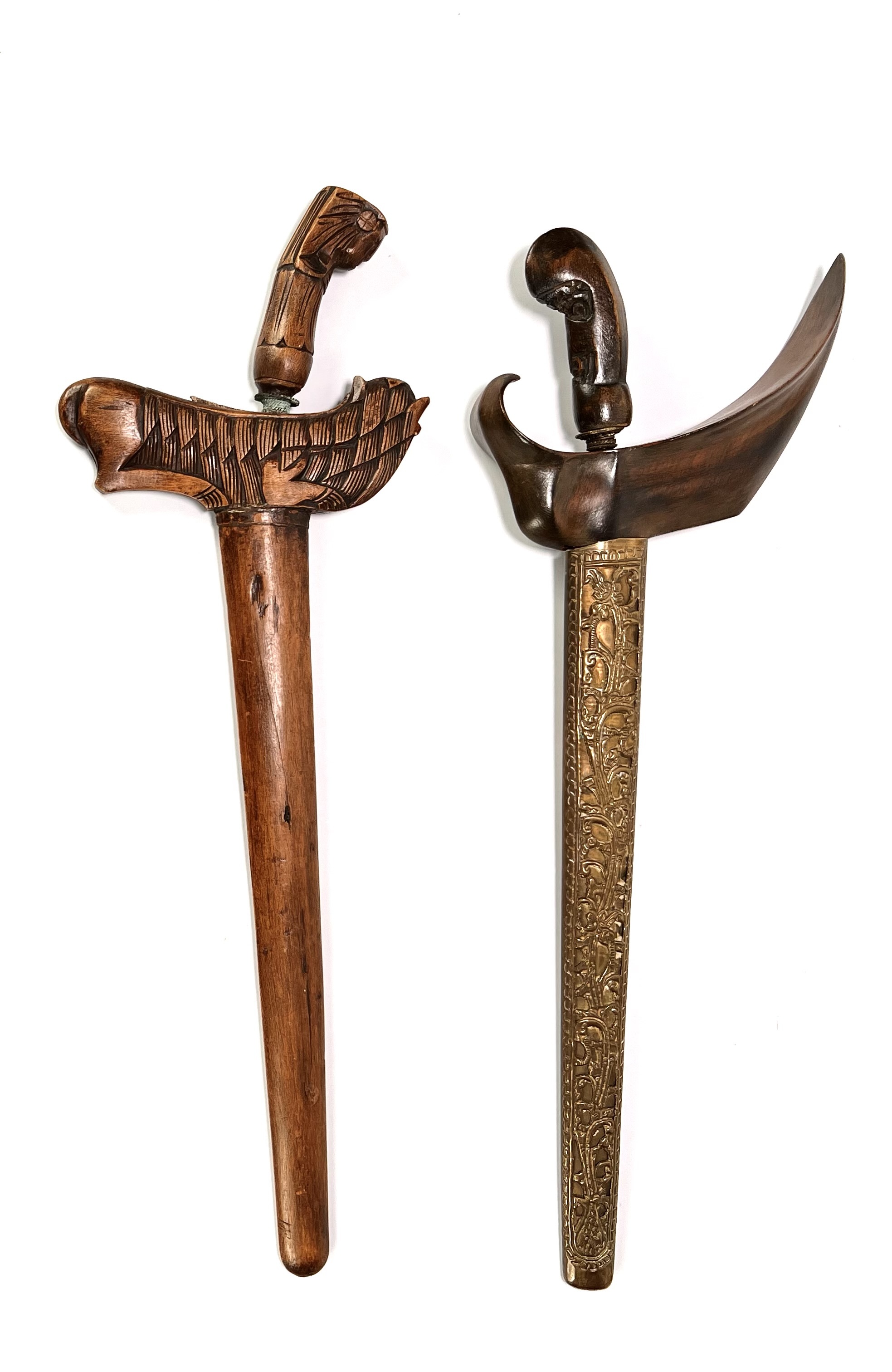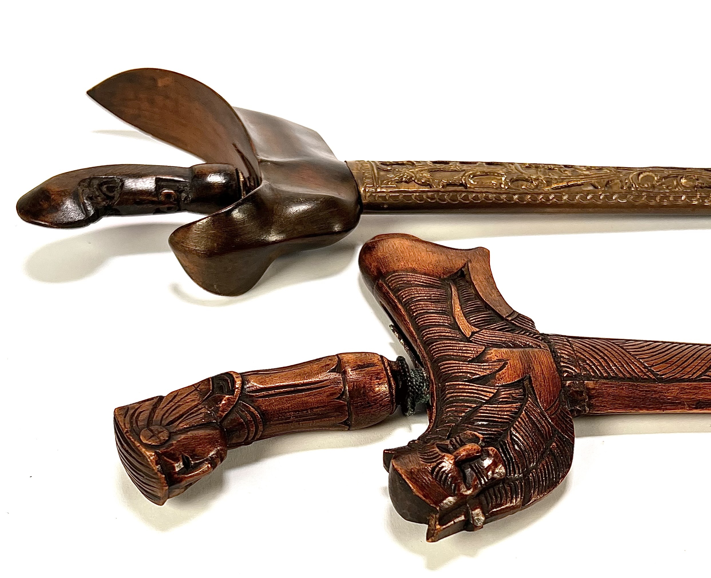 Twee krissen in diverse stijlen, een keris lurus met figuratieve greep en rijk gesneden houten schede en een keris luk-5 in Surakarta-stijl. De wilah tonen pamor wos wutah en duidelijke ouderdomssporen. De tweede kris heeft een messing pendok met repoussé florale motieven. Beide krisse dateren uit de late negentiende eeuw en hebben een Javaanse herkomst. Klaar om te bieden? Registreer je nu en doe mee aan de veiling! |
