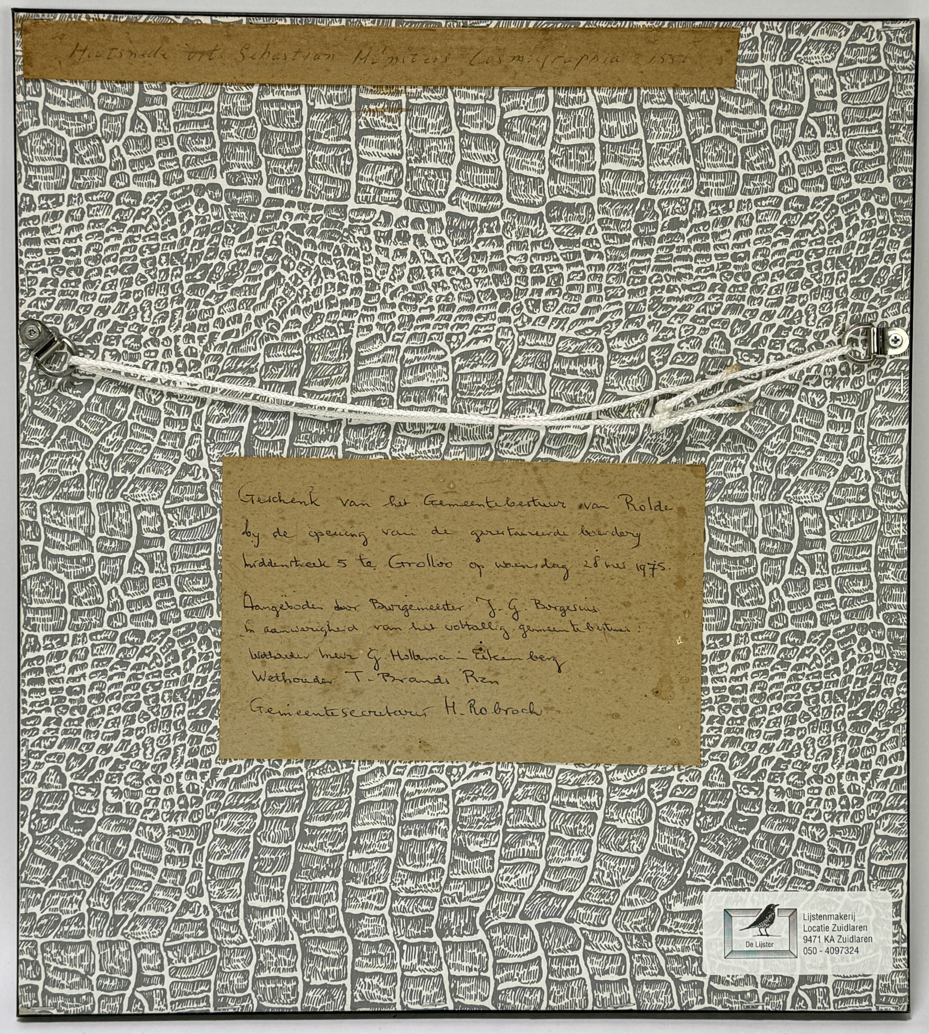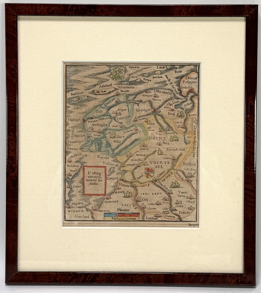 Houtsnede door Sebastian Münster (1488–1552) op papier toont Noord-Nederland met Friesland, Groningen en Overijssel in renaissancistische cartografie. Met Groningen centraal, de Zuiderzee links en talrijke steden als picturale nederzettingen met rode daken. Uitgegeven circa 1550 in de Duitse Cosmographia Universalis, met oude handkleuring en een onderblok in Duitse Frakturschrift over terrein, economie en bevolking. De houtsnede heeft een Duitse herkomst en is gepresenteerd in een wortelhouten lijst. Geïnteresseerd? Bezoek onze kijkdagen op 10, 11 en 12 april van 11:00 tot 17:00 uur! |