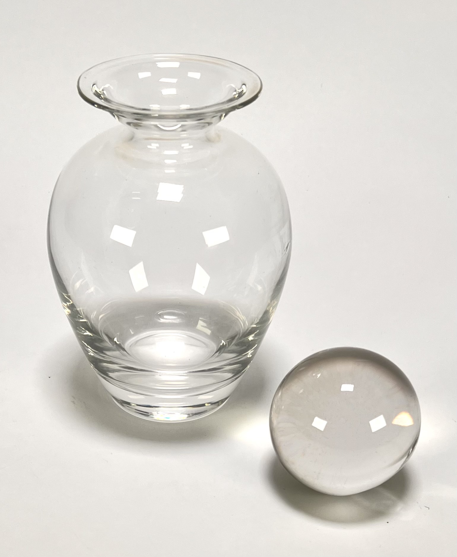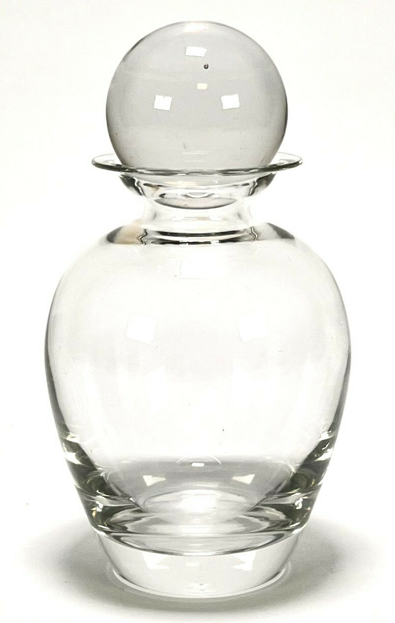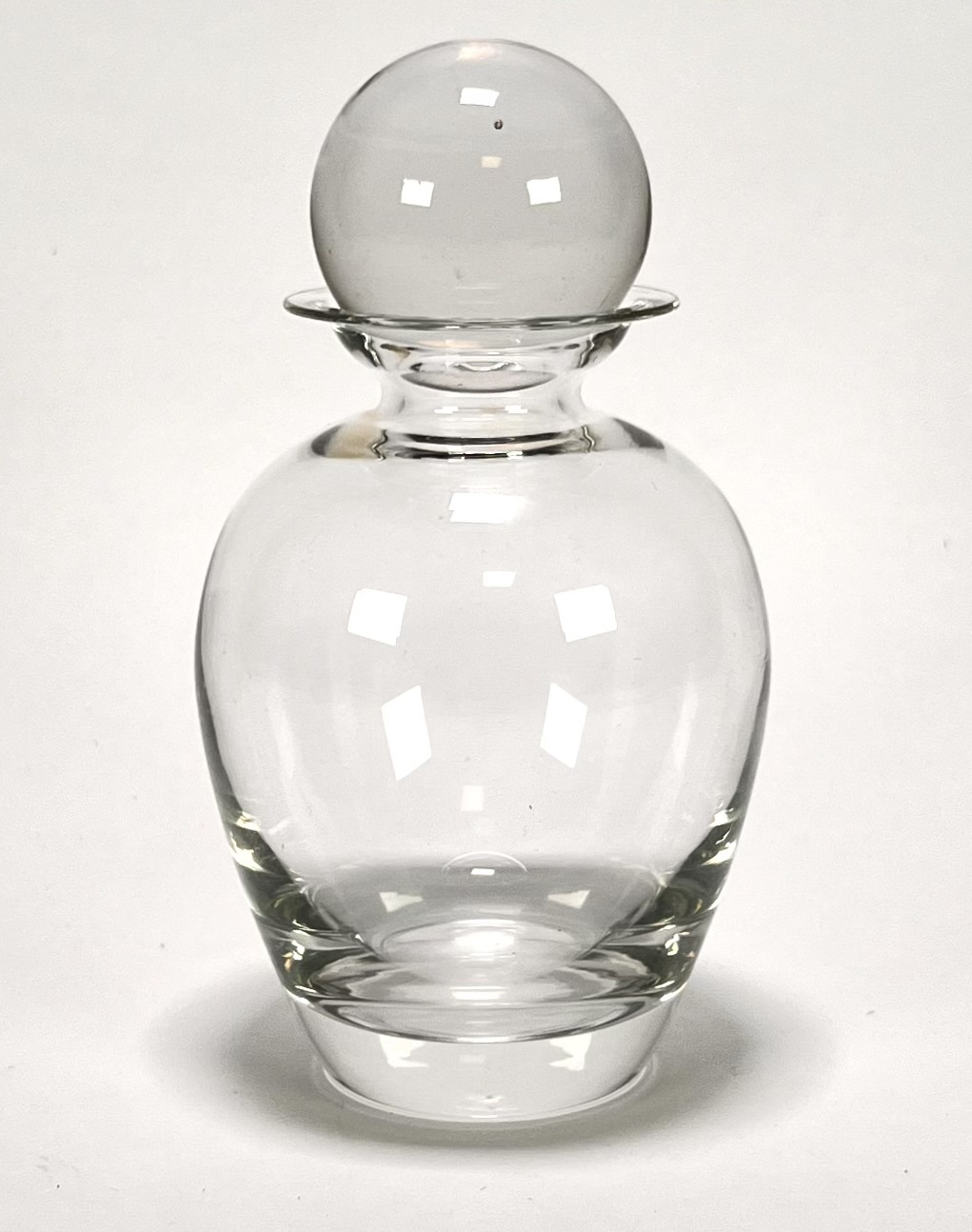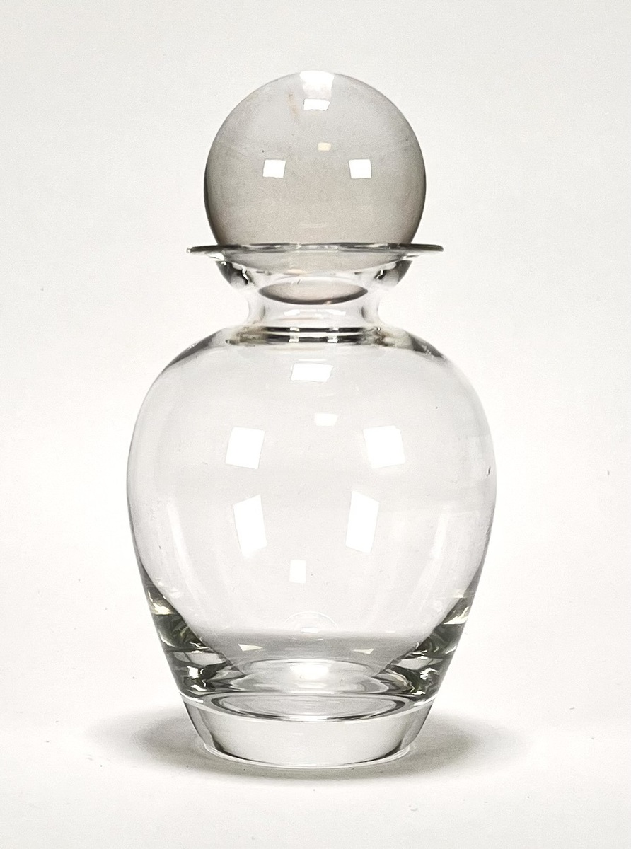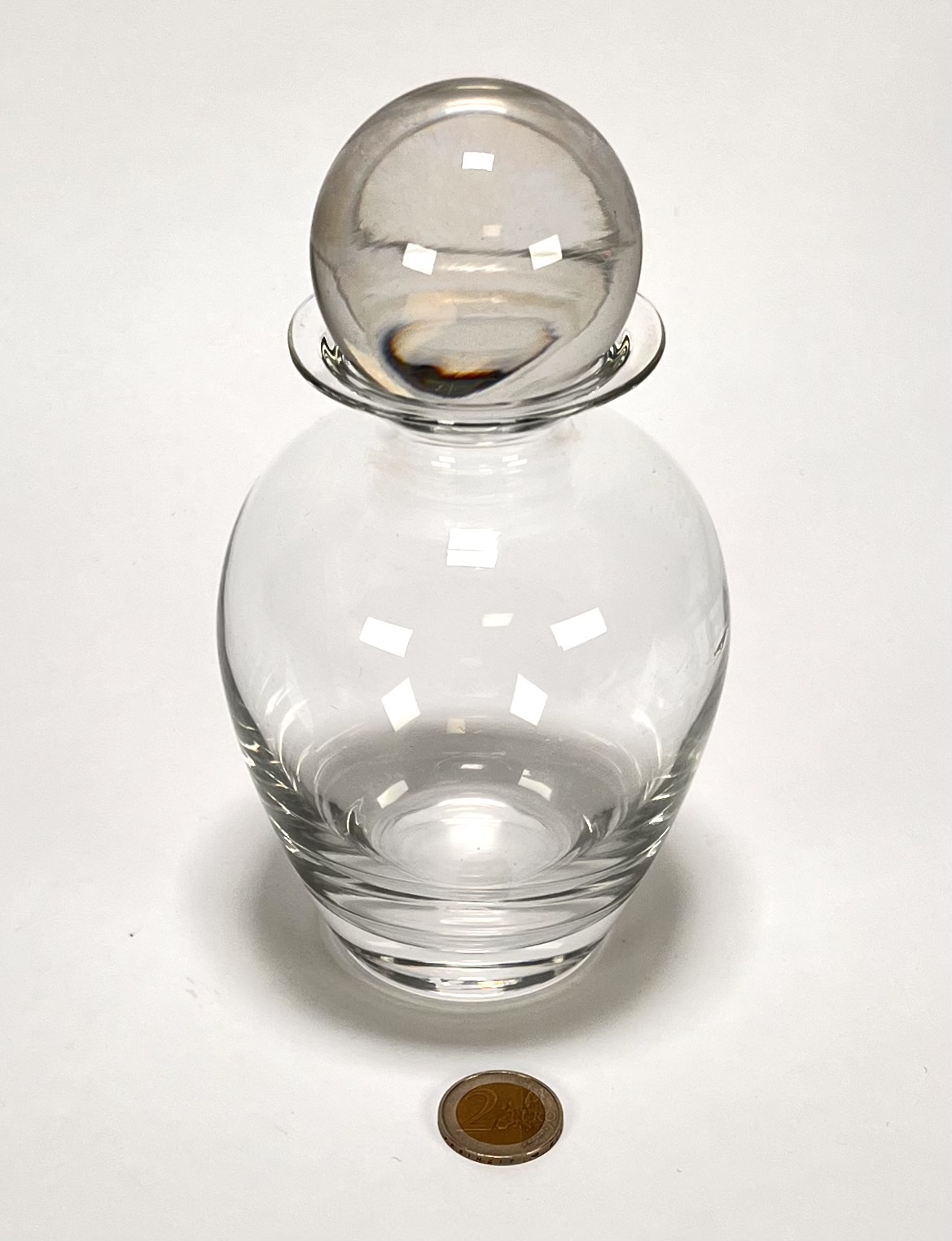 Art Deco likeurkaraf, model Rondo, naar ontwerp van Andries Dirk Copier (1901-1991) en uitgevoerd door Glasfabriek Leerdam 1935. Vervaardigd uit helderglas met bolvormige corpus en de bijbehorende massieve kristallen kogelstop. De onderzijde toont een geëtst monogram van de ontwerper. Geïnteresseerd? Bezoek onze kijkdagen op 10, 11 en 12 april van 11:00 tot 17:00 uur! |