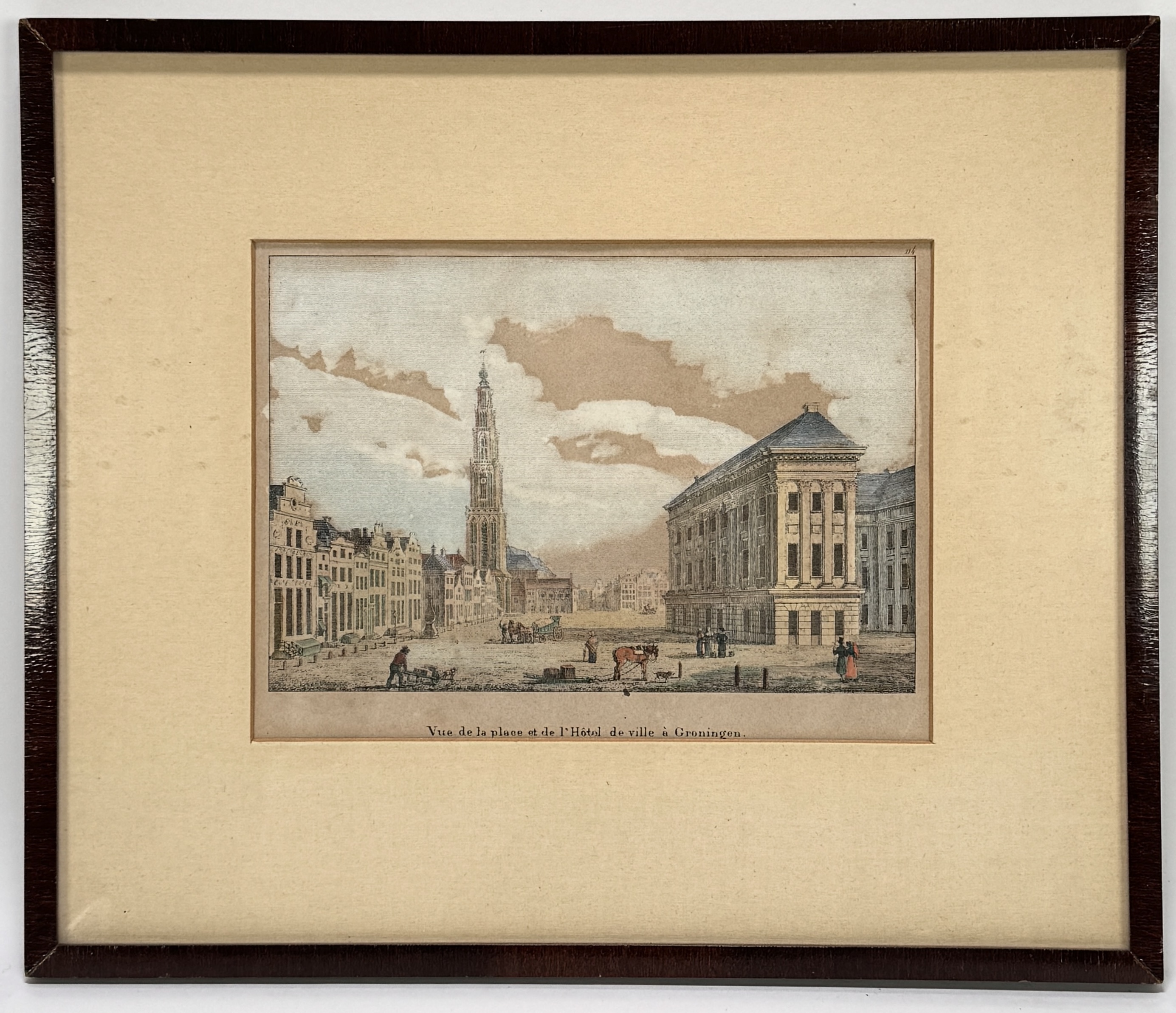 Litho door Jean Joseph de Cloet (1766–1855), handgekleurd op papier, toont de Grote Markt te Groningen met het stadhuis en de Martinitoren. De prent in romantische stijl, genummerd 114, en afkomstig uit het Voyage Pittoresque. Franstalig onderschrift onder de voorstelling. Klaar om te bieden? Registreer je nu en doe mee aan de veiling! |