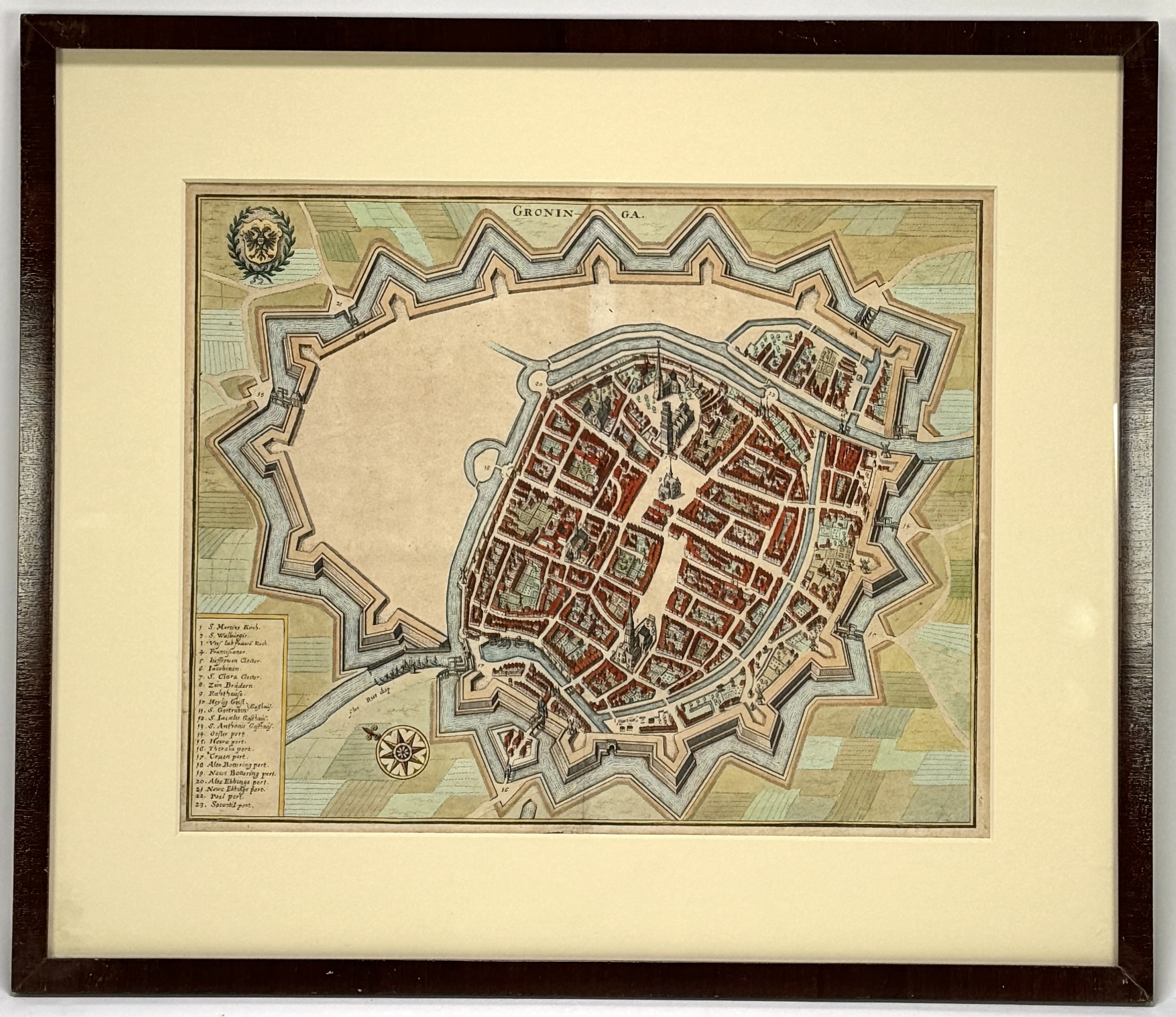 Kopergravure van Matthäus Merian (1593–1650) toont het stadsgezicht van Groningen (Groninga). Het vogelvluchtperspectief benadrukt de zeventiende-eeuwse vestingwerken en bastions. Links beneden bevindt zich een legenda met drieëntwintig referentiepunten en een windroos. De hand ingekleurde kopergravure dateert uit circa 1645 en heeft een Duitse herkomst. Geïnteresseerd? Bezoek onze kijkdagen op 10, 11 en 12 april van 11:00 tot 17:00 uur! |
