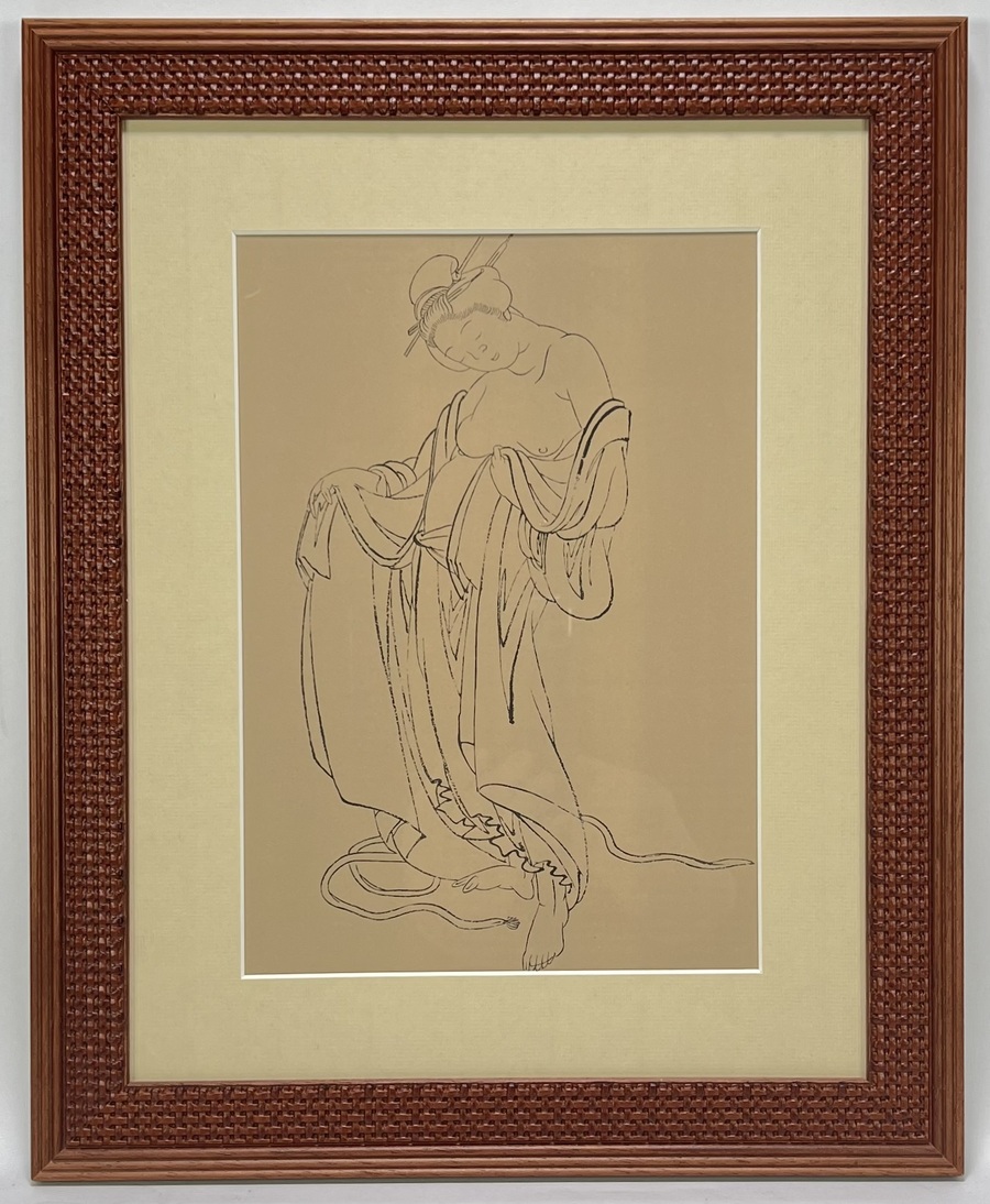 Litho door Katsushika Hokusai (1760–1849) toont een staande vrouw in Ukiyo-e stijl, uitgevoerd in lithografie op papier. De voorstelling is een postume druk naar een gewassen inkttekening uit 1810. De vloeiende lijnvoering benadrukt de elegante houding van de vrouw. Het werk heeft een Japanse herkomst en is gevat in een lijst met vlechtwerkdecoratie en een passe-partout. Wil je direct deelnemen? Plaats vanaf 3 april alvast een schriftelijk bod via onze website! |