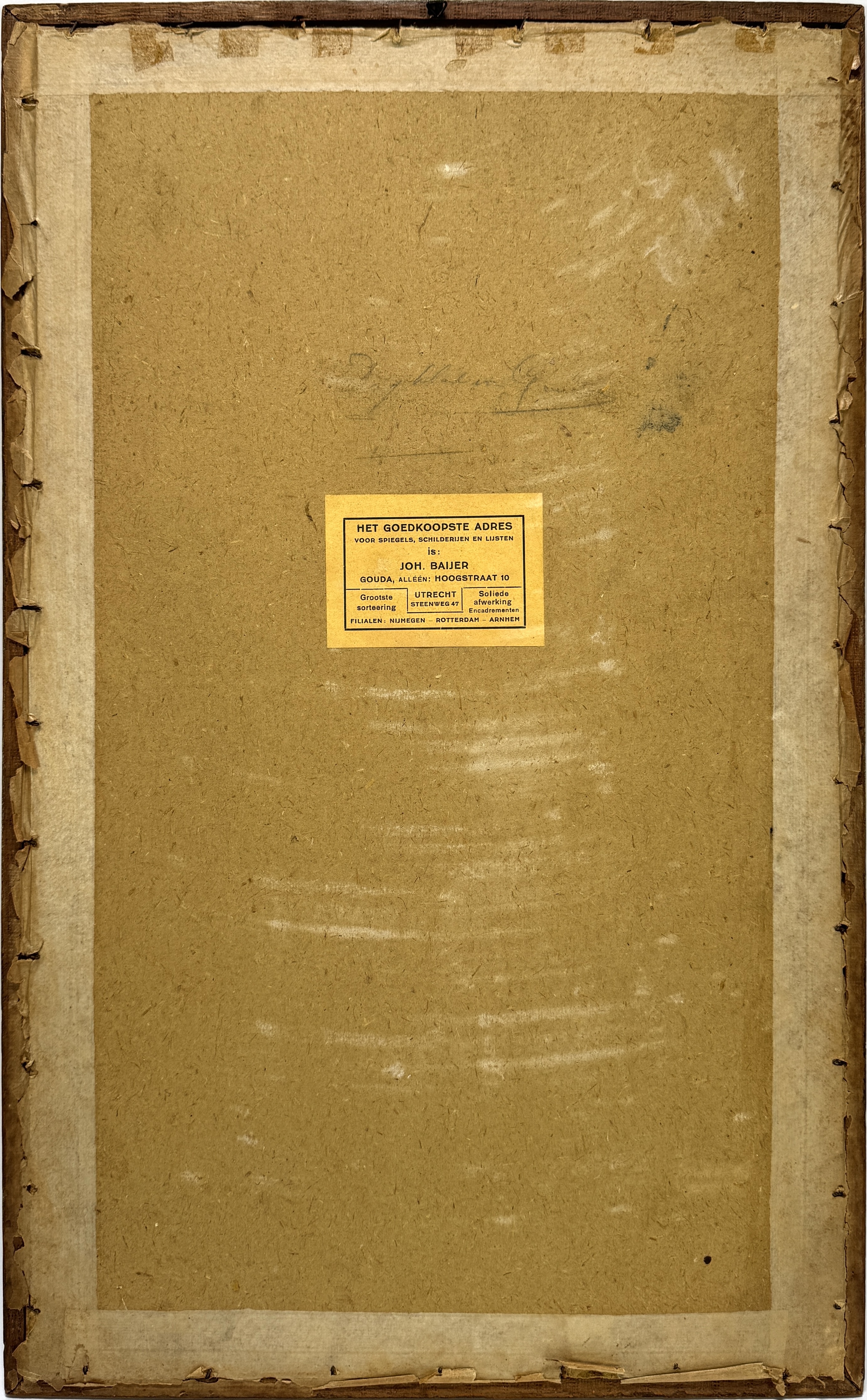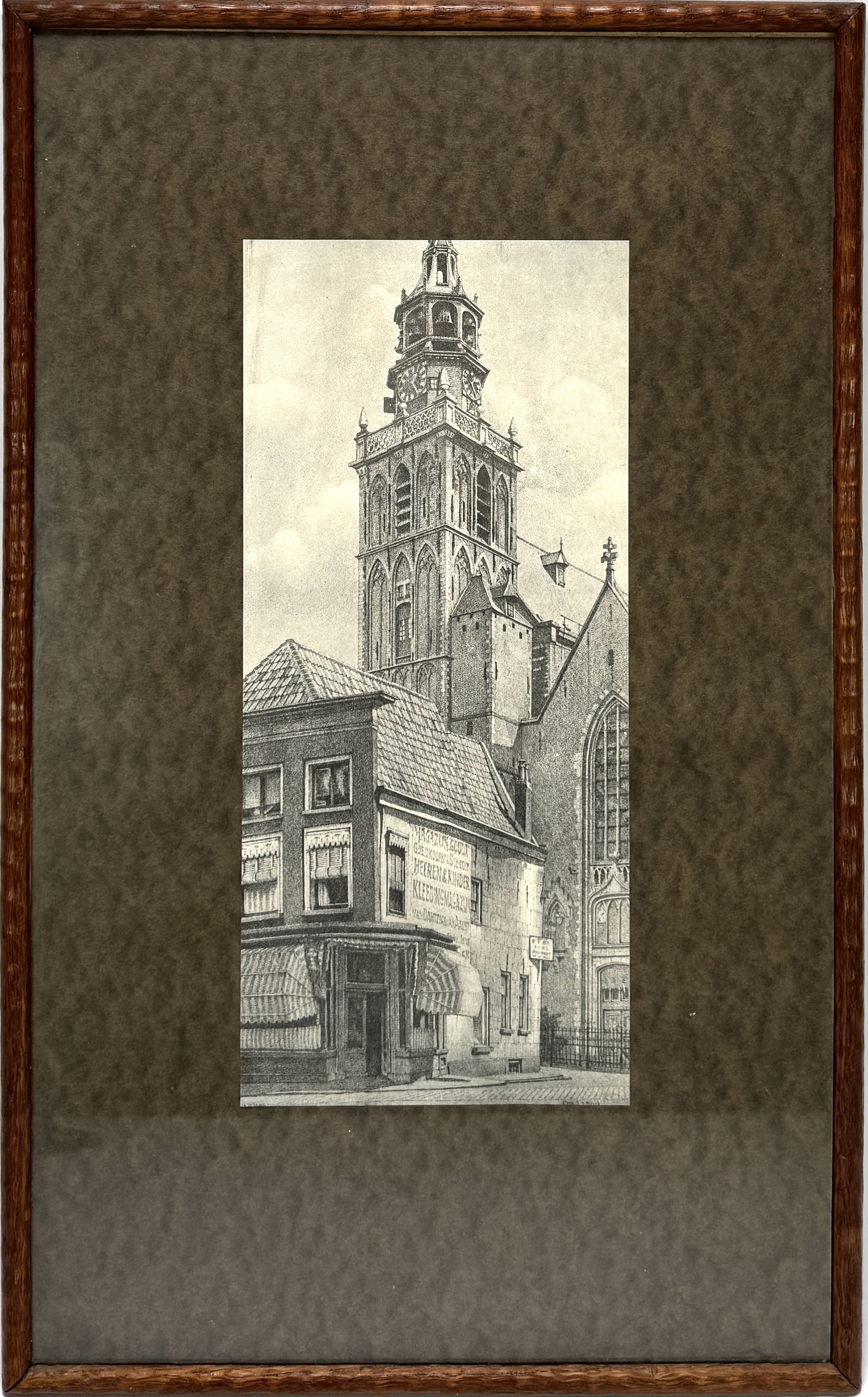 Prent vervaardigd uit drukinkt op papier met fotomechanische rasterdruk. Afgebeeld is de kerktoren in Gouda, centraal geplaatst met omliggende stedelijke bebouwing en gotische architectuurdetails. Rechtsonder onduidelijk gesigneerd en linksonder klein (onduidelijk) gedateerd. Het werk dateert uit de 20e eeuw Wil je direct deelnemen? Plaats vanaf 3 april alvast een schriftelijk bod via onze website! |