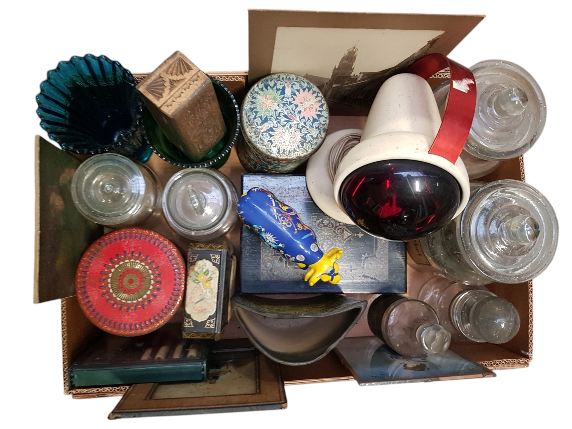 Lot curiosa van diverse fabrikanten vervaardigd uit materialen als glas, polychroom blik en gesneden hout. De verzameling omvat onder andere een vintage infraroodlamp, diverse apothekersflessen, lithografisch bedrukte verzamelblikken en een houten doosje met geometrisch reliëfsnijwerk. De voorwerpen dateren uit de periode 1920-1970 en hebben een Europese herkomst. Kom langs tijdens de kijkdagen (10 t/m 12 april) en ontdek dit kavel zelf! |