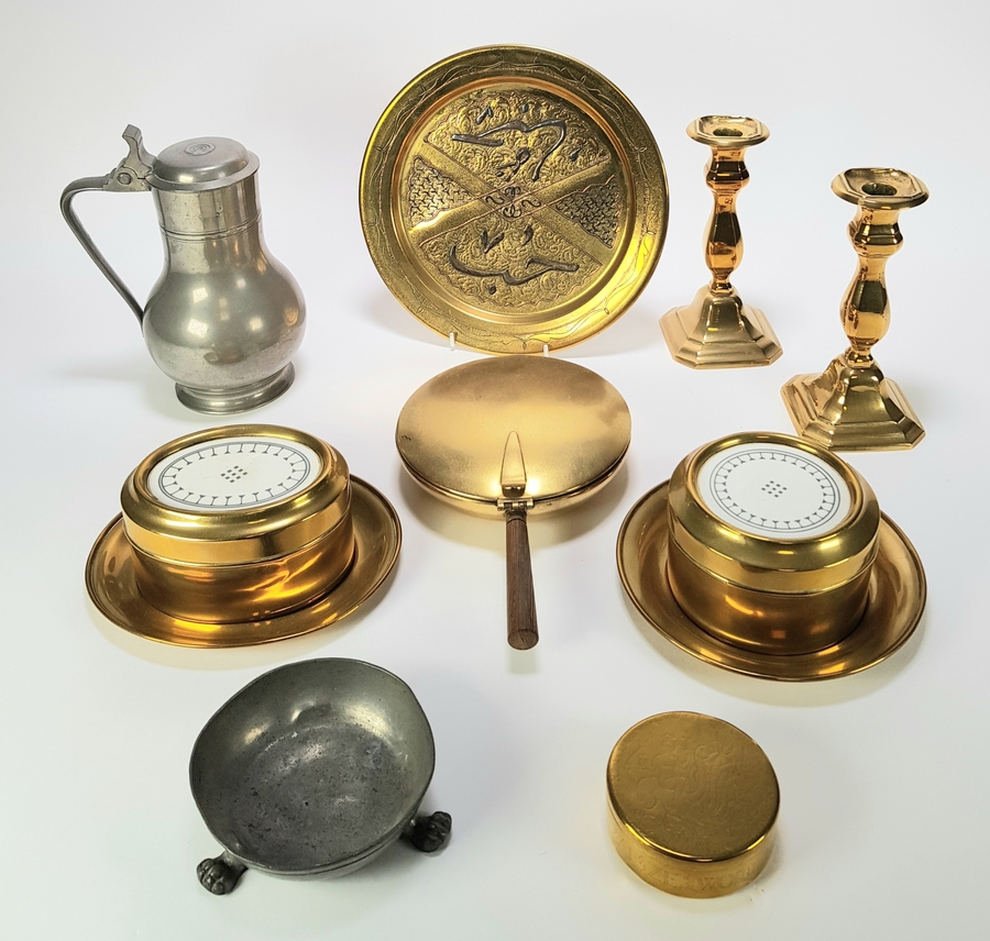 Gebruiksvoorwerpen van diverse makers waaronder Meeuws & Zoon, vervaardigd uit tin en messing met gedreven decoraties. Het lot bestaat onder andere uit een tinnen kan, een oosters bord, twee messing trommels en twee kandelaren. De voorwerpen dateren uit de 19e/20e eeuw. Deze verzameling zelf beoordelen? Je bent welkom op onze kijkdagen op 10, 11 en 12 april! |