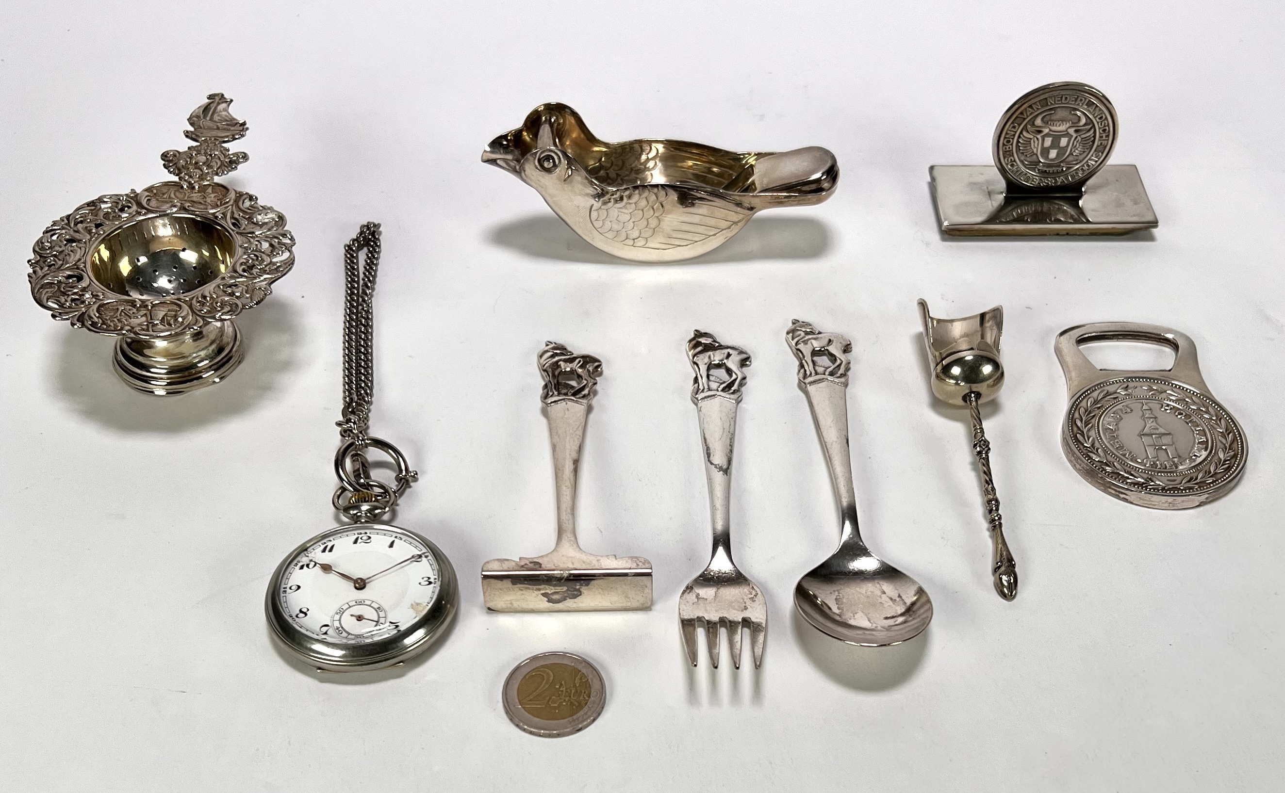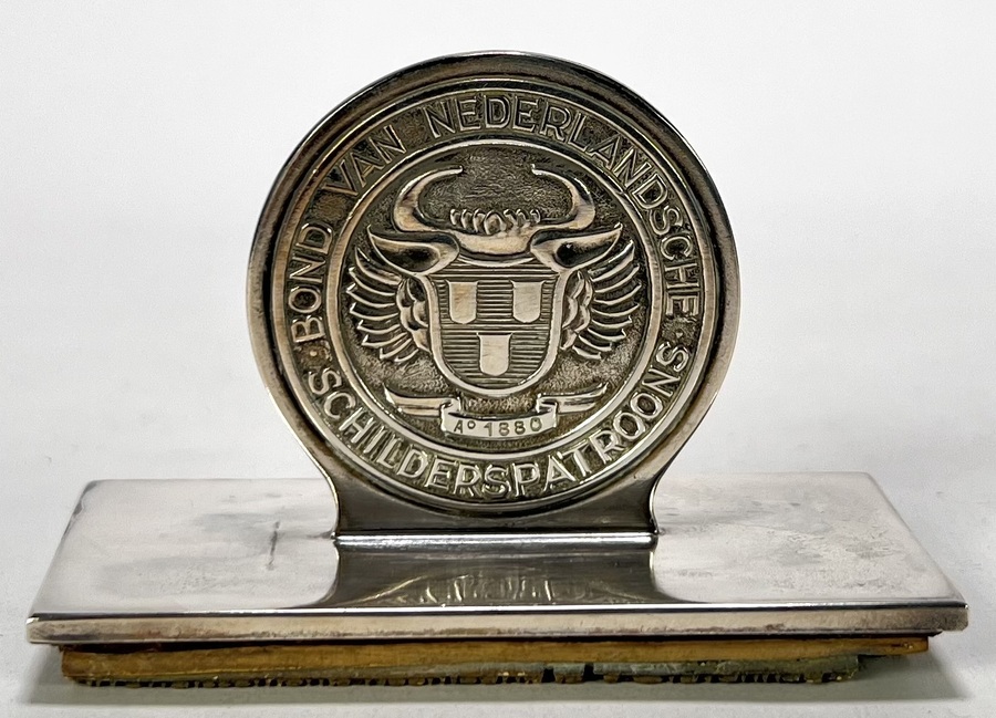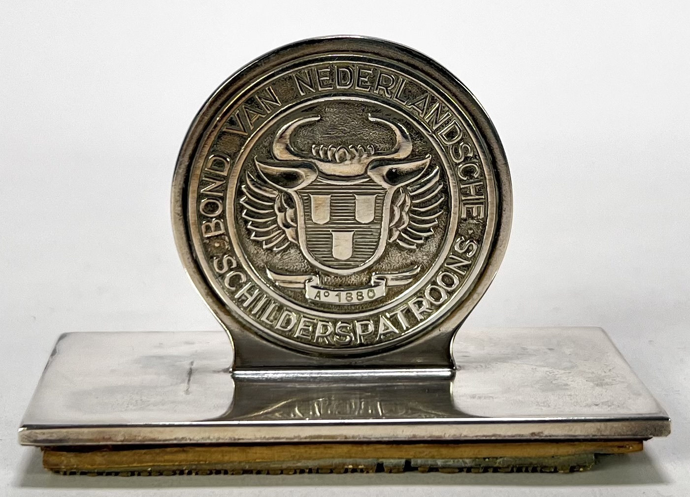 Lot pleet met onder meer een stempel met reliëf tekst ‘Bond van Nederlandsche Schilderspatroons’, een opengewerkt theezeefje, een glas met zilveren voet, kinderbestek met dierfiguren, fotolijstjes, een zakhorloge, een dienblad, tafelgerei en poederdoos. Het lot dateert uit de 20e eeuw en heeft een West-Europese herkomst. Wil je direct deelnemen? Plaats alvast een schriftelijk bod via onze website! |