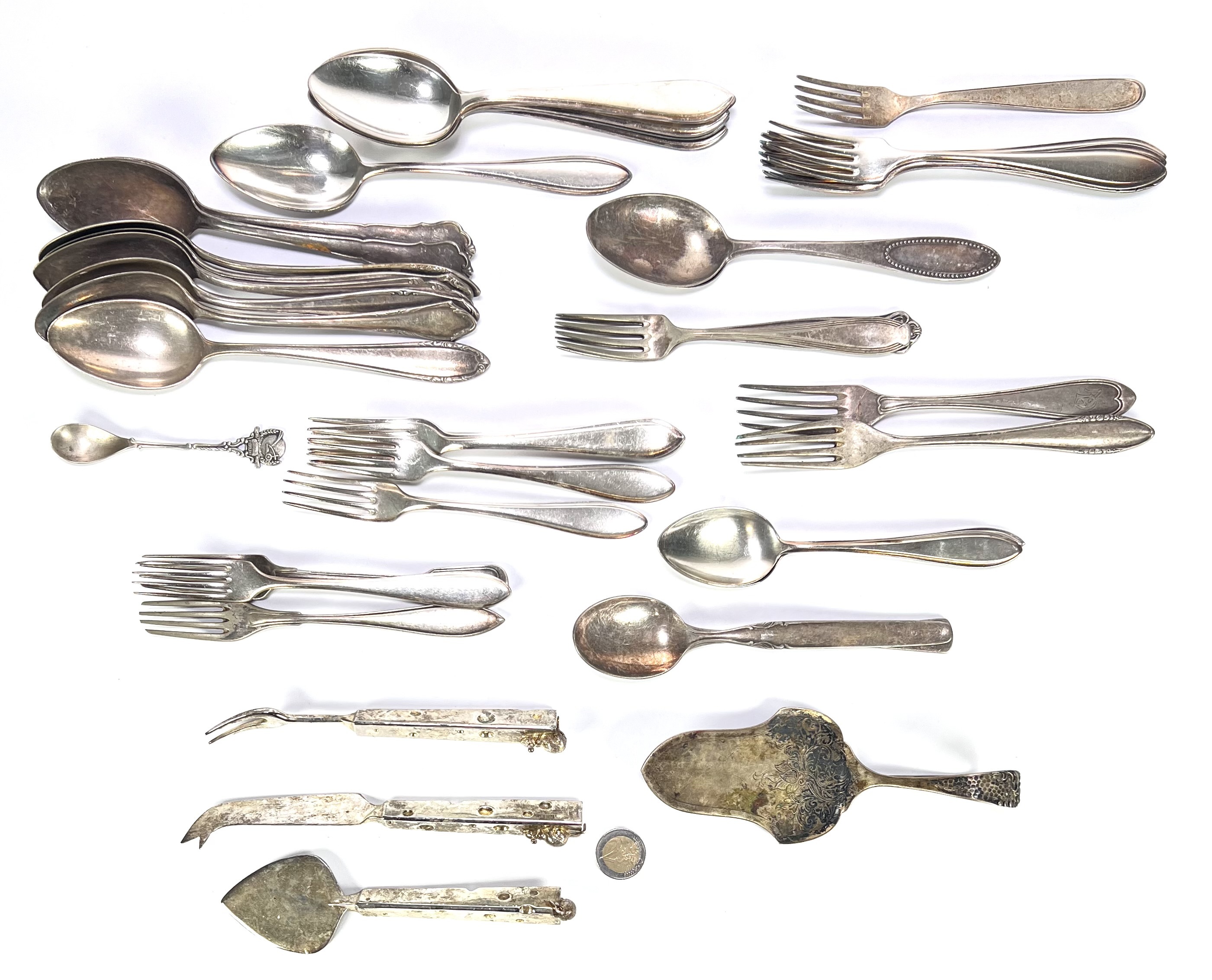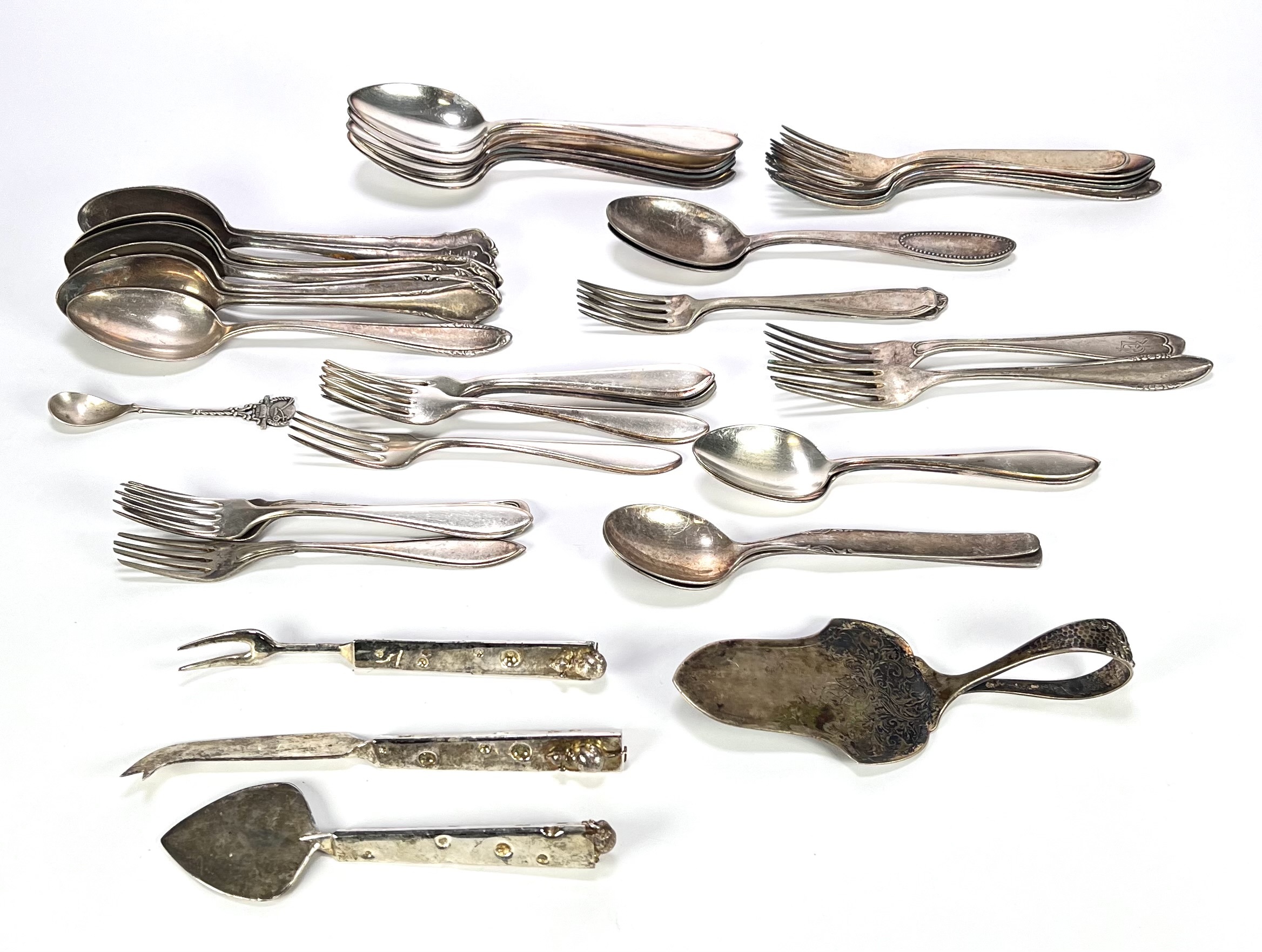Lot tafelbestek in eclectische stijl, vervaardigd uit verzilverd metaal met gestanste en gegraveerde afwerking. De samengestelde partij bestaat uit tafel- en dessertlepels, vorken en enkele serveeronderdelen met uiteenlopende heften, waaronder parelrand-, filetrand- en gladde modellen. Het geheel dateert uit de 19e eeuw en eerste helft van de 20e eeuw en heeft een West-Europese herkomst. Geïnteresseerd? Bezoek onze kijkdagen van 11:00 tot 17:00 uur. |
