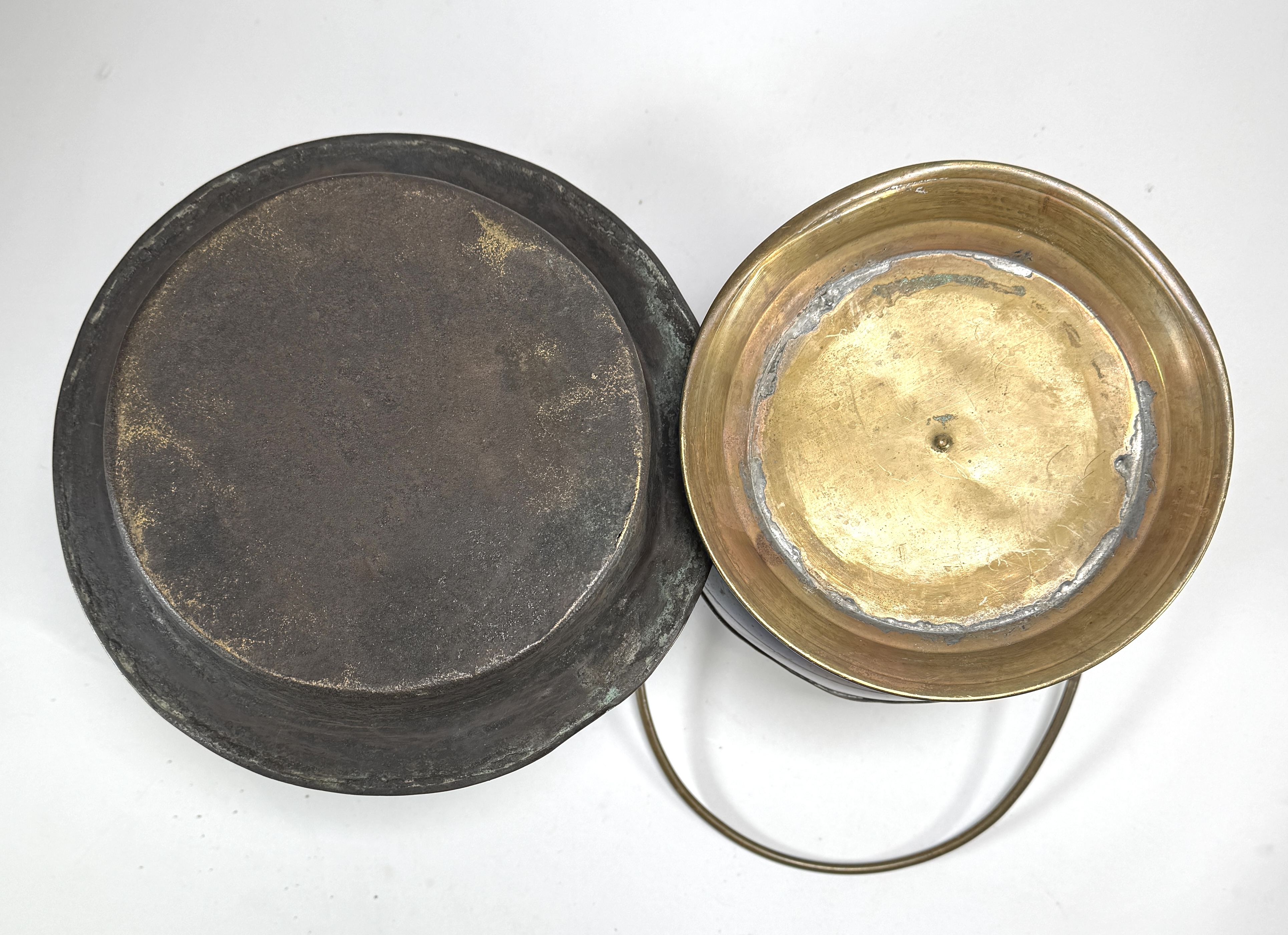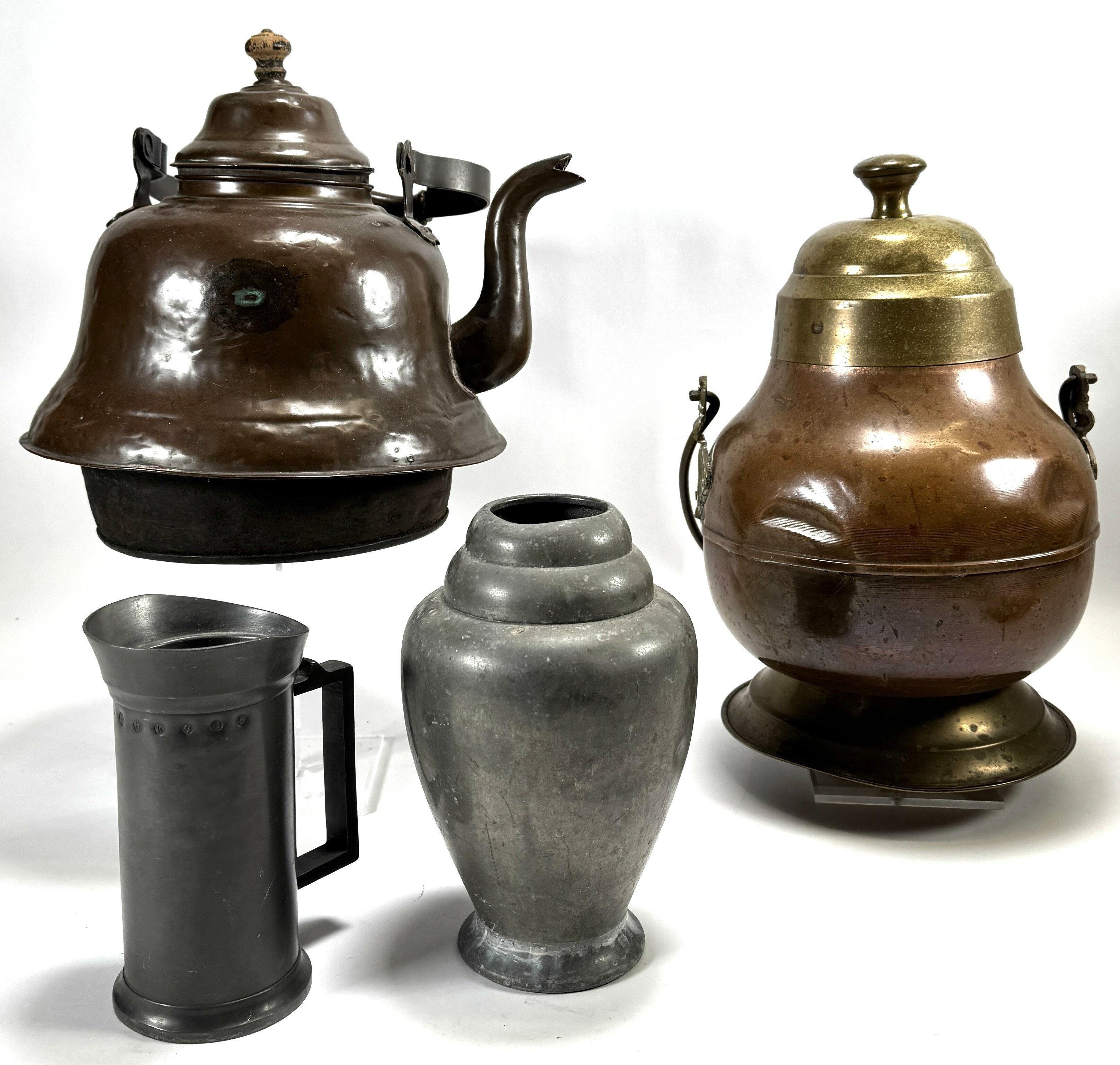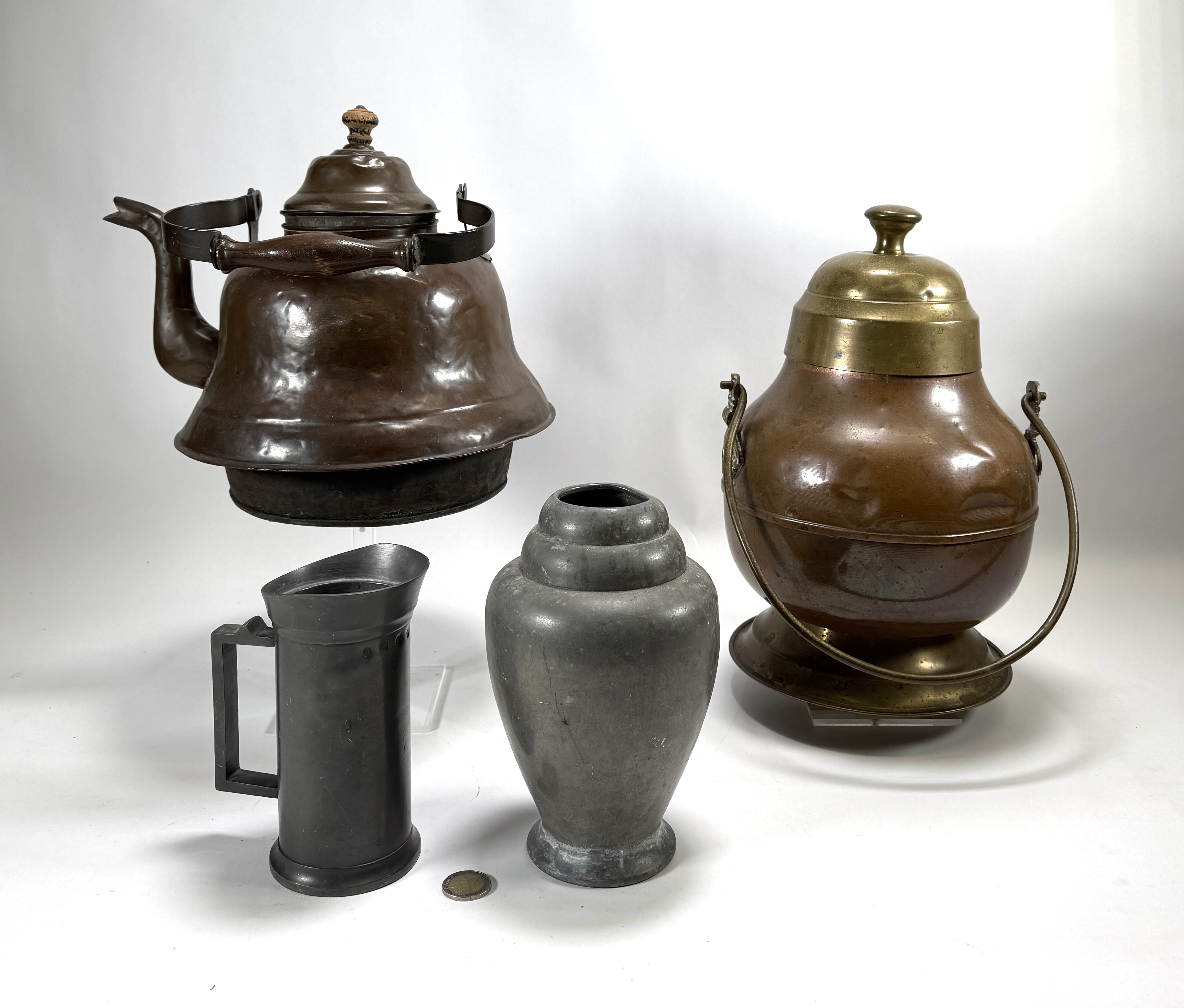 Selectie koperen en tinnen objecten bestaande uit een roodkoperen ketel, een doofpot met messing deksel, een Art Deco vaas van Rio Tiel en een tinnen maatkan. De vaas uit de Art Deco periode toont een karakteristiek getrapt profiel. De overige stukken zijn traditionele gebruiksvoorwerpen uit de 19e en vroege 20e eeuw, vervaardigd via drijf- en gietwerk. De maatkan draagt diverse ijkmerken. Nederlandse herkomst. Zeker zijn van deelname? Plaats vanaf 3 april een schriftelijk bod online! |