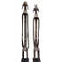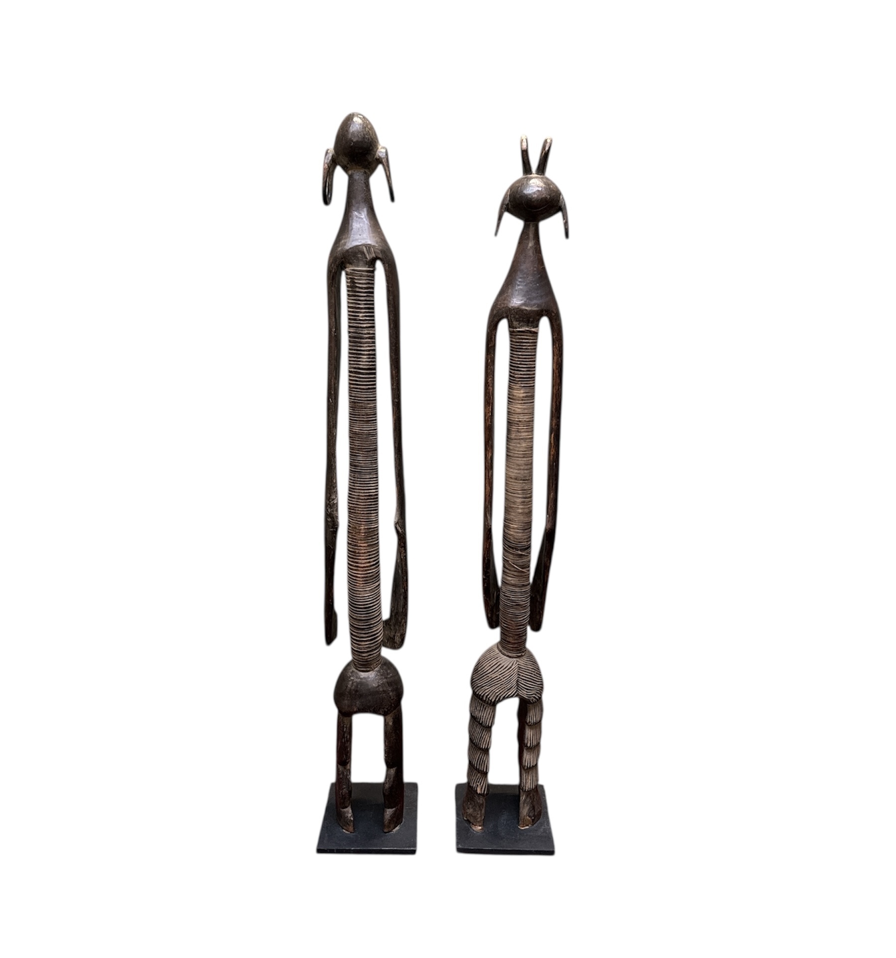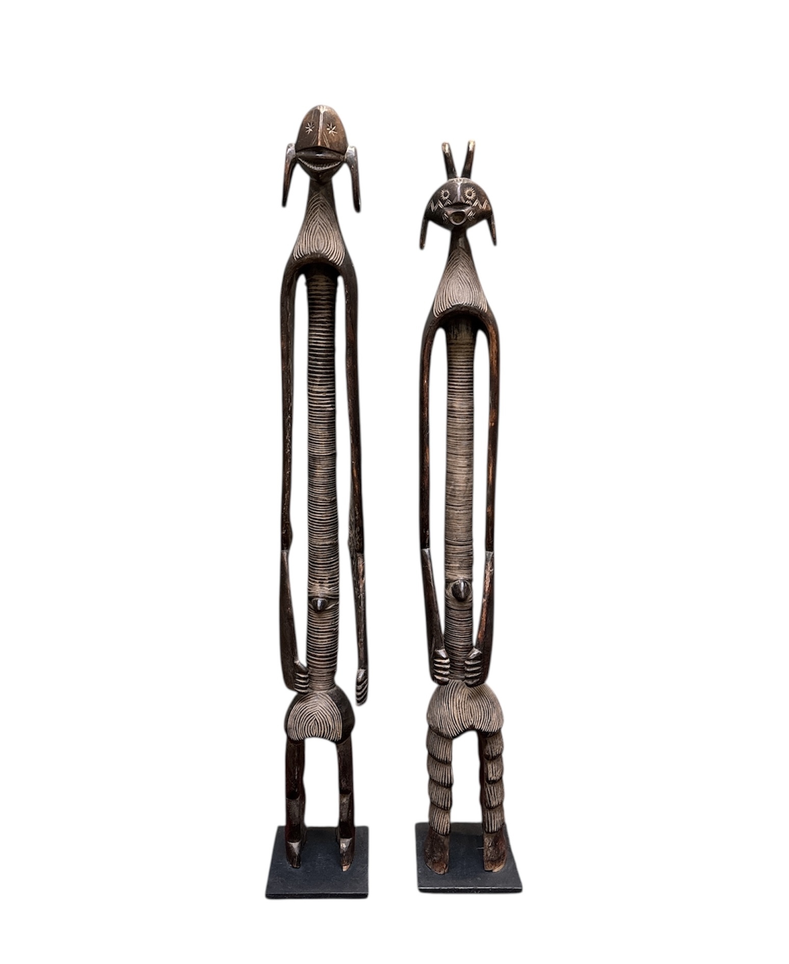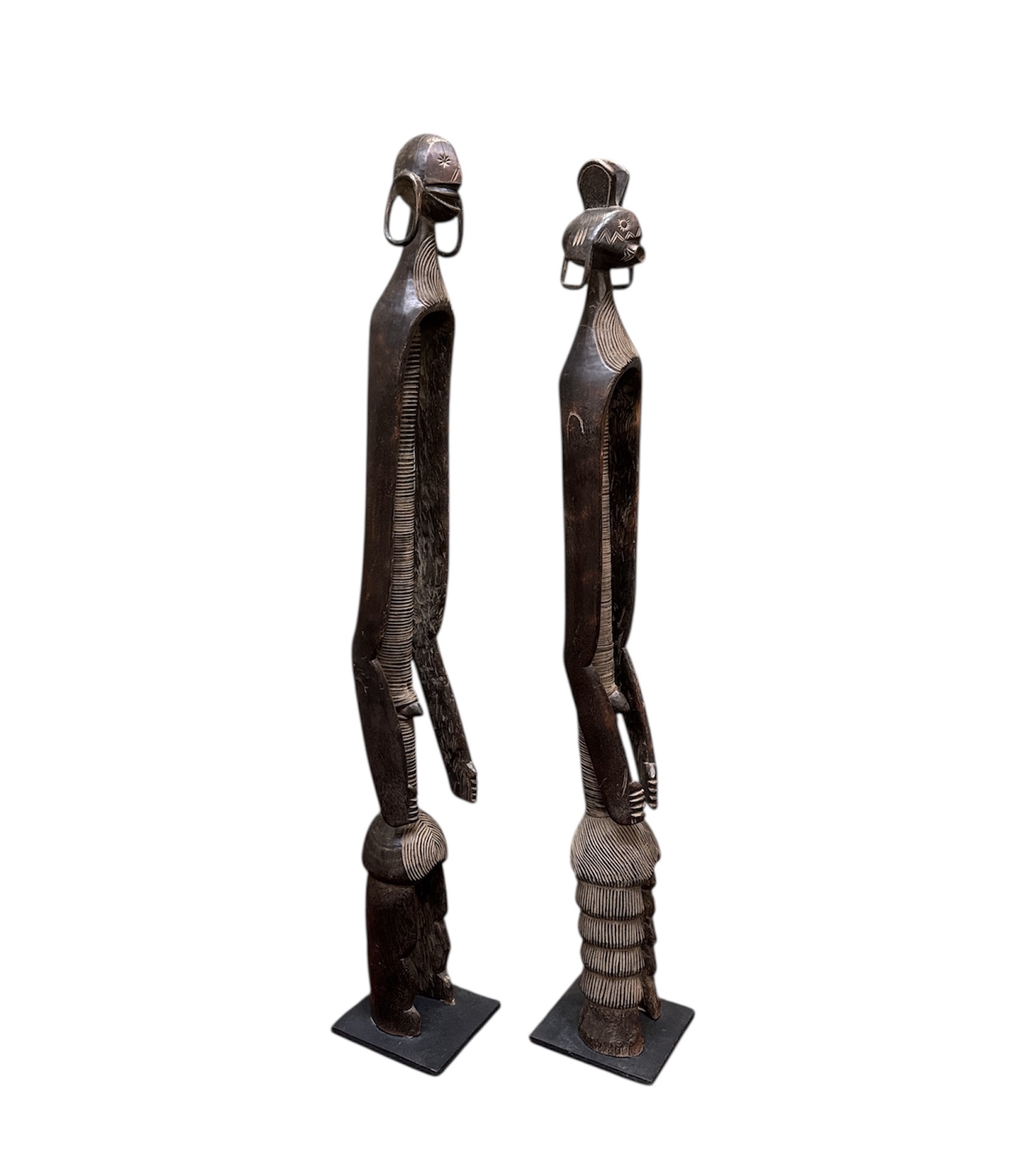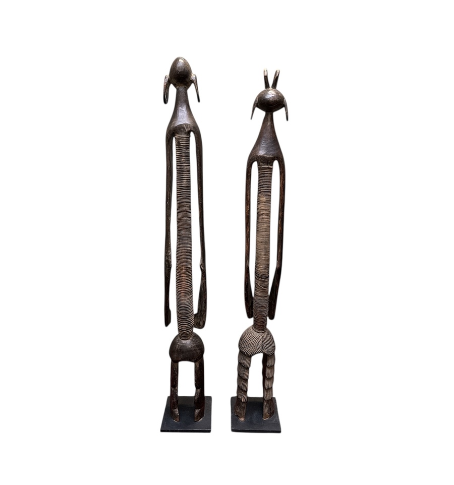 Twee beelden van het Mumuye volk Nigeria in tribale stijl, vervaardigd uit gesneden hardhout met een donker patina. De twee figuren tonen de karakteristieke geabstraheerde en uitgerekte vormgeving, waarbij de torso's zijn voorzien van opengewerkt snijwerk en geometrische patronen. Deze antropomorfe beelden fungeren traditioneel als beschermgeesten en dateren uit de tweede helft van 20e eeuw. Groot formaat beelden. Kom langs tijdens de kijkdagen en ontdek deze beelden zelf. |