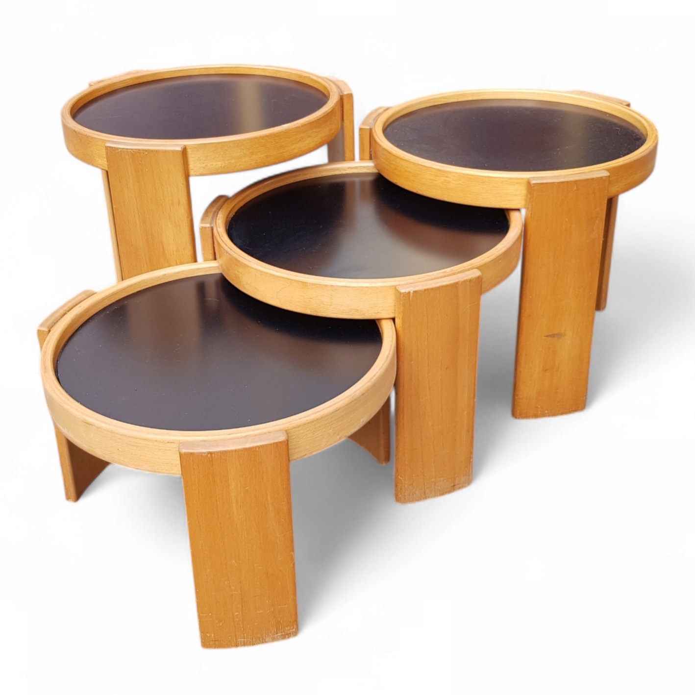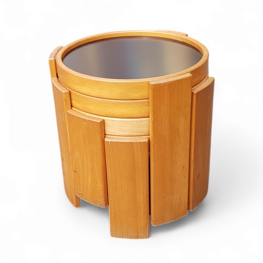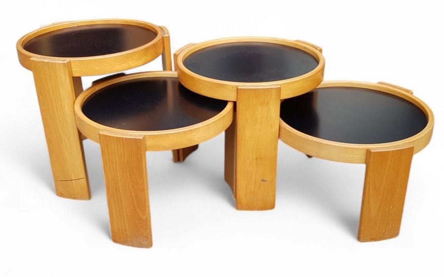 Nest bijzettafels van Gianfranco Frattini (1926–2004) voor Cassina uit de Mid-century modern periode, vervaardigd uit eikenhout met omkeerbare bladen in zwart laminaat. De vier ronde tafels vormen in geneste toestand een compacte cilindrische eenheid. Voorzien van origineel fabrieksmerk aan de binnenzijde, de bijzettafels dateren uit circa 1970, Italiaanse herkomst. Deze bijzettafels zelf beoordelen? Je bent welkom op onze kijkdagen op 10, 11 en 12 april! |