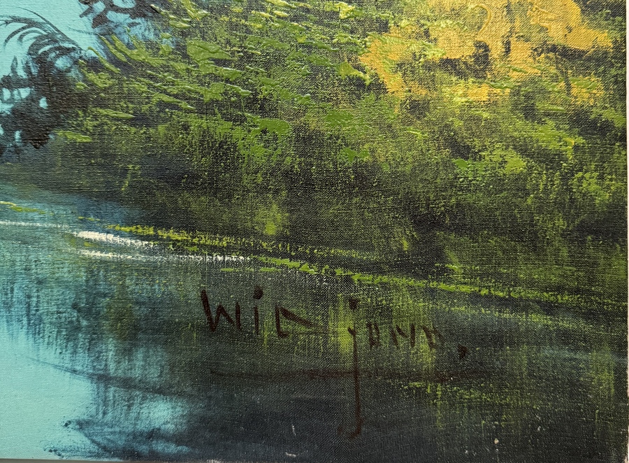 Schilderij toont een tropisch landschap met rijstterrassen en palmbomen, uitgevoerd in impressionistische stijl in olieverf op doek. De compositie is horizontaal opgebouwd met een centrale bergpartij op de achtergrond en een luchtpartij. Rechtsonder onduidelijk gesigneerd, het werk dateert uit de tweede helft van de 20e eeuw en heeft een Indonesische herkomst. Klaar om te bieden? Registreer je nu en doe mee aan de veiling! |