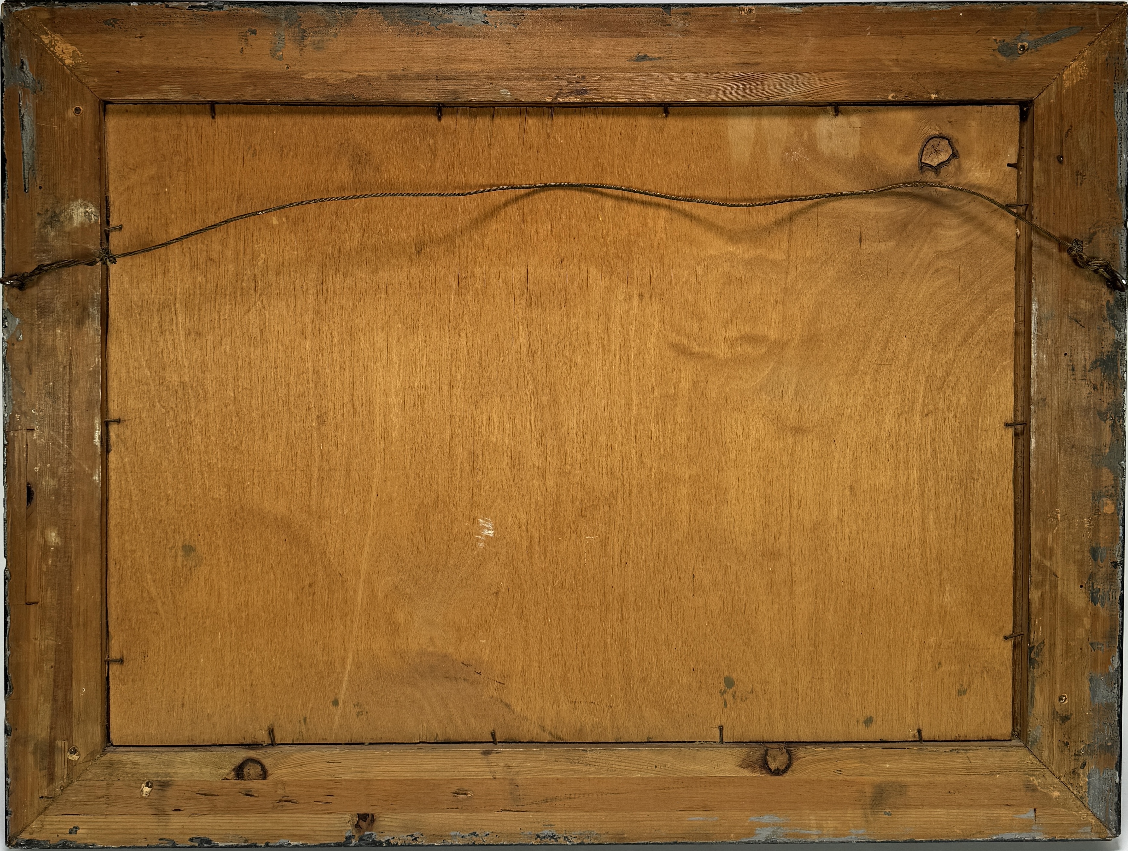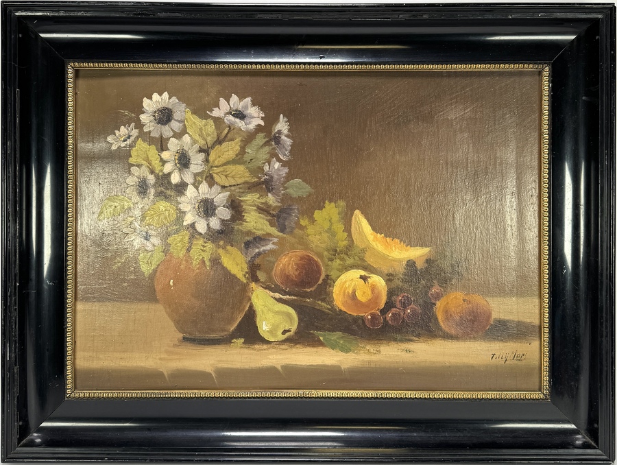 Schilderij door Tilly Moes (1899-1979) toont een stilleven met een aardewerken vaas met margrieten, gecombineerd met perzik, peer, druiventros en meloenschil in academisch-realistische traditie, uitgevoerd in olieverf op paneel. De horizontale opbouw en het gedempte palet van oker, bruin en olijfgroen bepalen het beeld. Gesigneerd rechtsonder, het werk dateert uit het midden van 20e eeuw. Klaar om te bieden? Registreer je nu en doe mee aan de veiling! |