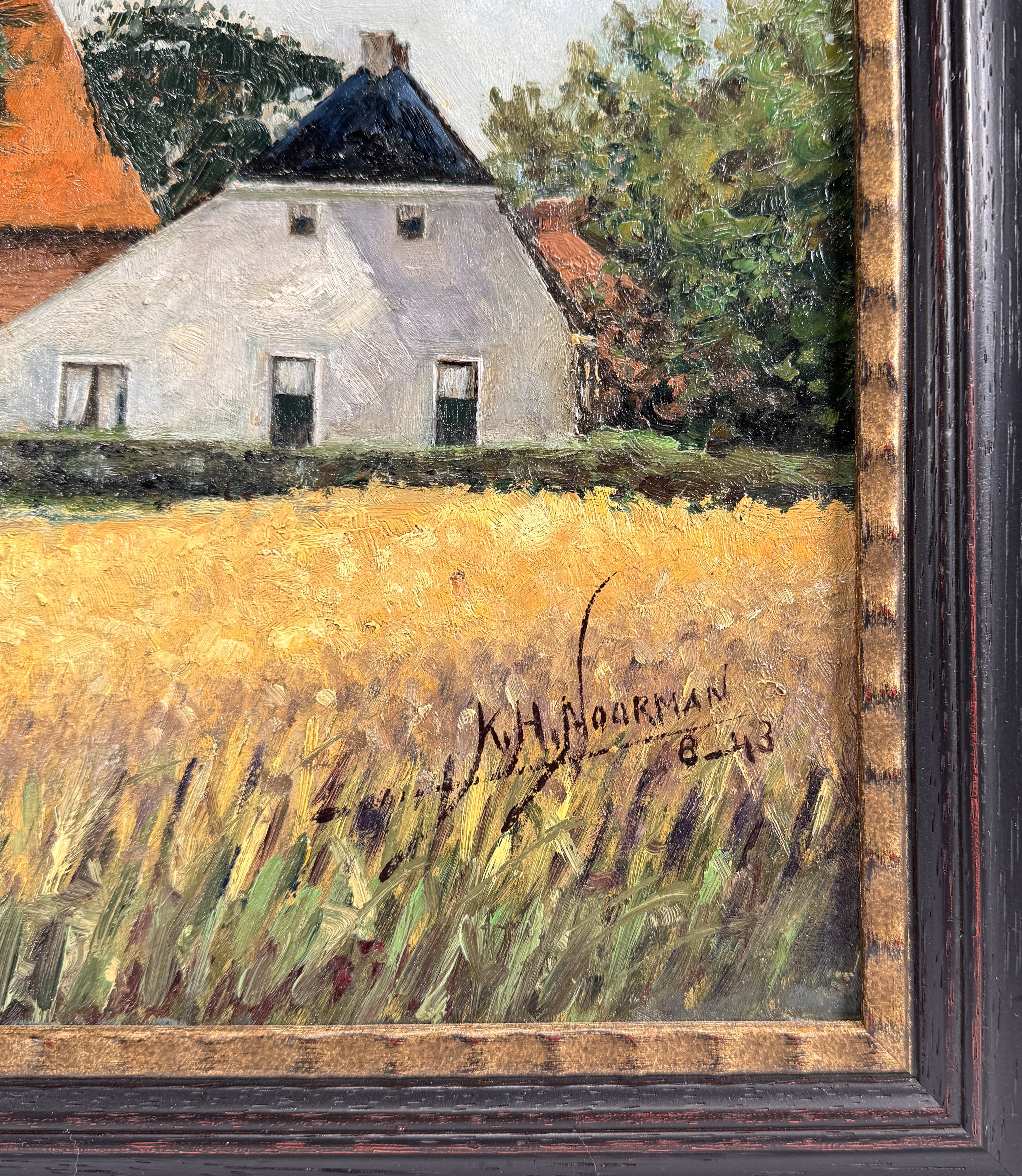 Schilderij door K.H. Noorman toont de Hervormde Kerk van Oostum, met witgepleisterd woonhuis in realisme, uitgevoerd in olieverf op doek. Rechtsonder gesigneerd en gedateerd augustus 1943. Het werk heeft een Noord-Nederlandse herkomst en zit in een zwarte houten lijst met goudkleurige binnenrand. Geïnteresseerd? Bezoek onze kijkdagen op 10, 11 en 12 april van 11:00 tot 17:00 uur! |