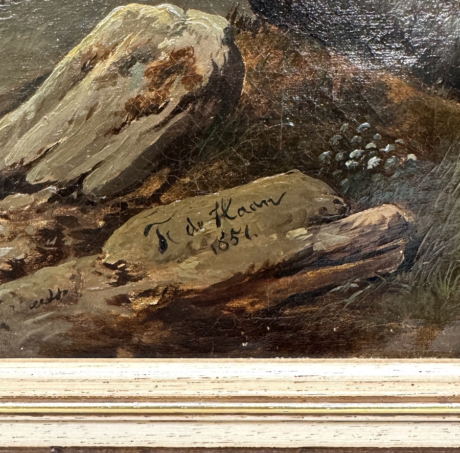 Schilderij door Franciscus Antonius de Haan (1823–1873) toont een rivierlandschap met vee en wandelaars in Nederlandse romantische stijl, uitgevoerd in olieverf op doek. Het werk is rechtsonder op een steen gesigneerd en gedateerd 1851. Het bevindt zich in een goudkleurige lijst met klassiek profiel. Geïnteresseerd? Bezoek onze kijkdagen van 11:00 tot 17:00 uur! |