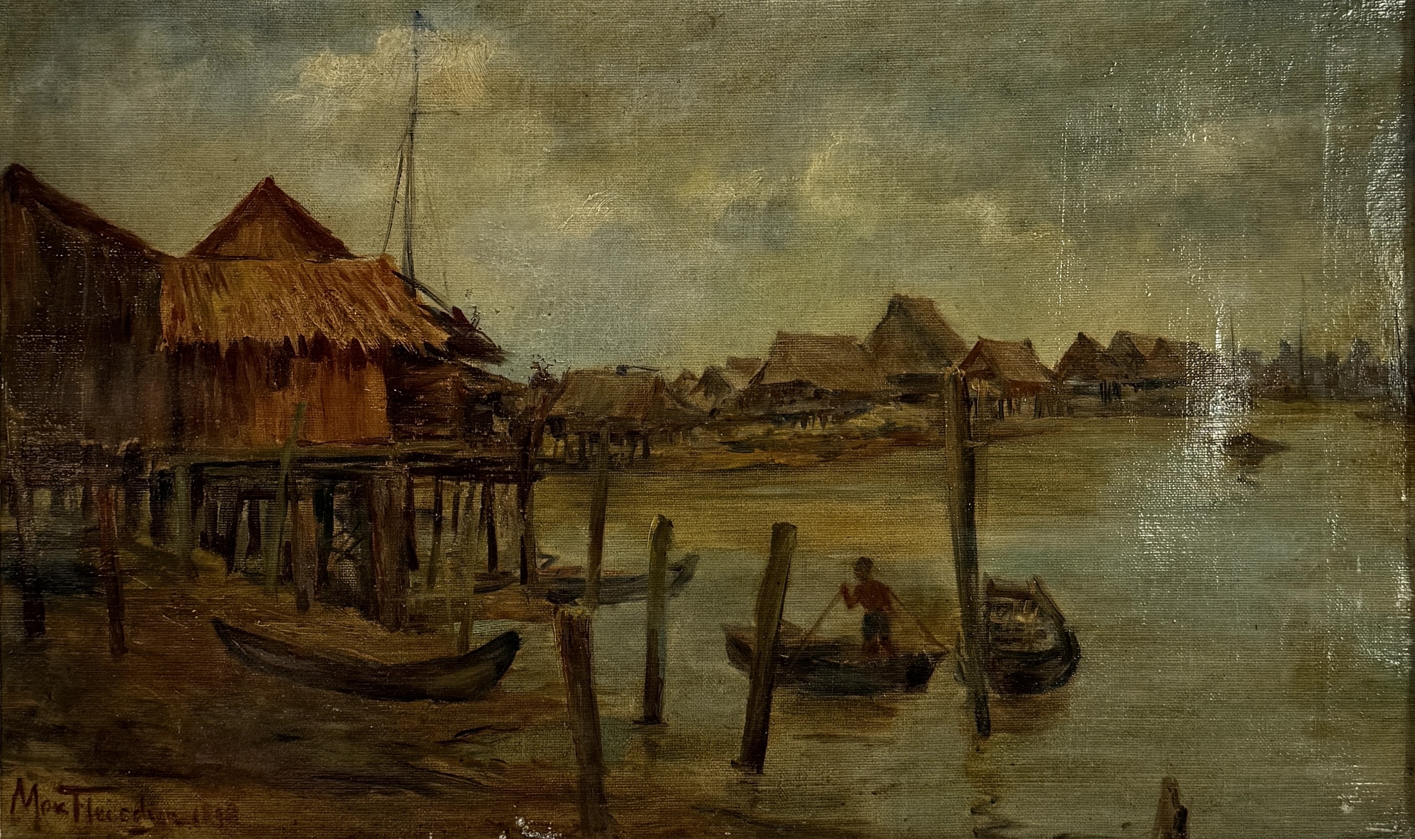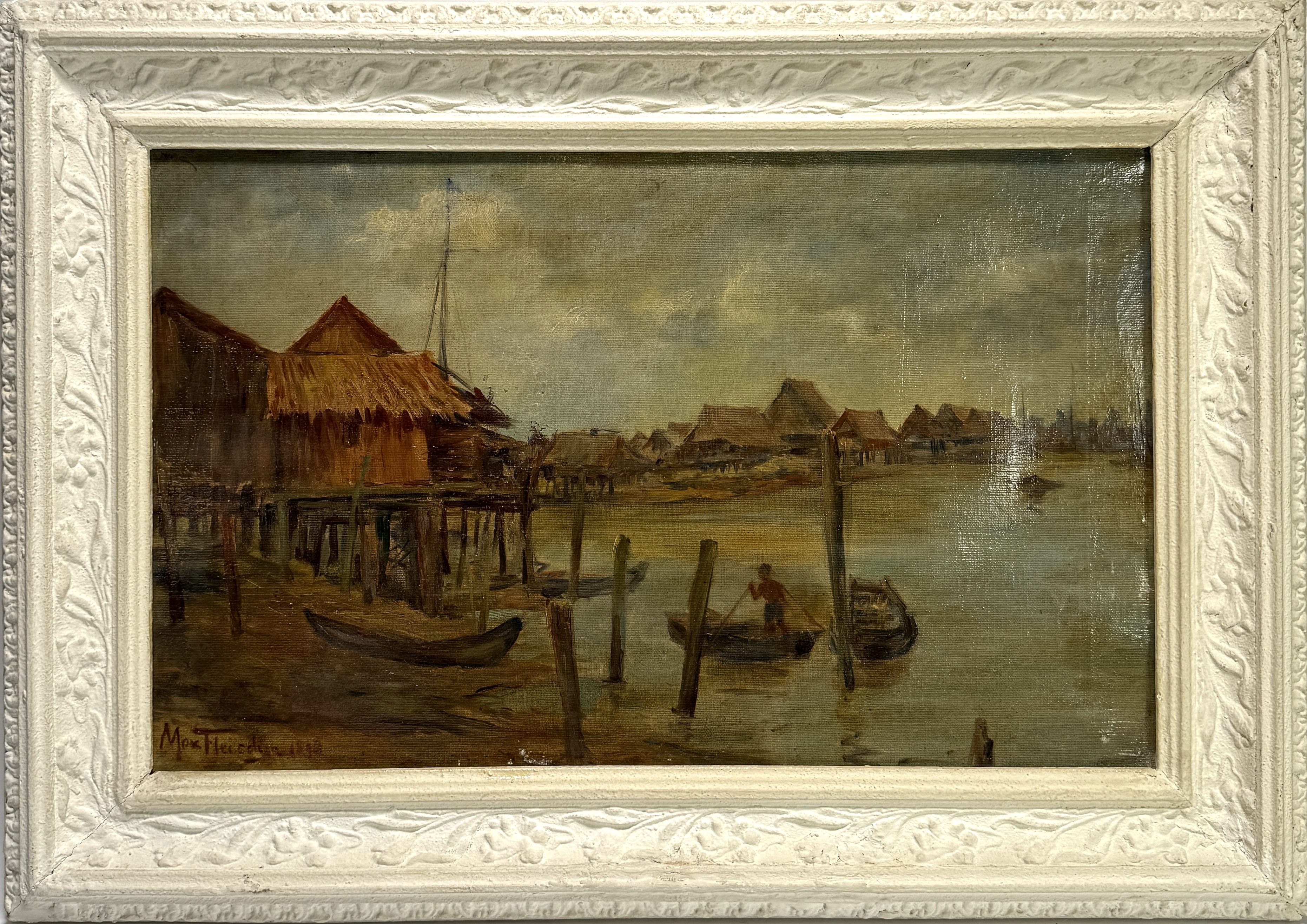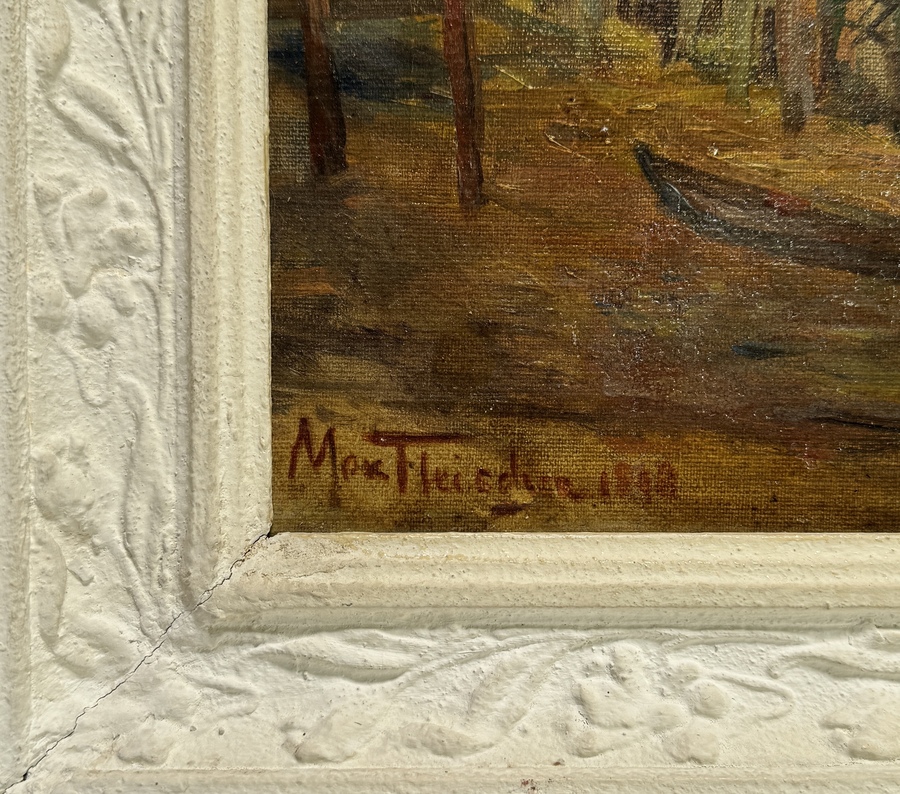 Schilderij door Max Fleischer (1861-1930) toont een boslandschap met beek en een hut in realistische stijl, uitgevoerd in olieverf op doek. Het werk is linksonder gesigneerd en gedateerd 1898, herkomst Duitsland. De compositie kenmerkt zich door een gedetailleerde weergave van de natuur en lichtinval tussen de bomen. Dit werk bevindt zich in een witte lijst. Kom langs tijdens de kijkdagen en ontdek dit schilderij zelf! |