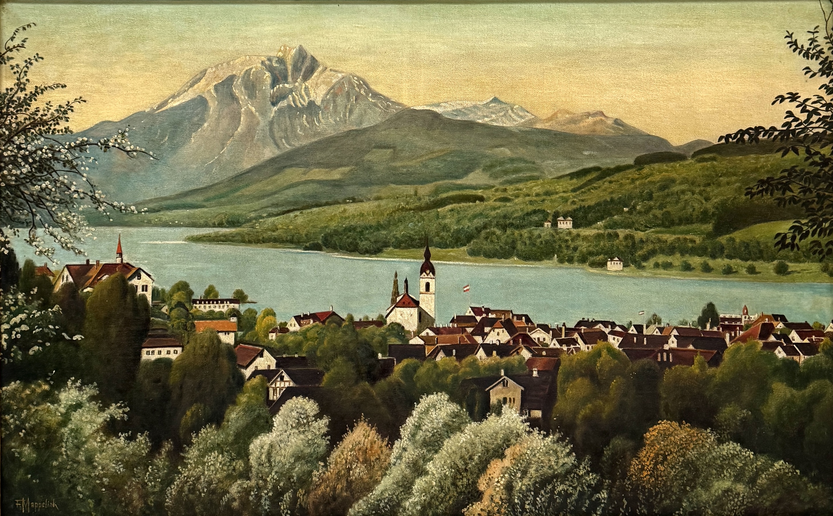 Schilderij door Frits Meppelink (1878–1959) toont een panoramisch Alpengezicht op een meer met een stad in academisch realisme, uitgevoerd in olieverf op doek. Met gedetailleerde weergave van de architectuur en atmosferische lichtval op de besneeuwde bergtoppen. Linksonder gesigneerd, het werk dateert uit circa 1920 en is gepresenteerd in een rijk gedecoreerde goudkleurige lijst. Eerst dit schilderij zien voordat je biedt? Bezoek onze kijkdagen op 10, 11 en 12 april! |