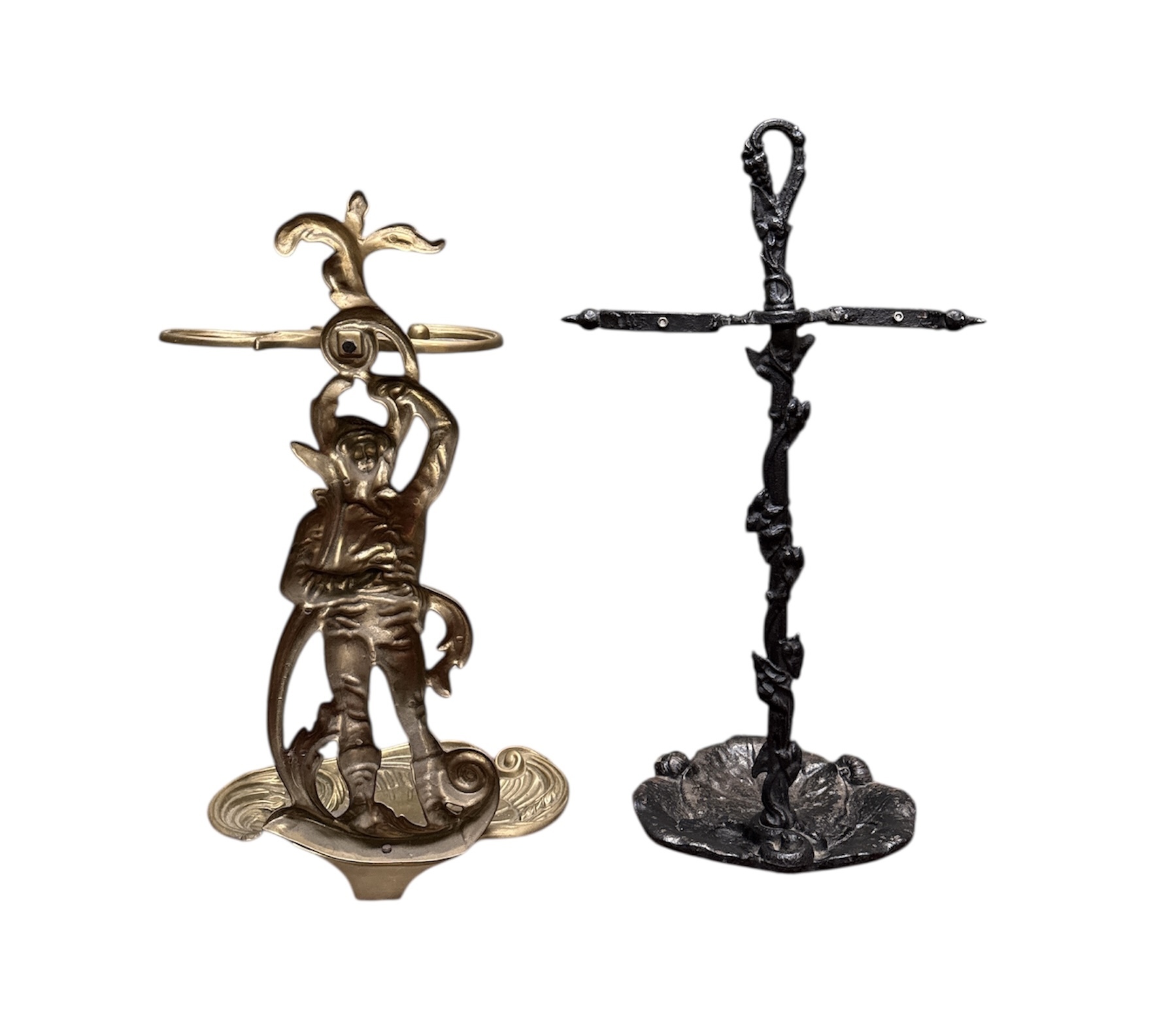 Paraplustandaards vervaardigd uit messing en ijzer met gegoten en gesmede techniek. Het paar bestaat uit twee ongelijkvormige exemplaren: een gegoten messing standaard met figurale jongeman, florale opbouw en geïntegreerde lekbak en een smeedijzeren standaard met getorste stam, bladmotieven, dwarsarmen en bloemvormige voet. Het geheel dateert uit de tweede helft van de 19e eeuw en heeft een West-Europese herkomst. Zeker zijn van deelname? Plaats vanaf 3 april een schriftelijk bod online! |
