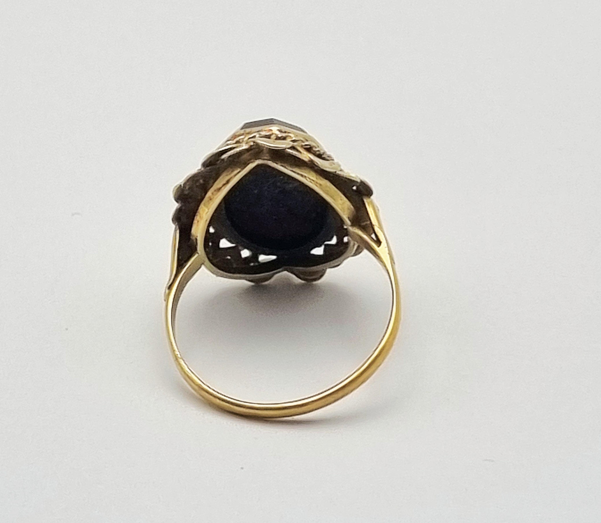 Ring getoetst 14 karaat goud, met ovaal geslepen granaat in gesloten zetting, geplaatst in een opengewerkte kop met getorste draadrand, geschulpte entourage en slanke scheen. De steen, de verhoogde montage en het decoratieve montuur geven het model een traditioneel accent. Datering 20 eeuw. Klaar om te bieden? Registreer je nu en doe mee aan de veiling! |