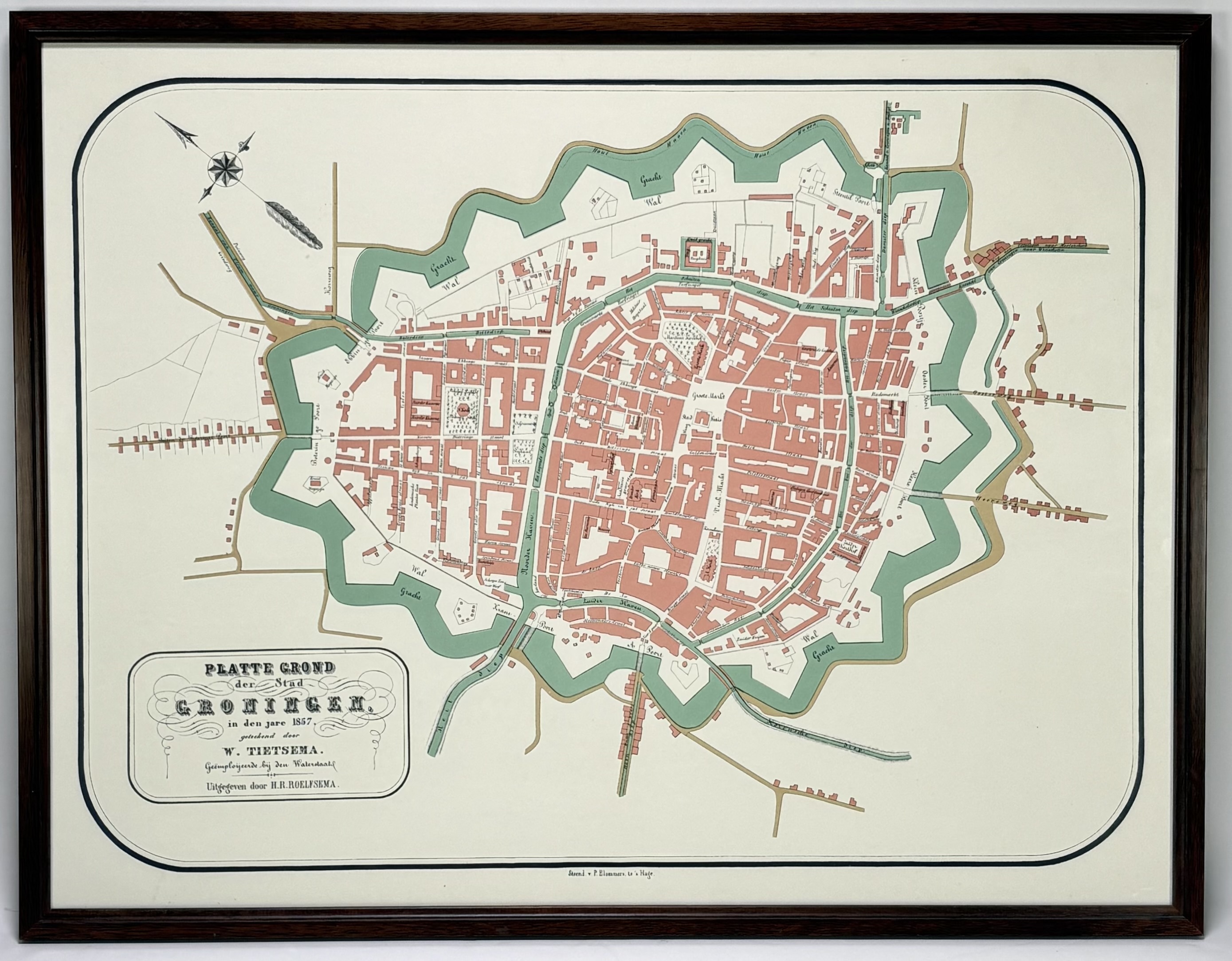 Reproductie van de plattegrond van Groningen in cartografische stijl, op papier. Het werk naar W. Tietsema toont de stad in 1857 binnen de vestingwerken met gedetailleerde straten en karthuizen. De kaart is uitgegeven door H.R. Roelfsema en gedrukt door P. Blommers. Datering 20e eeuw, herkomst Nederland. Deze plattegrond zelf beoordelen? Je bent welkom op onze kijkdagen! |