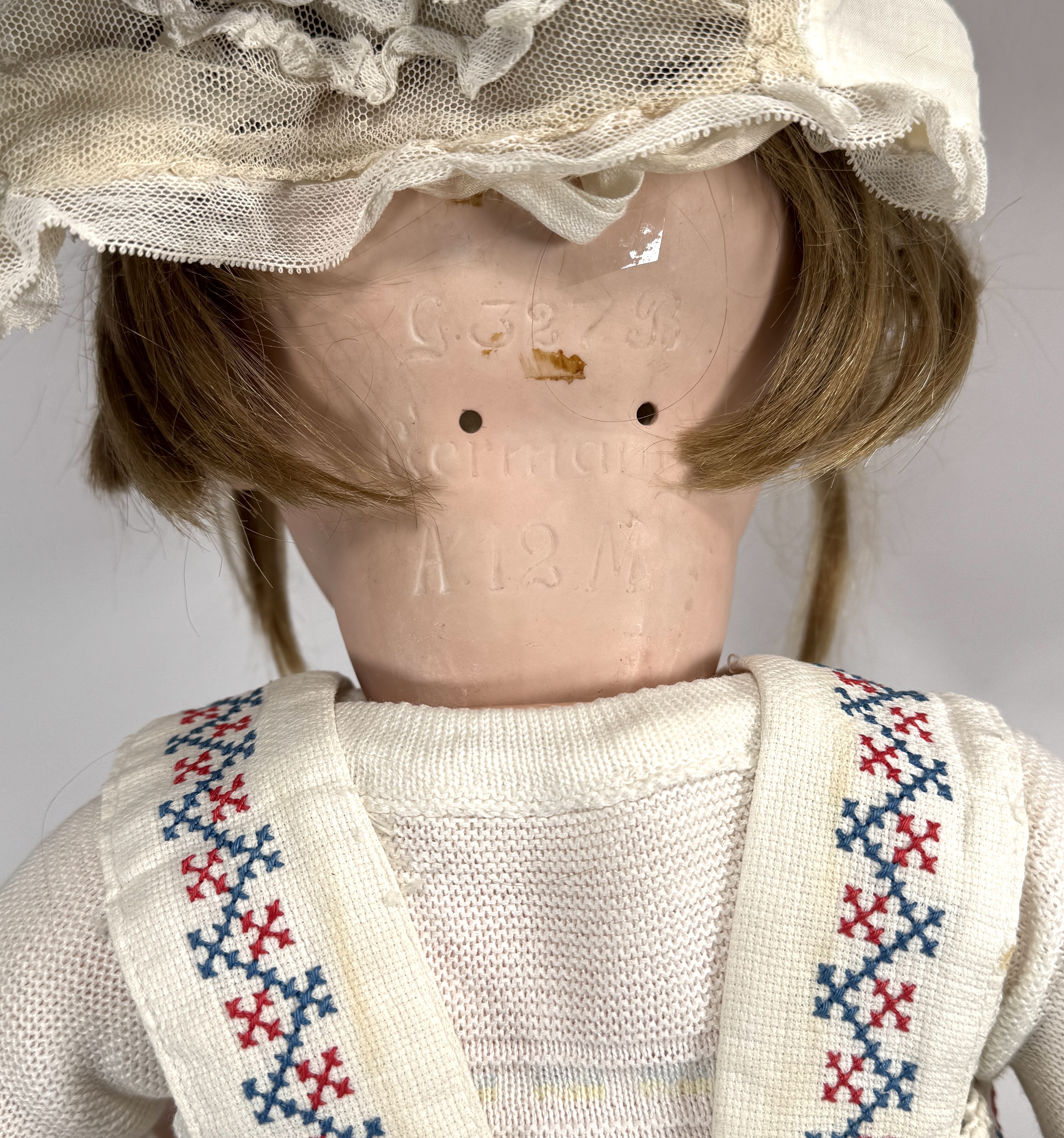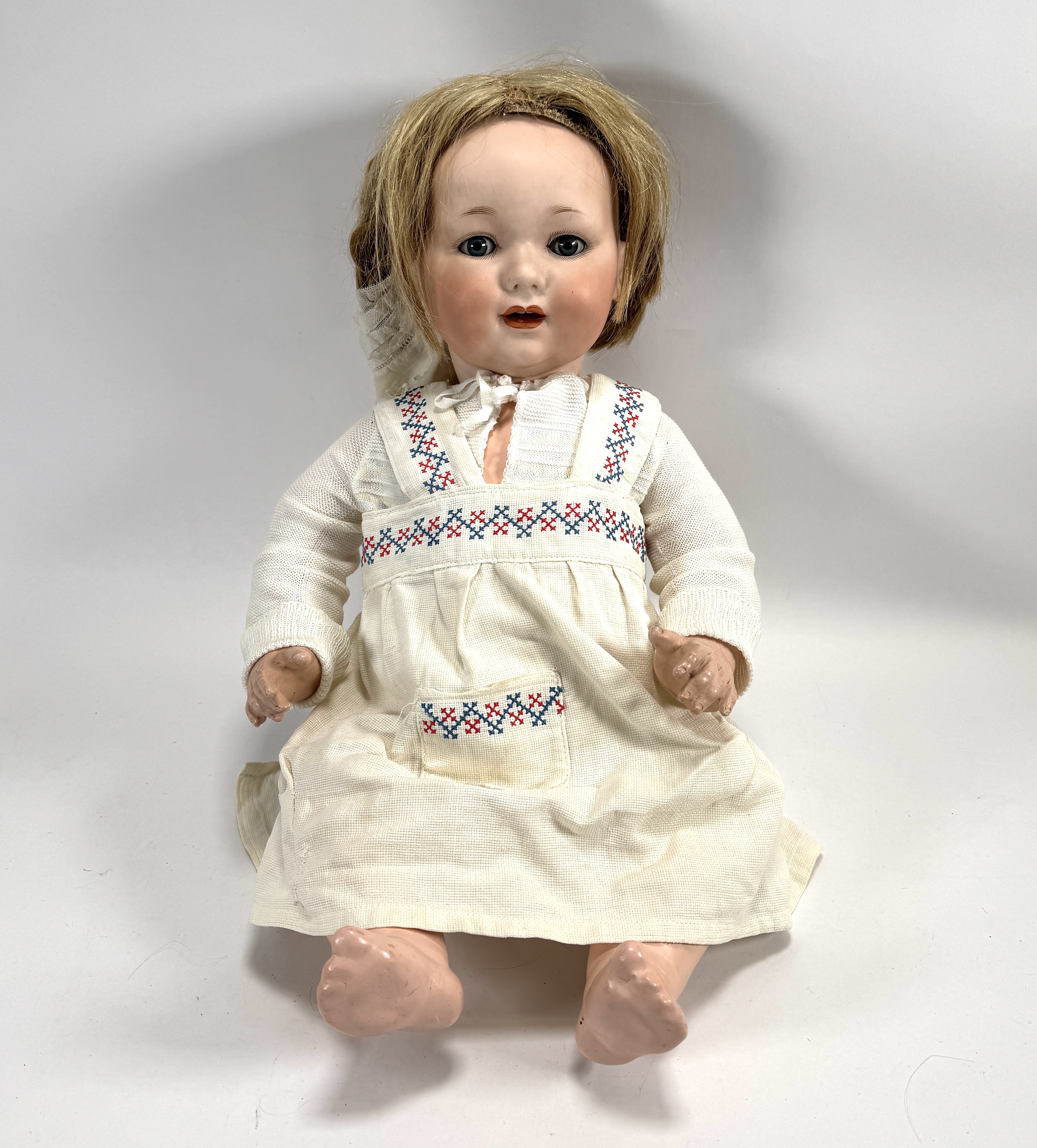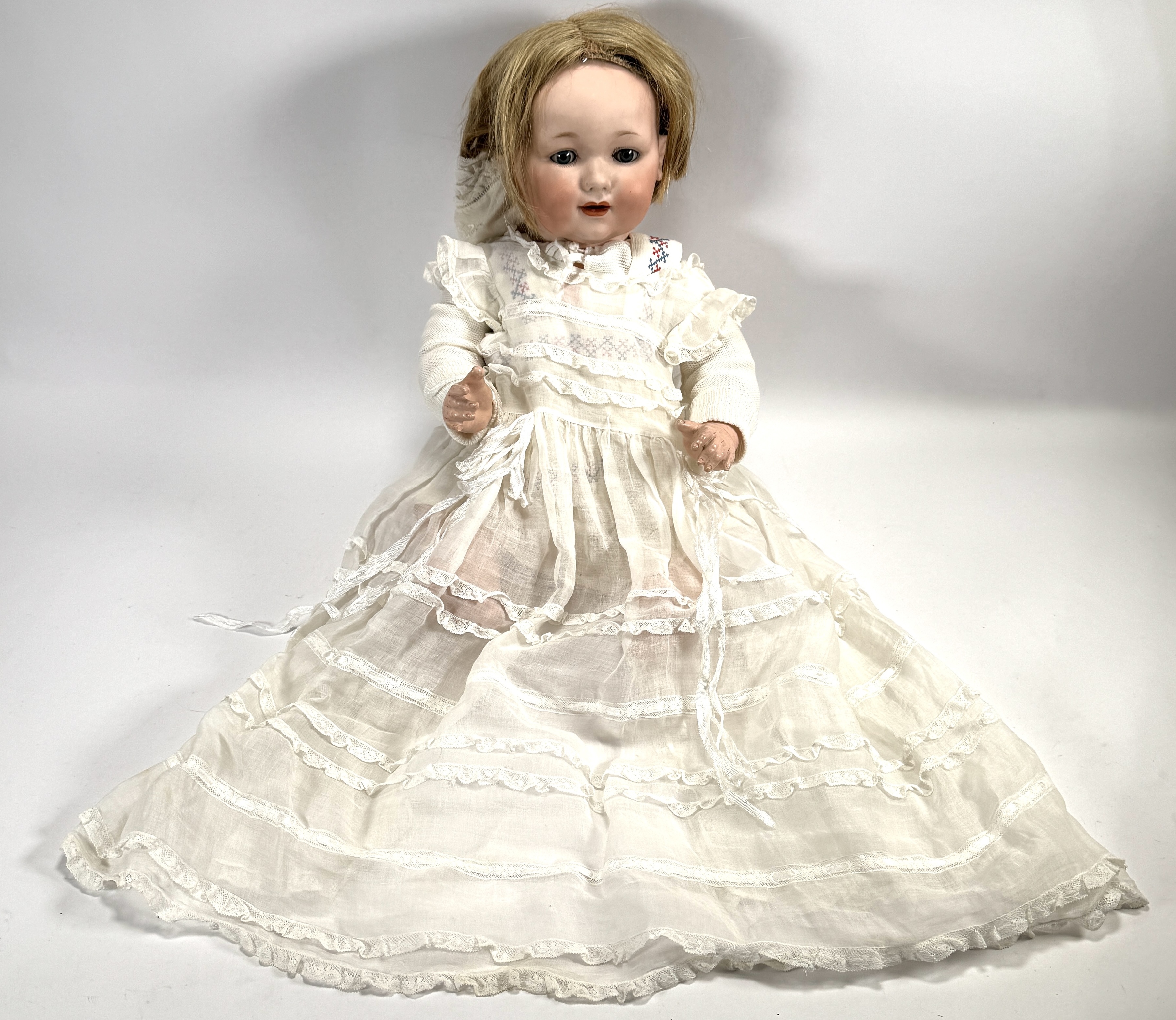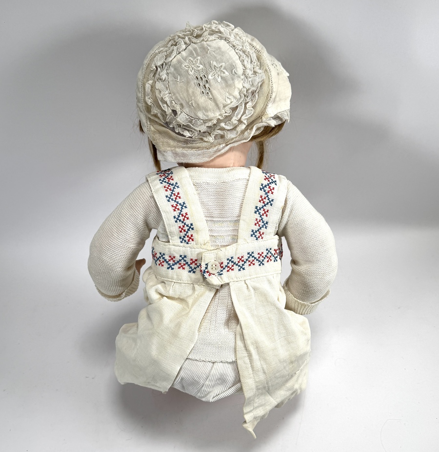 Armand Marseille pop uit de vroege 20e eeuw, vervaardigd met een hoofd van bisque porselein. Het model 327 B toont glazen ogen en een open mondje. Gekleed in een gebreid kostuum met kruissteekdecoratie en een kanten muts, inclusief een rijk gedetailleerde witte kanten doopjurk. Gemerkt in de nek, herkomst Duitsland Registreer nu en bied eenvoudig online mee op deze pop! |