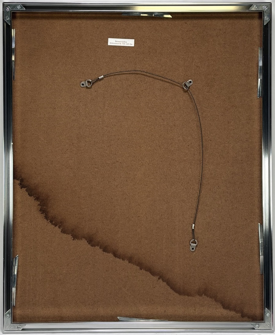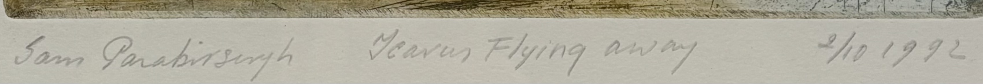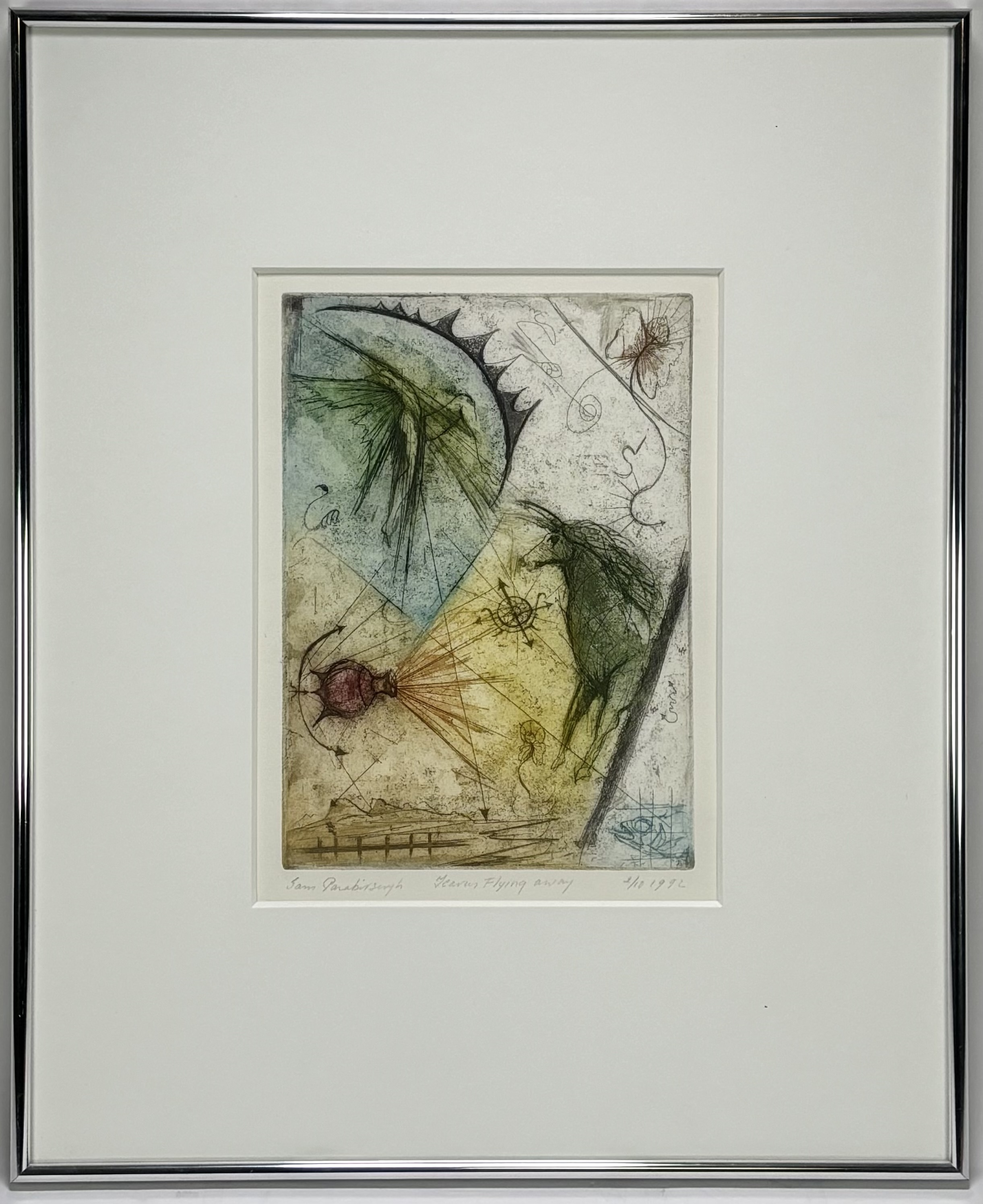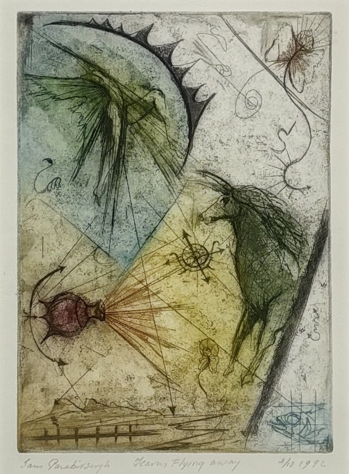 Ets door Sam Parabirsingh (1943–2003) toont een surrealistische compositie met gevleugelde figuren, een paardachtig gestalte en abstracte symbolen, uitgevoerd in aquarel en inkt op papier. De diagonale opbouw wordt versterkt door stralenbundels en lijnstructuren in gedempte groentinten, oker en grijs. Gesigneerd linksonder, getiteld "Icarus flying away", genummerd 2/10 en gedateerd 1992. Wil je deze ets in het echt bekijken? Kom naar de kijkdagen! |