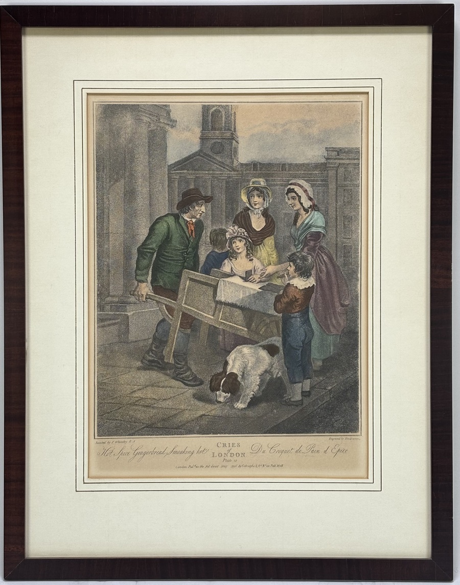 Gravure van Giovanni Vendramini (1769–1839) naar Francis Wheatley (1747–1801) toont een straattafereel uit de beroemde serie "Cries of London" in achttiende-eeuwse stijl. Uitgevoerd als kleurenstippelgravure op papier. Het betreft plaat twaalf getiteld "Hot Spice Gingerbread Smoaking hot!". Centraal staat een peperkoekverkoper met zijn kar bij St. Paul's Cathedral. Uitgegeven in 1796 door Colnaghi te Londen. Geplaatst in een goudkleurige lijst. Wil je deze gravure in het echt bekijken? Kom naar de kijkdagen! |