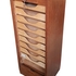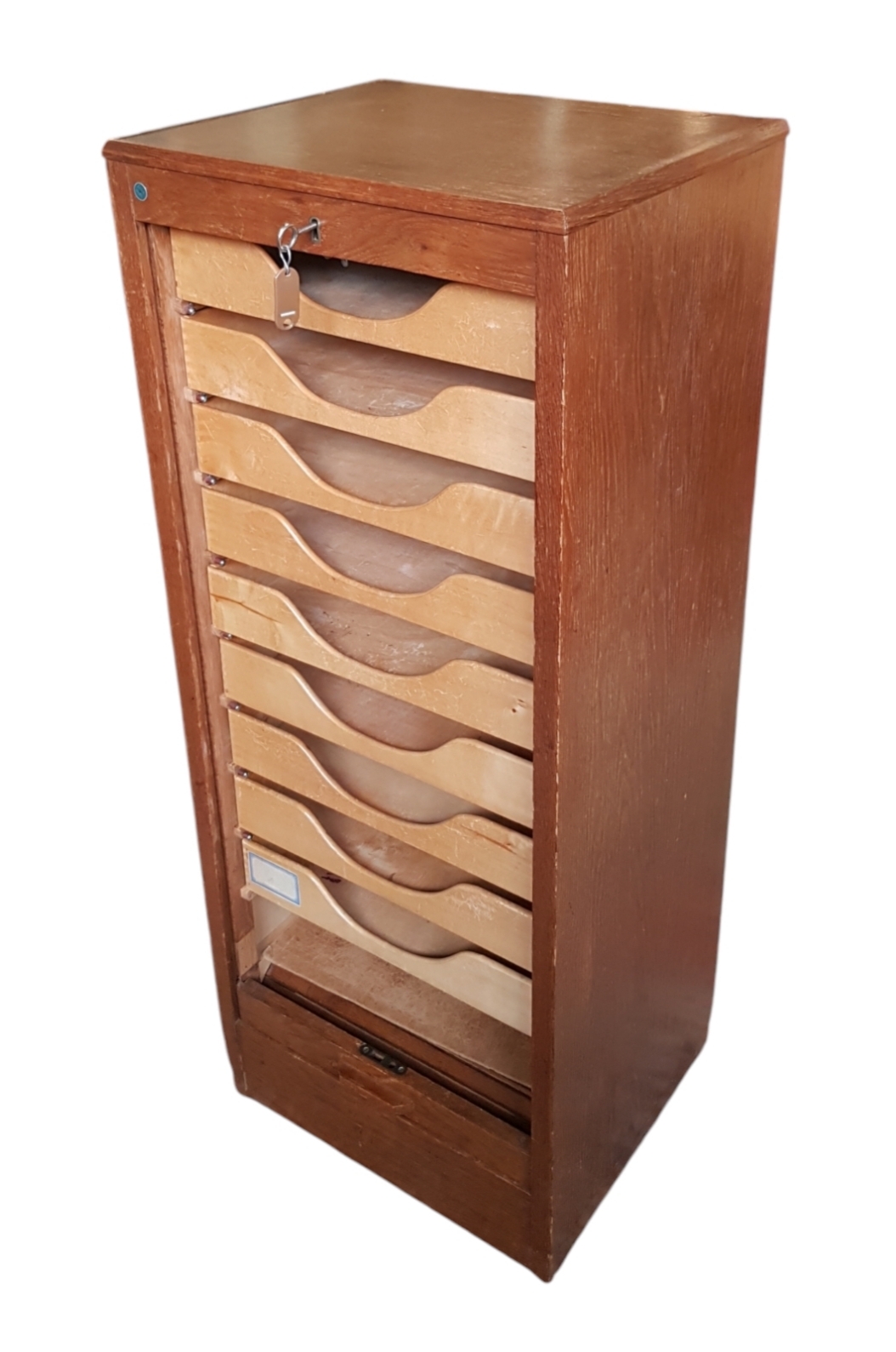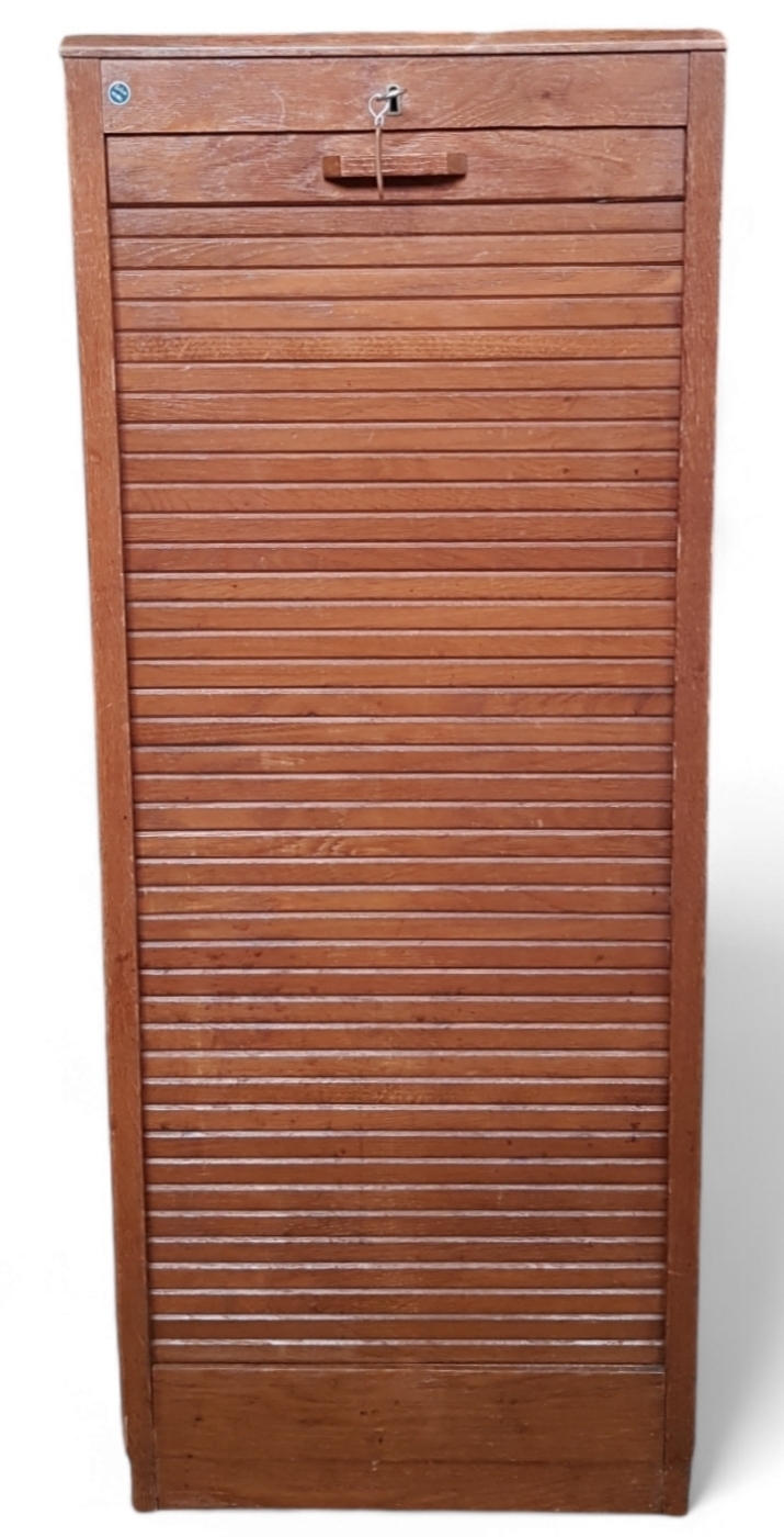 Rolluikkast van Meubelfabriek Eeka in Mid-century modern stijl, vervaardigd uit eikenhout met een mechanische rolluiktechniek. Deze kast bevat een verticaal rolluik waarachter negen uitschuifbare laden voor documentatie zichtbaar zijn. Het meubel is voorzien van een metalen slot. De archiefkast dateert uit ca. 1960 en heeft een Nederlandse herkomst. Jouw kans op deze kast begint met registreren – bied live of online mee! |