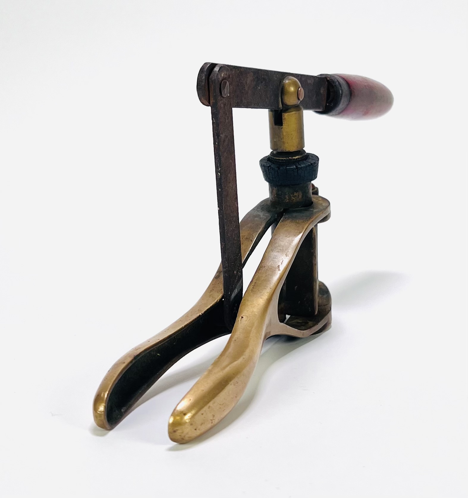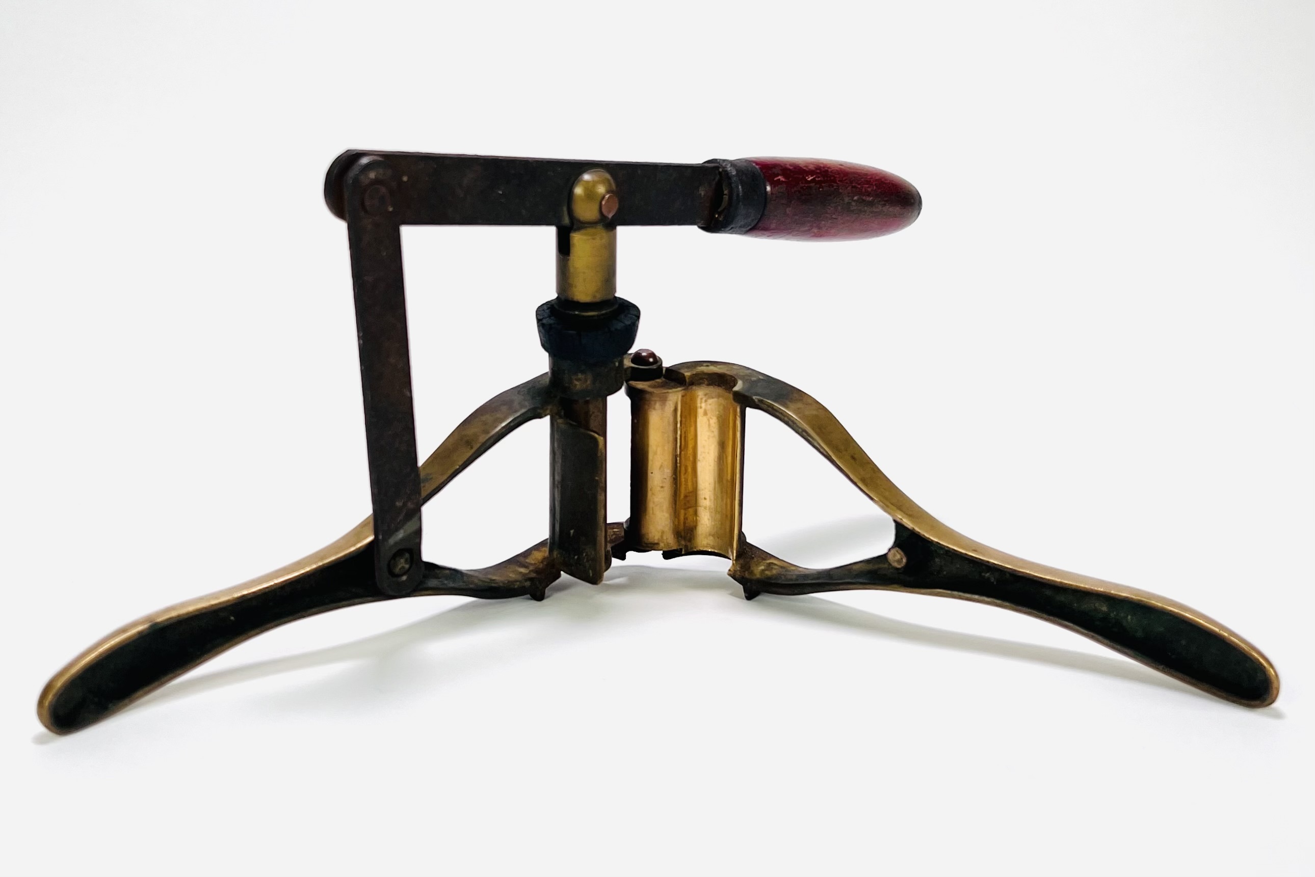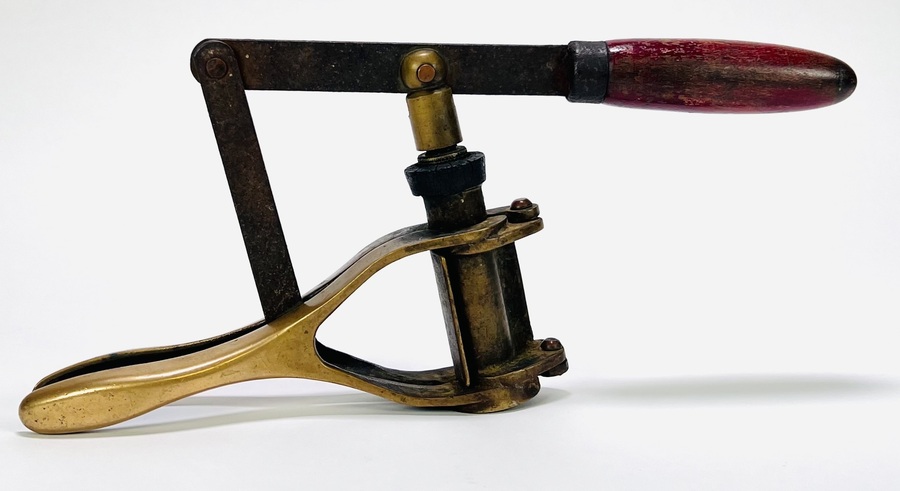 Bronzen wijnfles kurker in klassieke stijl, vervaardigd uit brons met een mechanisch schroefsysteem. De kurker toont een functioneel ontwerp met een patinalaag op het brons. Europese herkomst, eerste helft 20e eeuw. Geïnteresseerd? Bezoek onze kijkdagen van 11:00 tot 17:00 uur! |