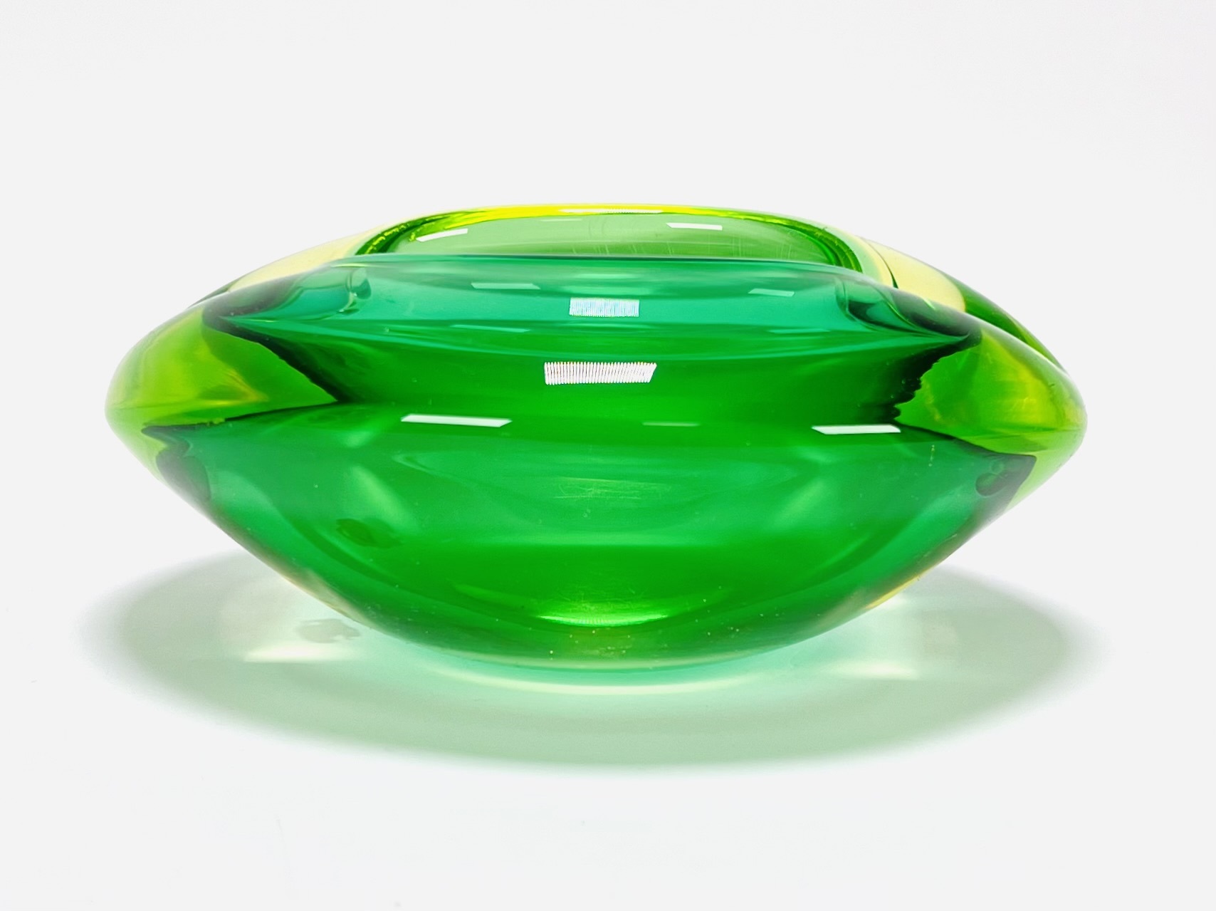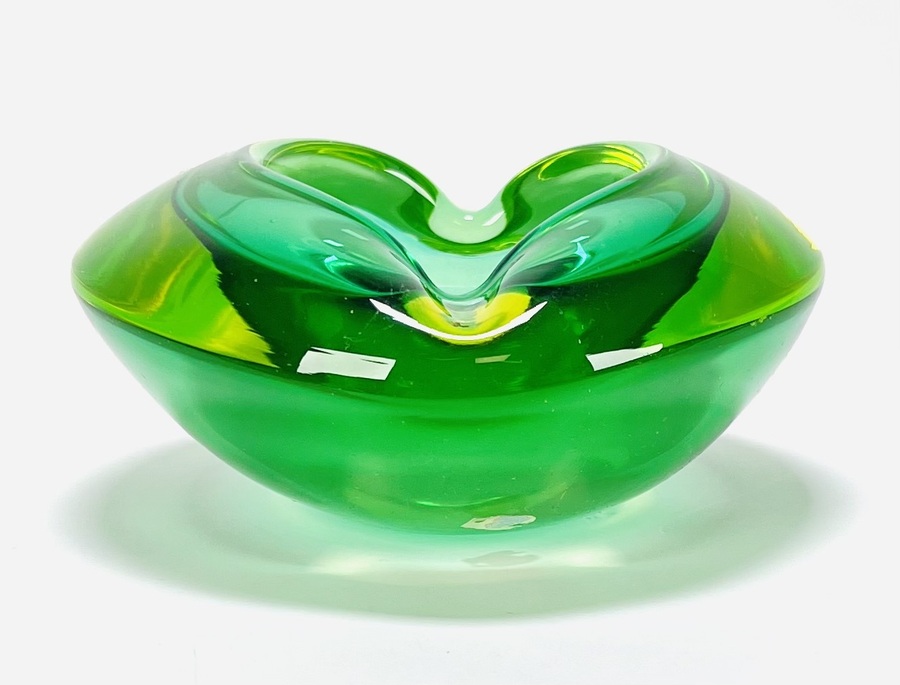 Murano schaal/asbak in Mid-century modern stijl, vervaardigd uit uraniumglas met sommerso techniek. De schaal toont een organische vorm met een groen centrum en een gele buitenzijde die fluoresceert onder ultraviolet licht. De schaal dateert uit ca. 1960 en is gemaakt in Italië, de uitvoering is zwaar en transparant. Deze schaal zelf beoordelen? Je bent welkom op onze kijkdagen! |