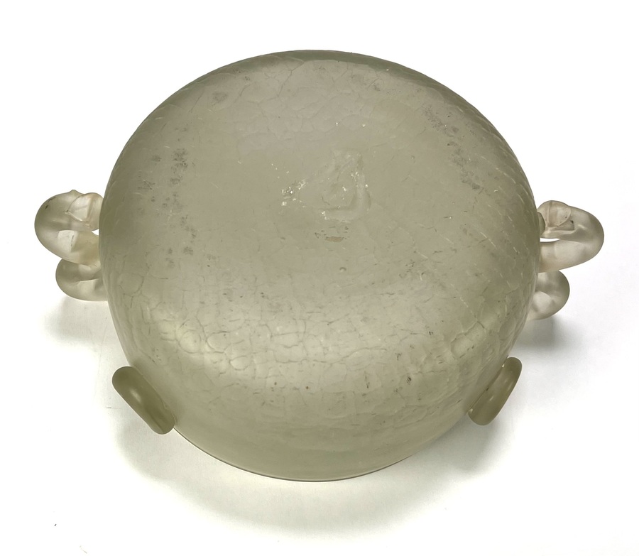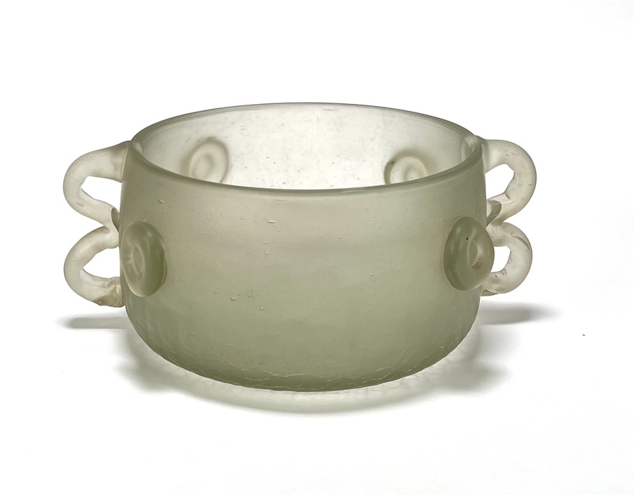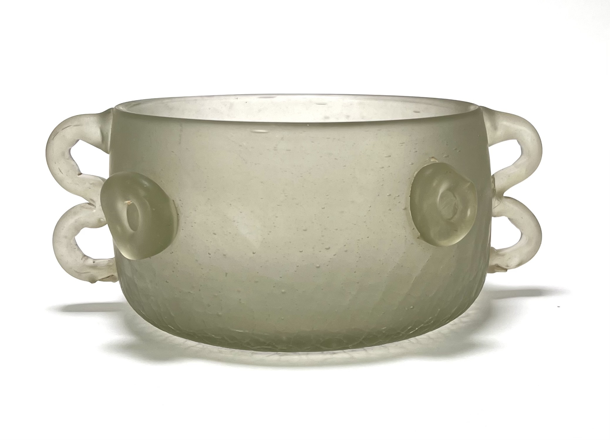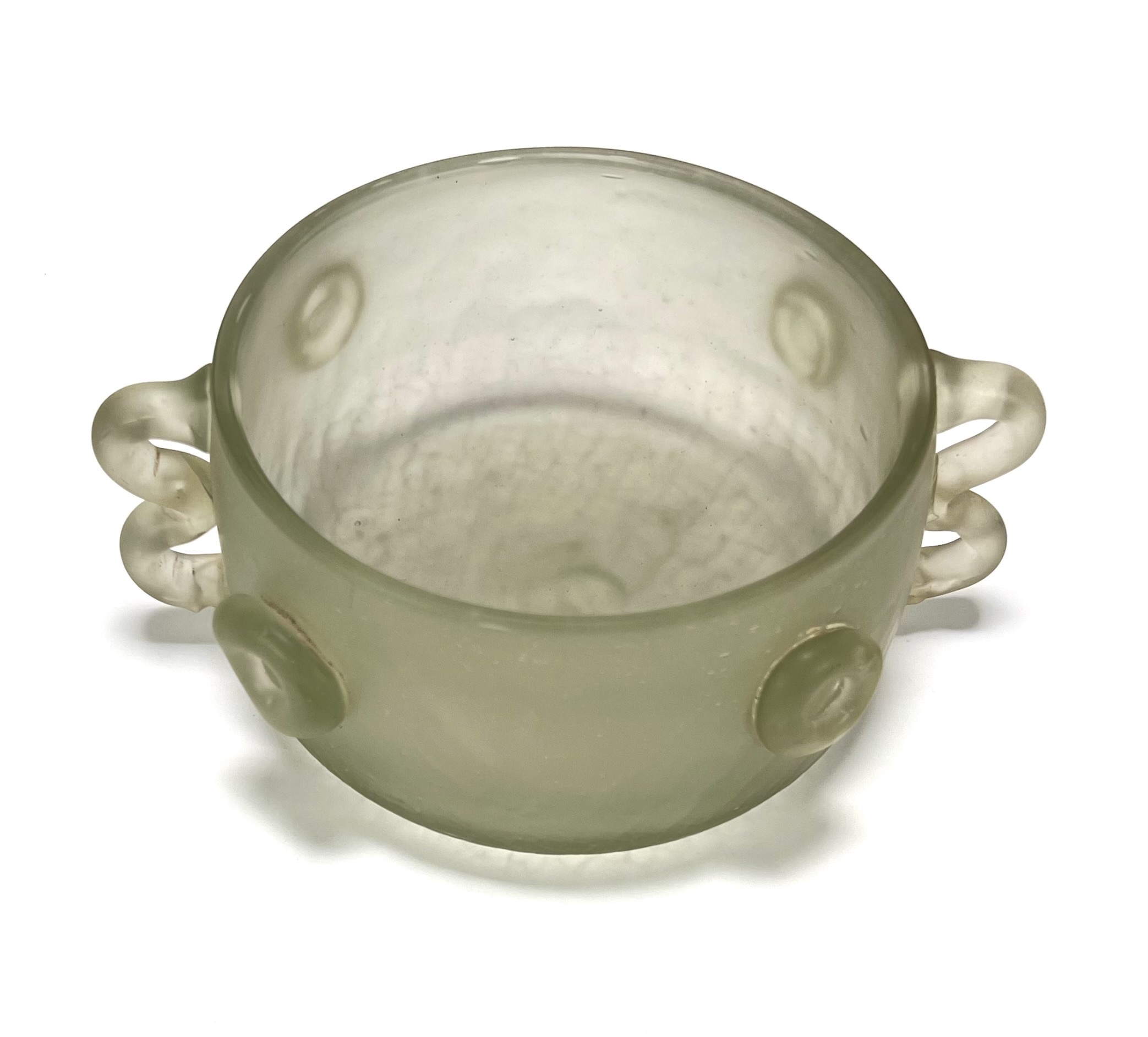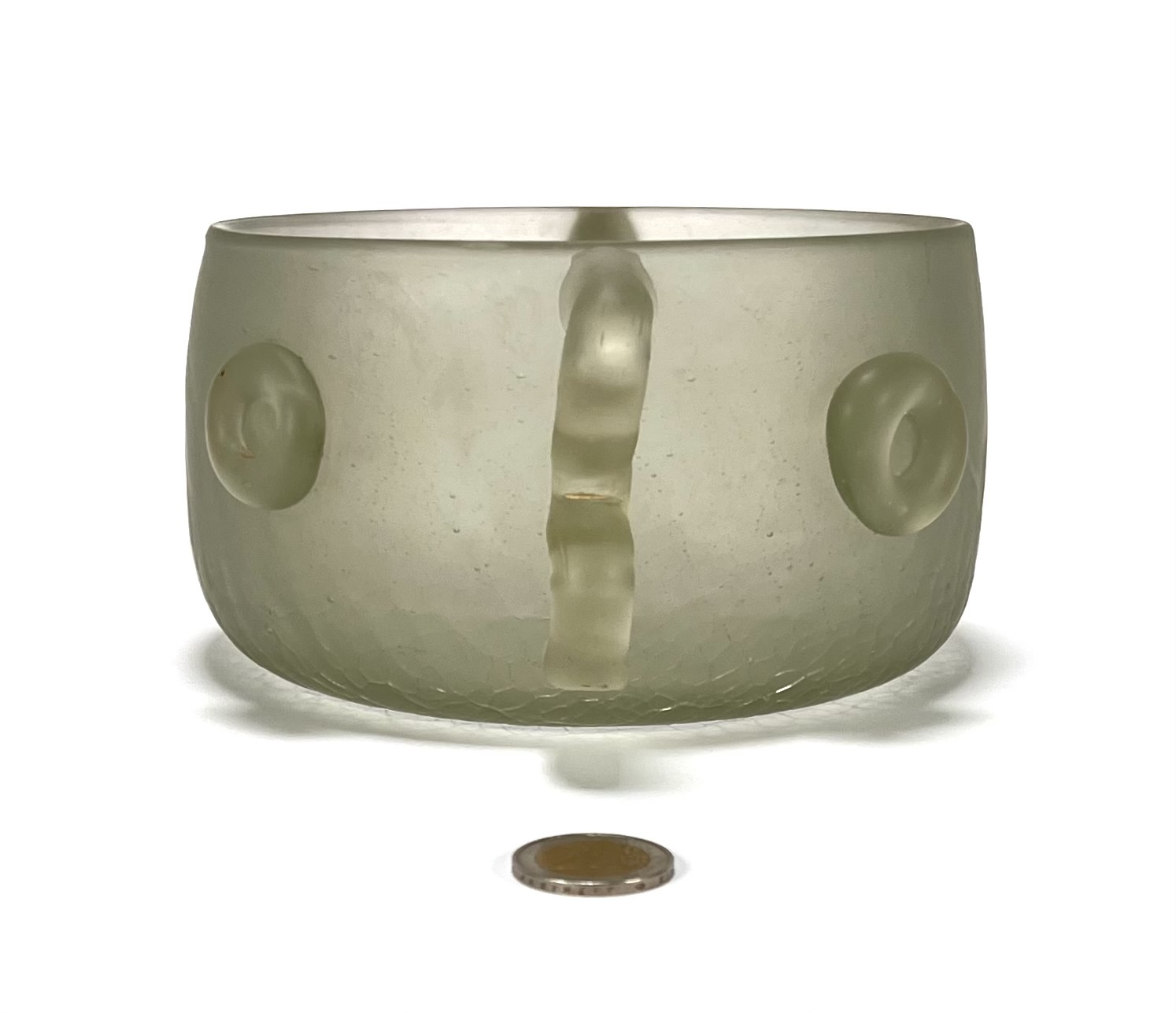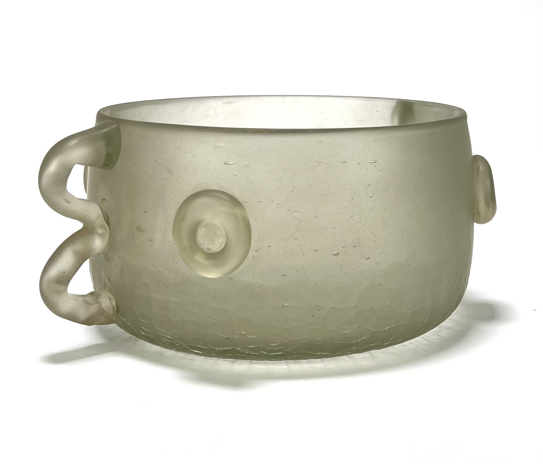 Schaal uit de Mid-century modern periode, vervaardigd uit grijs Muranoglas met vrijgeblazen pulegoso-structuur en gesatineerde afwerking. De lage, afgeronde wand is aan weerszijden voorzien van dubbele lusoren en bevat vier schijfvormige applicaties. Datering 1950–1960 en een Italiaanse herkomst. Zeker zijn van deelname? Plaats vanaf 3 april een schriftelijk bod online! |