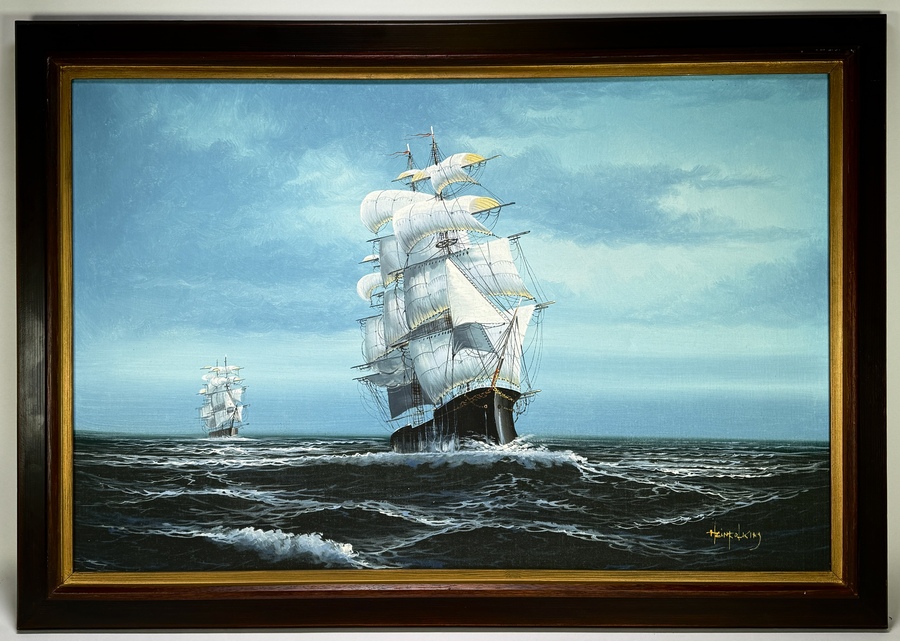 Zeegezicht door Hein Kolking, toont een driemaster in volle zeilen op een onstuimige zee, olieverf op doek. De centrale compositie kenmerkt zich door een dynamisch spel van witte schuimkoppen en een helderblauwe luchtpartij. Rechtsonder gesigneerd met Hein Kolking, datering circa 1970 en heeft een Europese herkomst. Klaar om te bieden? Registreer je nu en doe mee aan de veiling! |
