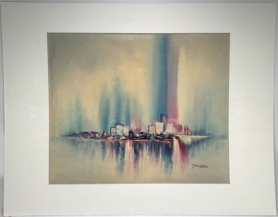 Schilderij door Patricia Larsen toont een abstract stadsgezicht in abstract-expressionistische stijl, uitgevoerd in olieverf op doek. De compositie is horizontaal opgebouwd met een centrale skyline, verticale kleurbanen en spiegelende reflecties in water. Het kleurpalet bestaat uit gedempte blauwtinten, crème-, roze- en roodaccenten. Het werk dateert uit de tweede helft 20e eeuw en heeft een Canadese herkomst. Geïnteresseerd? Bezoek onze kijkdagen op 10, 11 en 12 april van 11:00 tot 17:00 uur! |