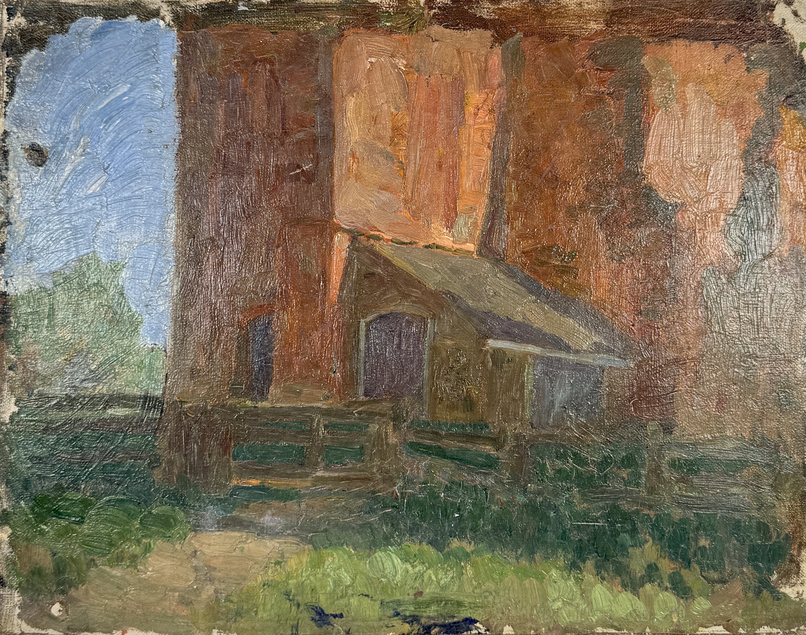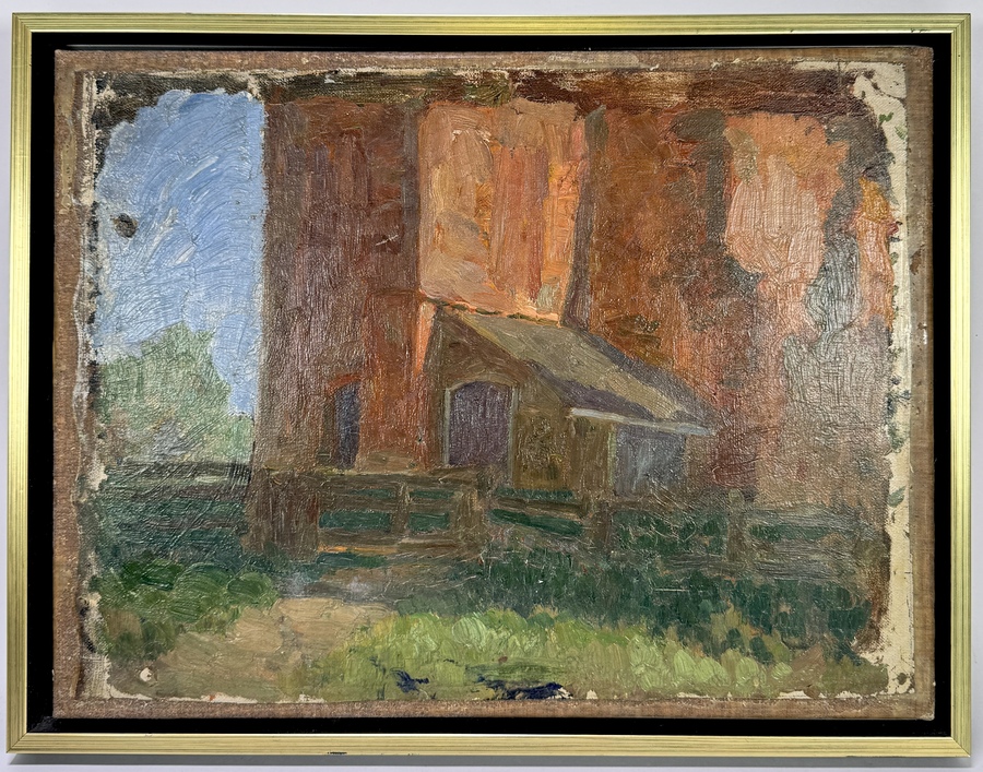 Niet voltooid olieverfschilderij op doek, begin 20e eeuw, door Reinhart Dozy (Nijmegen, 28 september 1880 – Elp, 27 januari 1947). Kerkgebouw met houten aanbouw in impressionistische stijl, uitgevoerd met losse penseelvoering en roodbruine tonen tegenover een heldere lucht.