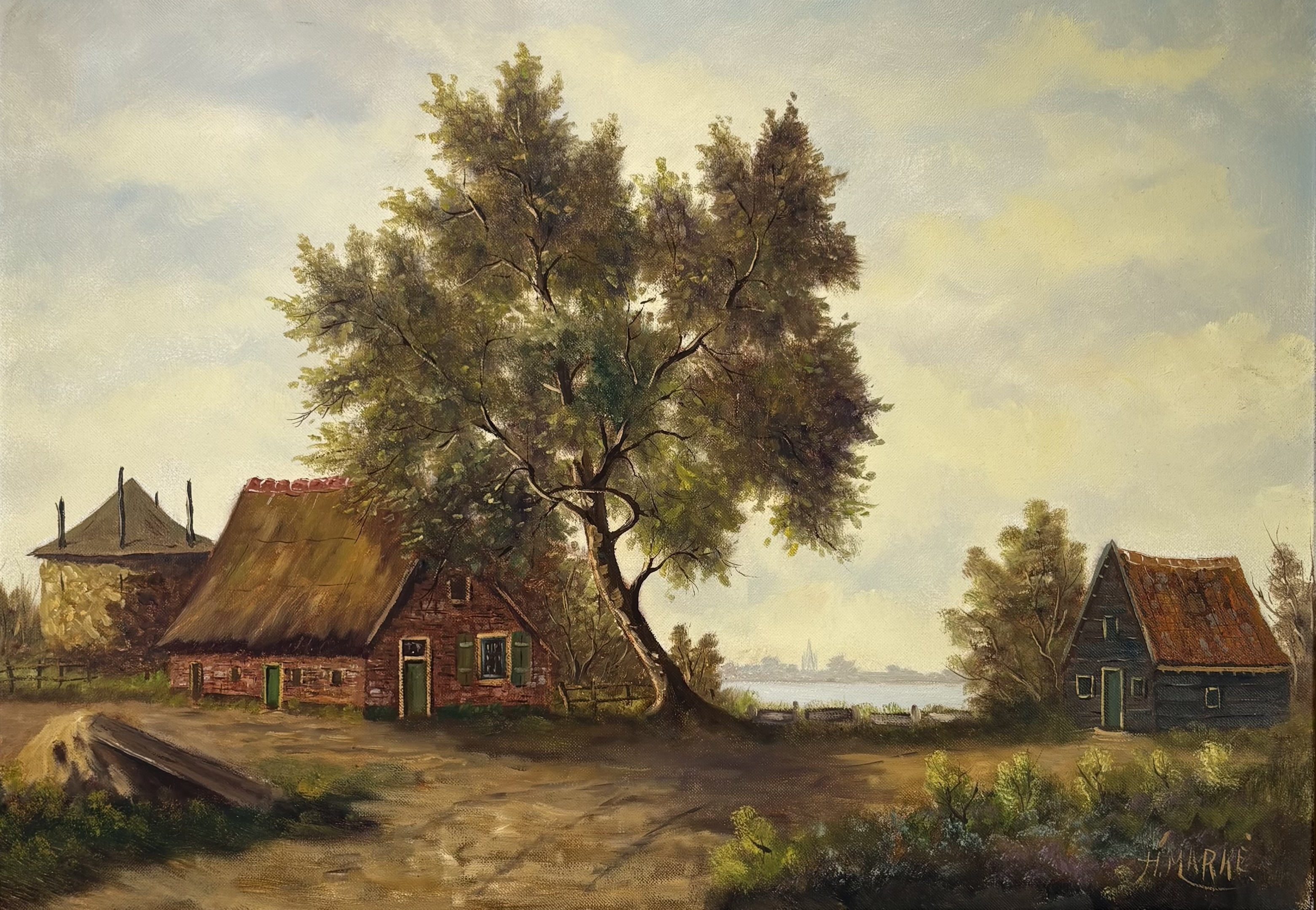 Schilderij van H. Marke toont een rietgedekte boerderij, een houten bijgebouw en paalschuur in naturalistische stijl, uitgevoerd in olieverf op doek. Centraal staat een markante loofboom die de compositie structureert tegen een bewolkte lucht. Gesigneerd rechtsonder, gedateerd midden 20e eeuw en een Nederlandse herkomst. Dit schilderij zelf beoordelen? Je bent welkom op onze kijkdagen op 10, 11 en 12 april! |