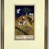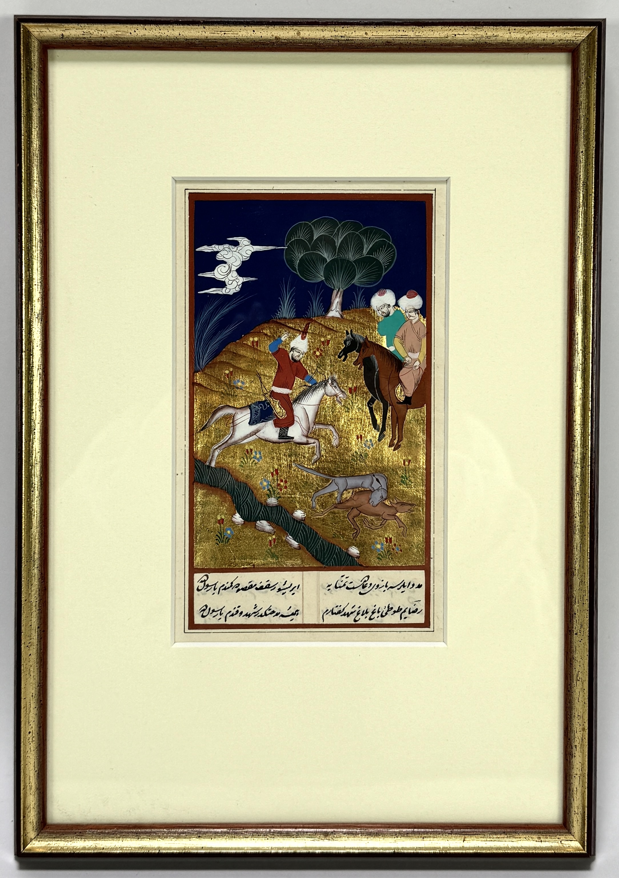 Miniatuur gouache van de 20e-eeuwse Perzische School, met goud op papier, verbeeldt een ruiterscène. Tegen een diepblauwe nachtelijke lucht ligt een goudgrond met florale accenten, links galoppeert een krijger met geheven zwaard, rechts zitten twee figuren op een donker paard, terwijl honden een hert opjagen. Onderaan Nastaʿlīq-tekst, in goudkleurige lijst met ruim passe-partout. Wil je deze gouache in het echt bekijken? Kom naar de kijkdagen! |