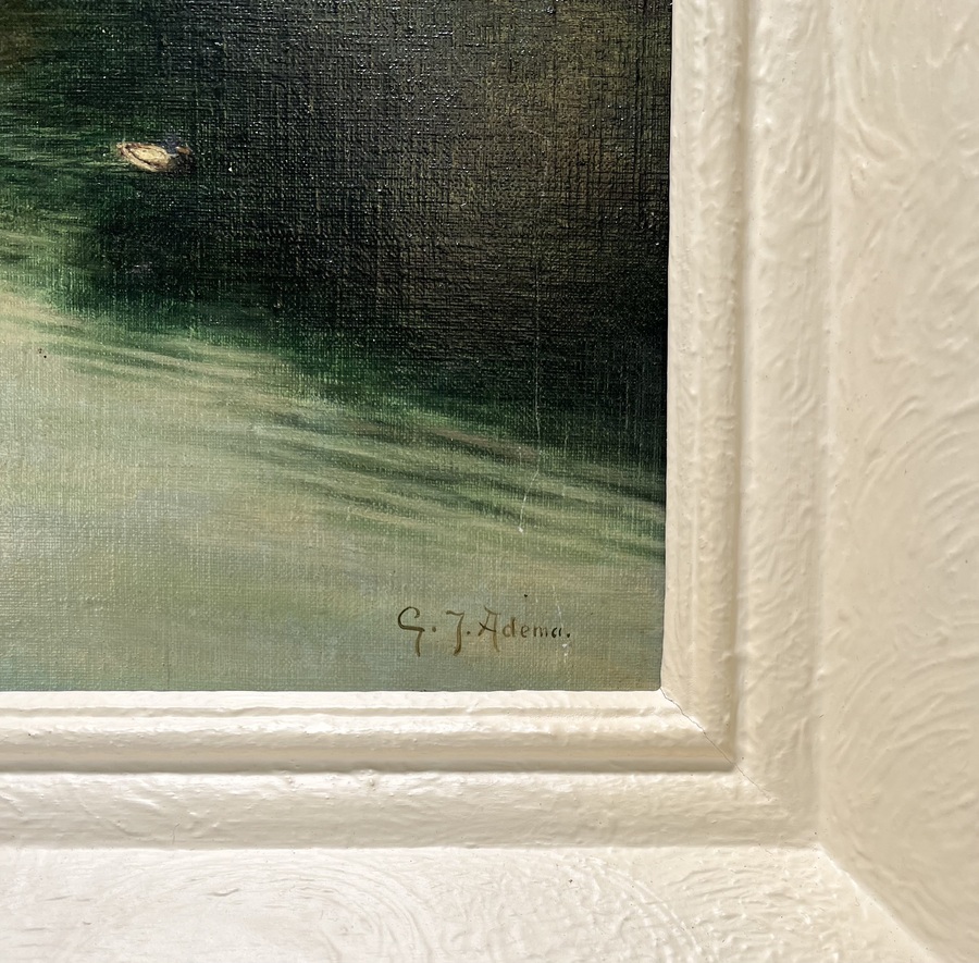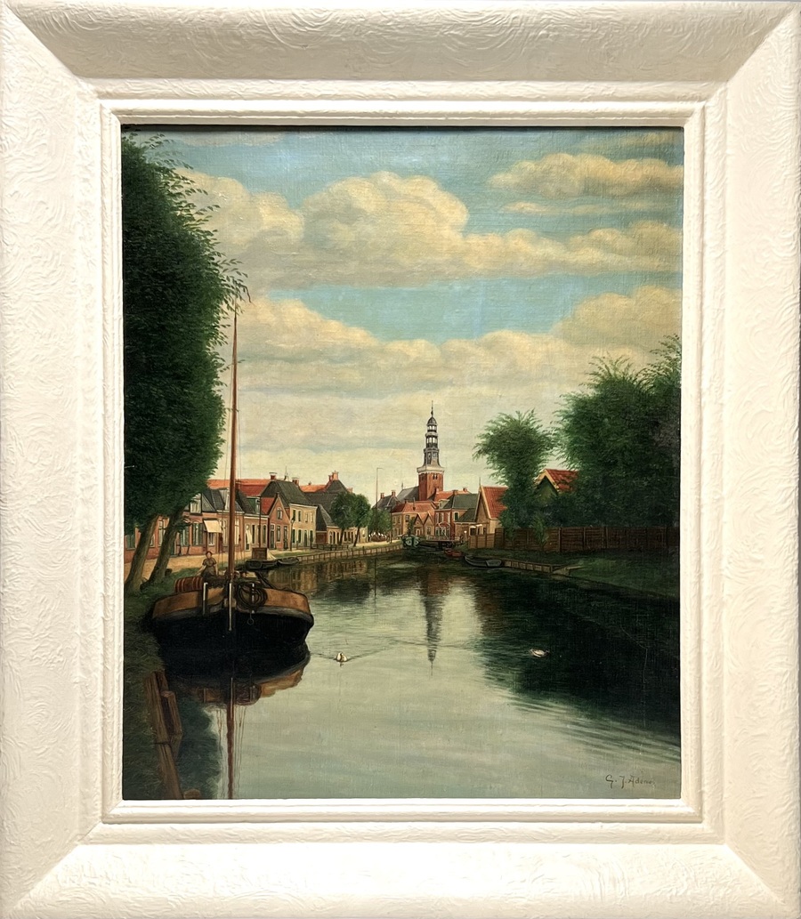 Schilderij door Gerhardus Jan Adema (1898–1981), olieverf op doek, toont een kanaaldorp met de kerk van Oldeboorn (Aldeboarn). Links ligt een afgemeerde boot onder een dichte bomenmassa, langs beide oevers van de Boorne staan huizen met roodpannen daken en lage kades. Het water weerspiegelt toren en gevels, met twee eenden in de voorgrond. Gesigneerd rechtsonder, gedateerd midden van de 20e eeuw en heeft een Friese herkomst. Kom langs tijdens de kijkdagen (10 t/m 12 april) en ontdek dit schilderij zelf! |