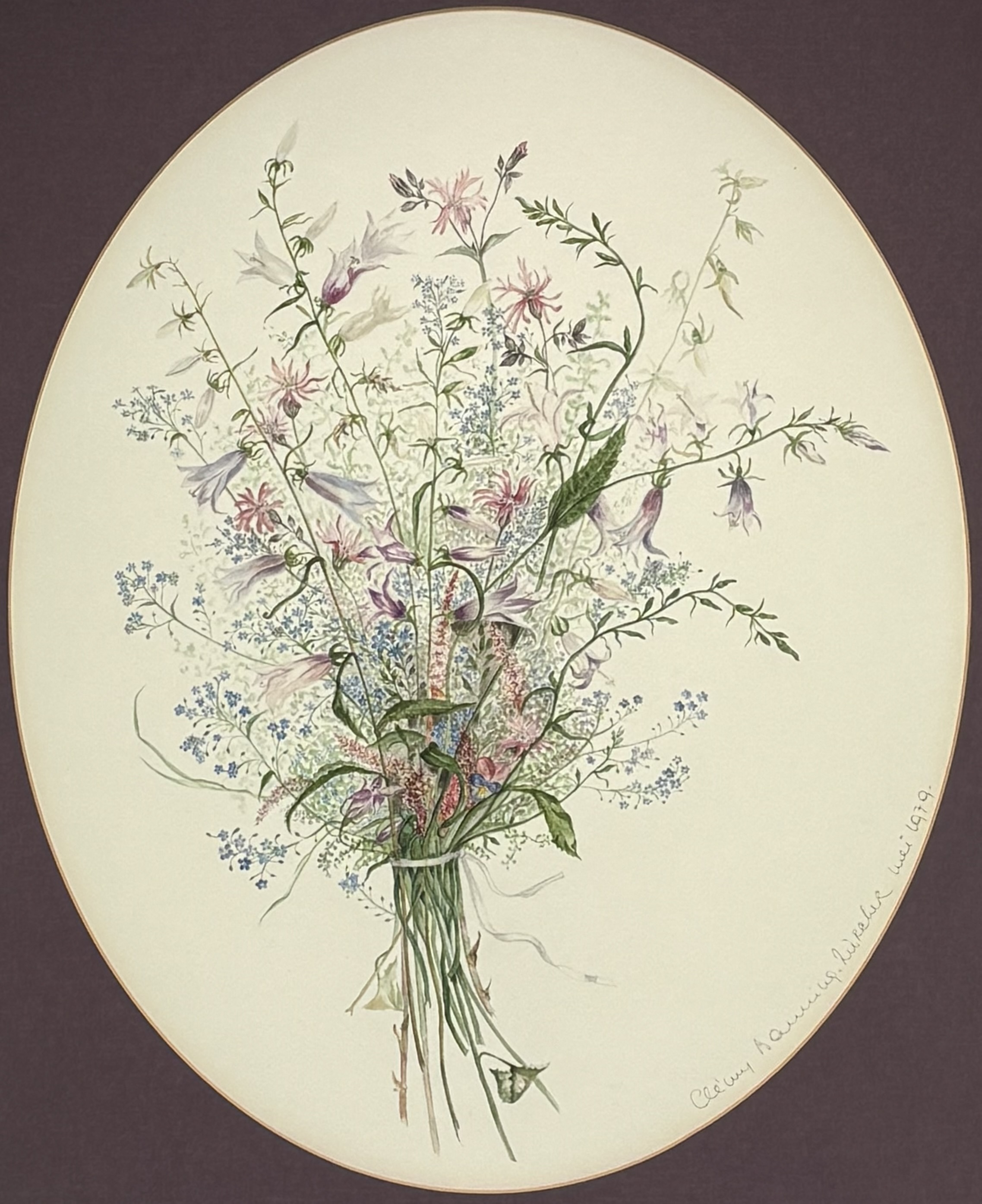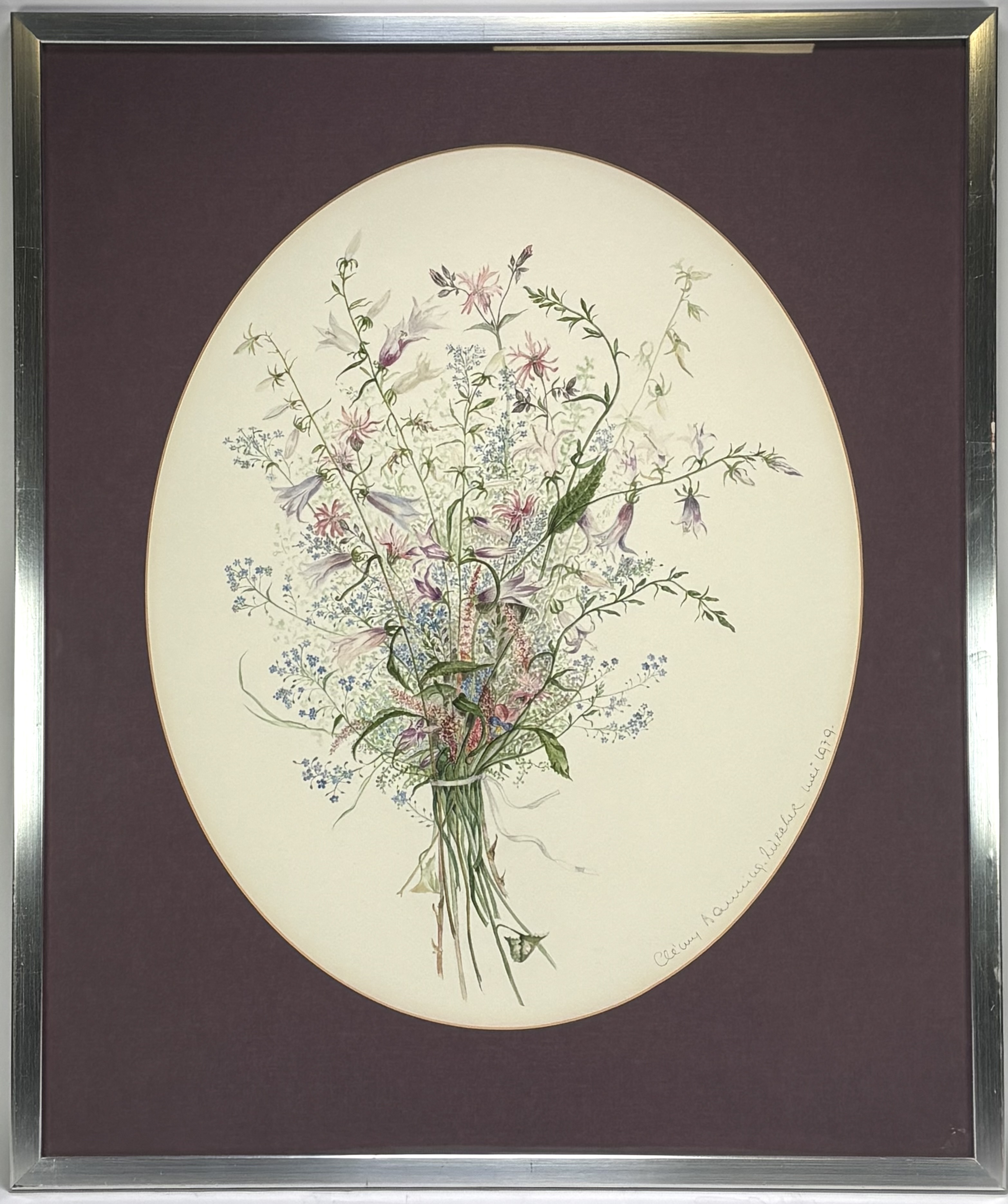 Aquarel van een boeket veldbloemen in botanische stijl, uitgevoerd in aquarel op papier. De ovale compositie bevat gedetailleerde weergaven van klokjesbloemen, vergeet-mij-nietjes en grassen in een palet van blauw, violet en zachtgroen. Onduidelijk gesigneerd in de rand en gedateerd mei 1979. Het werk heeft een Nederlandse herkomst en zit in een zilverkleurige lijst met passe-partout. Geïnteresseerd? Bezoek onze kijkdagen op 10, 11 en 12 april van 11:00 tot 17:00 uur! |