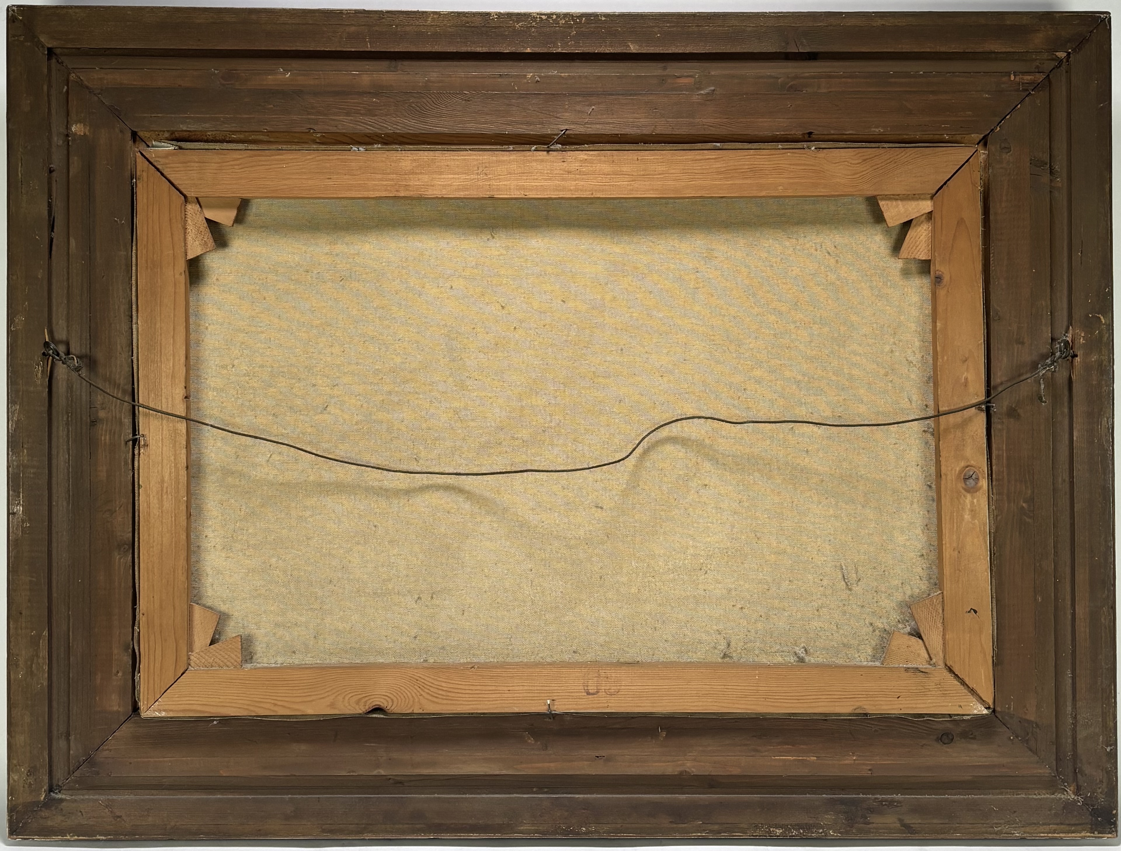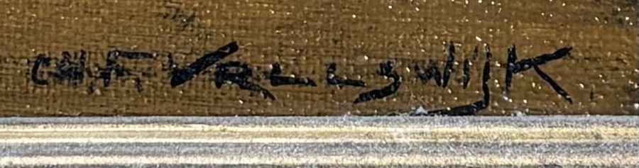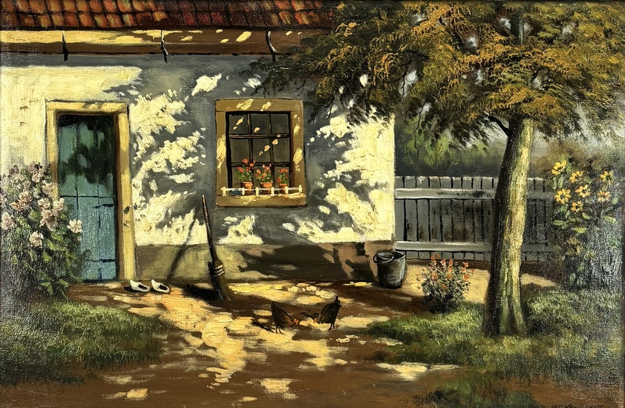 Olieverfschilderij toont een zonovergoten boerenerf met een witgepleisterde gevel en blauwe deur in realistisch impressionistische stijl, uitgevoerd in olieverf op doek. De compositie bevat scharrelende kippen, een bezem en een markante boom met gefilterde lichtinval op de voorgrond. Rechtsonder onduidelijk gesigneerd. Het werk dateert uit het midden van de twintigste eeuw en heeft een Nederlandse herkomst. In goudkleurige lijst. Geïnteresseerd? Bezoek onze kijkdagen op 10, 11 en 12 april van 11:00 tot 17:00 uur! |