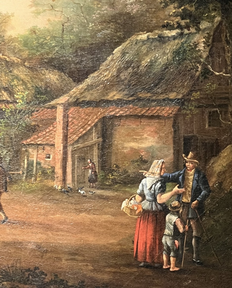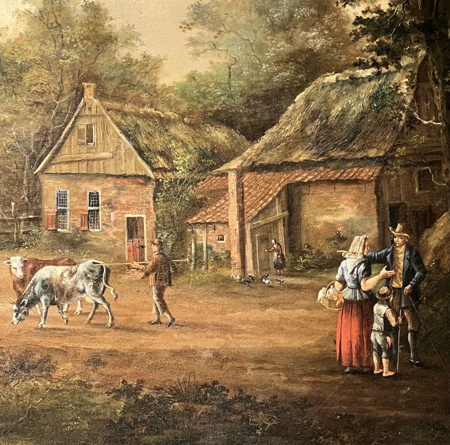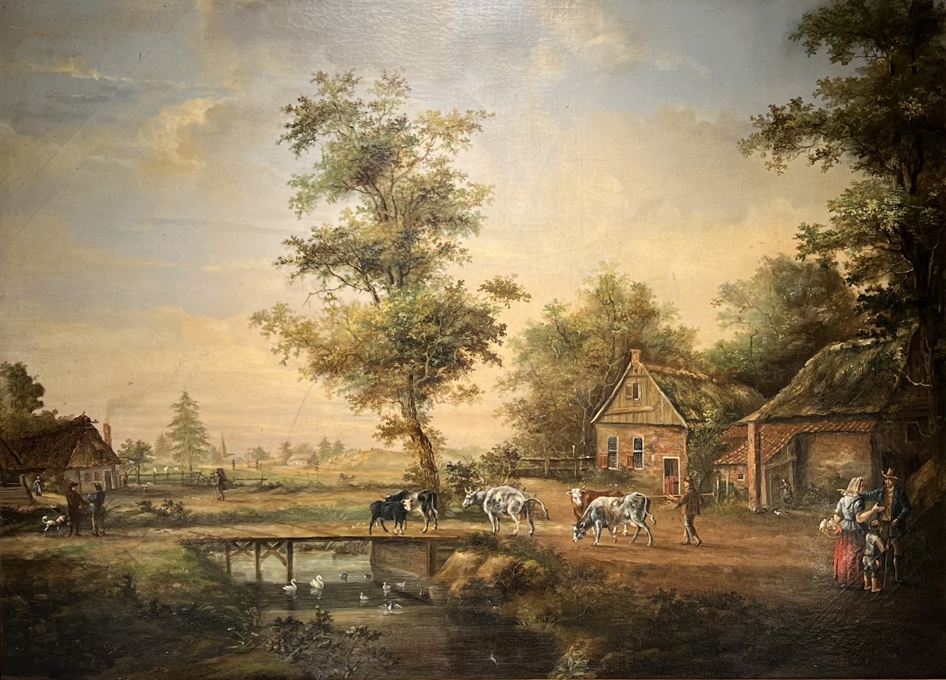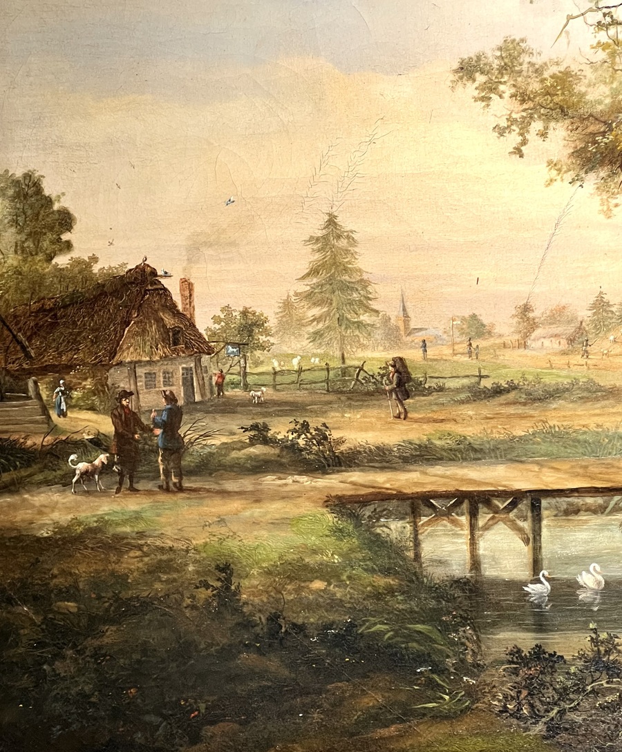 Schilderij van de 19e-eeuwse Hollandse School, uitgevoerd in olieverf op doek, toont een pastoraal landschap uit de romantiek. De voorstelling omvat gedetailleerde boerderijen met rieten daken, figuren bij een brug en grazend vee langs een waterpartij. Het diffuse lichtgebruik en de fijne penseelvoering in de zijn kenmerkend. Dit schilderij dateert uit de 19e eeuw en heeft een Nederlandse herkomst. Klaar om te bieden? Registreer je nu en doe mee aan de veiling! |