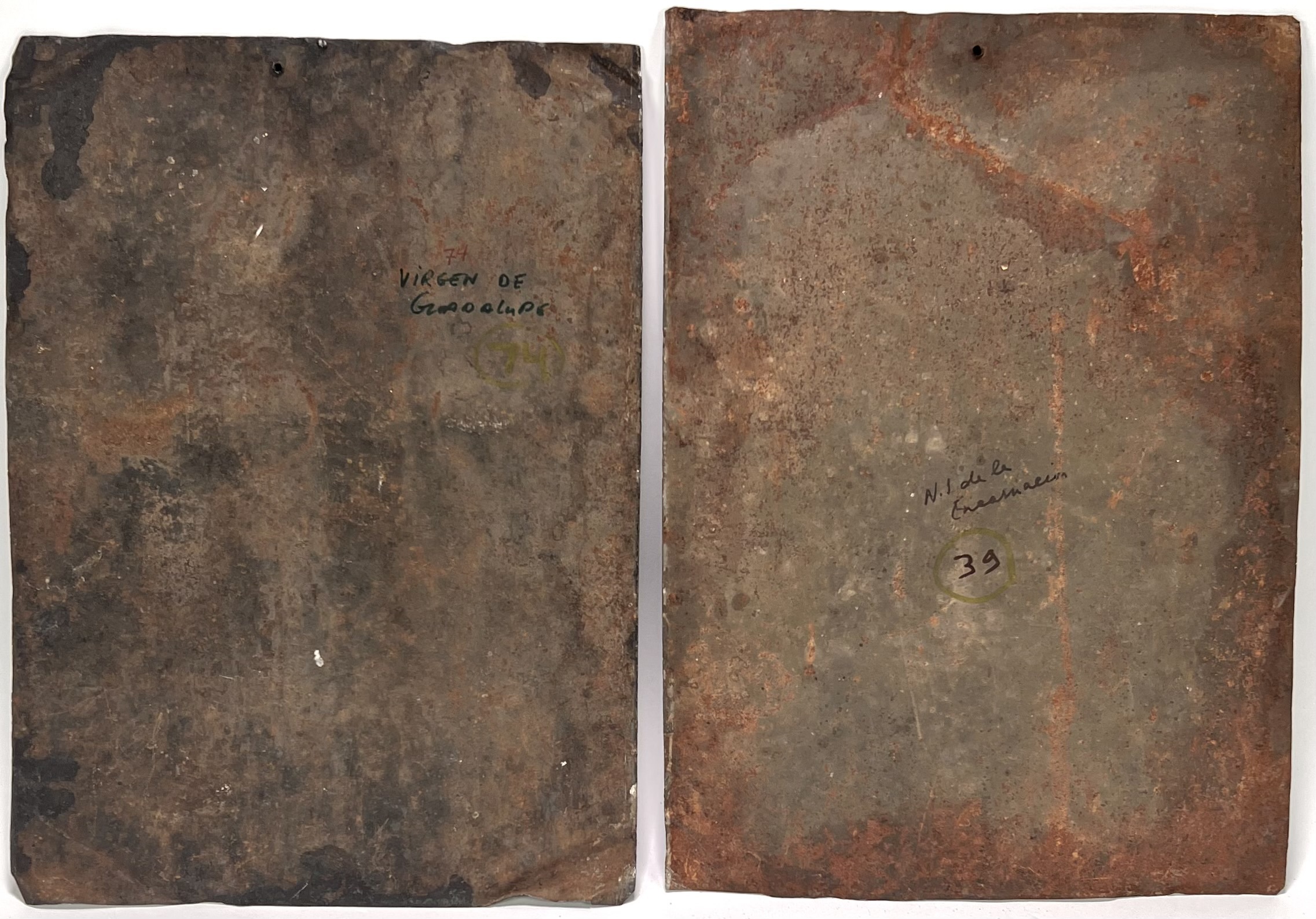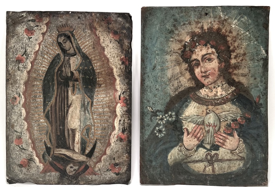 Olieverfschilderijen op tin, twee retablo’s met de Virgen de Guadalupe en Onze-Lieve-Vrouw van de Incarnatie in de negentiende-eeuwse volkskunsttraditie. De iconografie bevat karakteristieke stralenkransen, bloemmotieven en een duifsymbool tegen een atmosferische achtergrond. De achterzijde bevat handgeschreven identificaties. Deze devotionele werken dateren uit circa 1880 en hebben een herkomst uit Centraal-Mexico. Geïnteresseerd? Bezoek onze kijkdagen op 10, 11 en 12 april van 11:00 tot 17:00 uur! |
