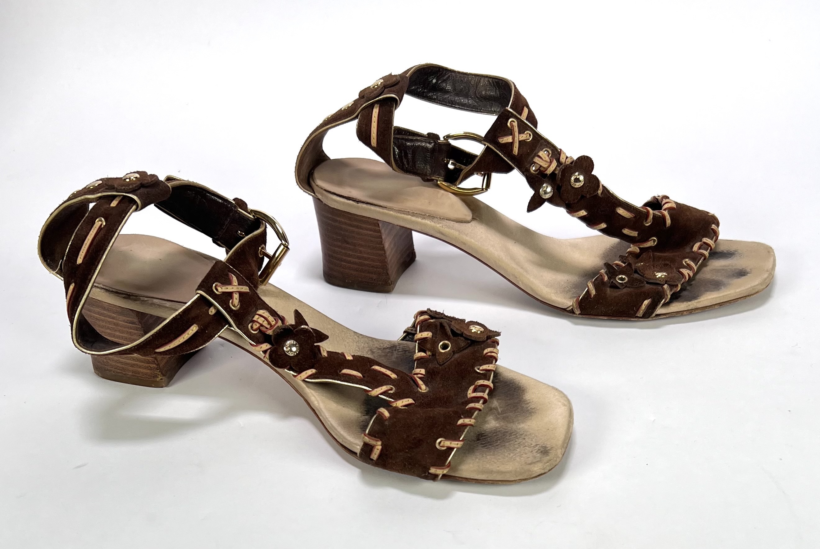 Sandalen van Louis Vuitton in een eigentijdse stijl, vervaardigd uit bruin suède met houten blokhakken en goudkleurig metalen beslag. De voorzijde en enkelbanden zijn gedecoreerd met suède bloemapplicaties en contrasterend crèmekleurig stikwerk langs de randen. Voorzien van merkaanduiding op de zolen en goudkleurige klinknagels met gegraveerd logo. In originele doos Deze sandalen zelf beoordelen? Je bent welkom op onze kijkdagen op 10, 11 en 12 april! |
