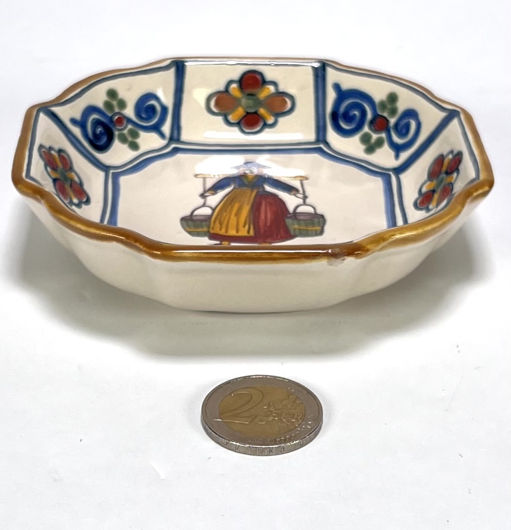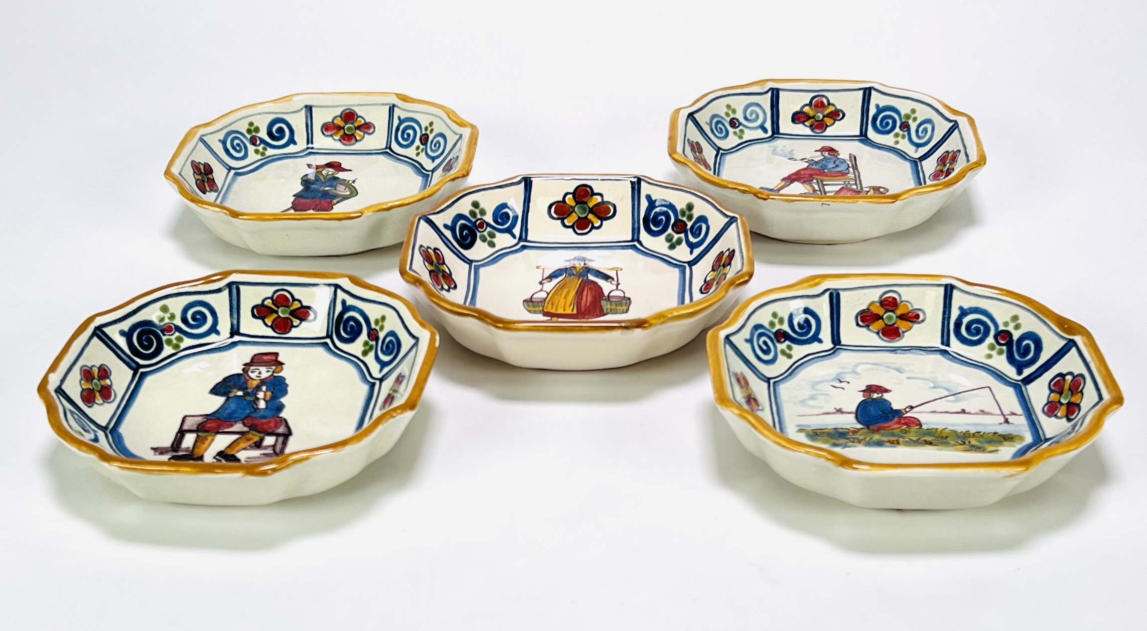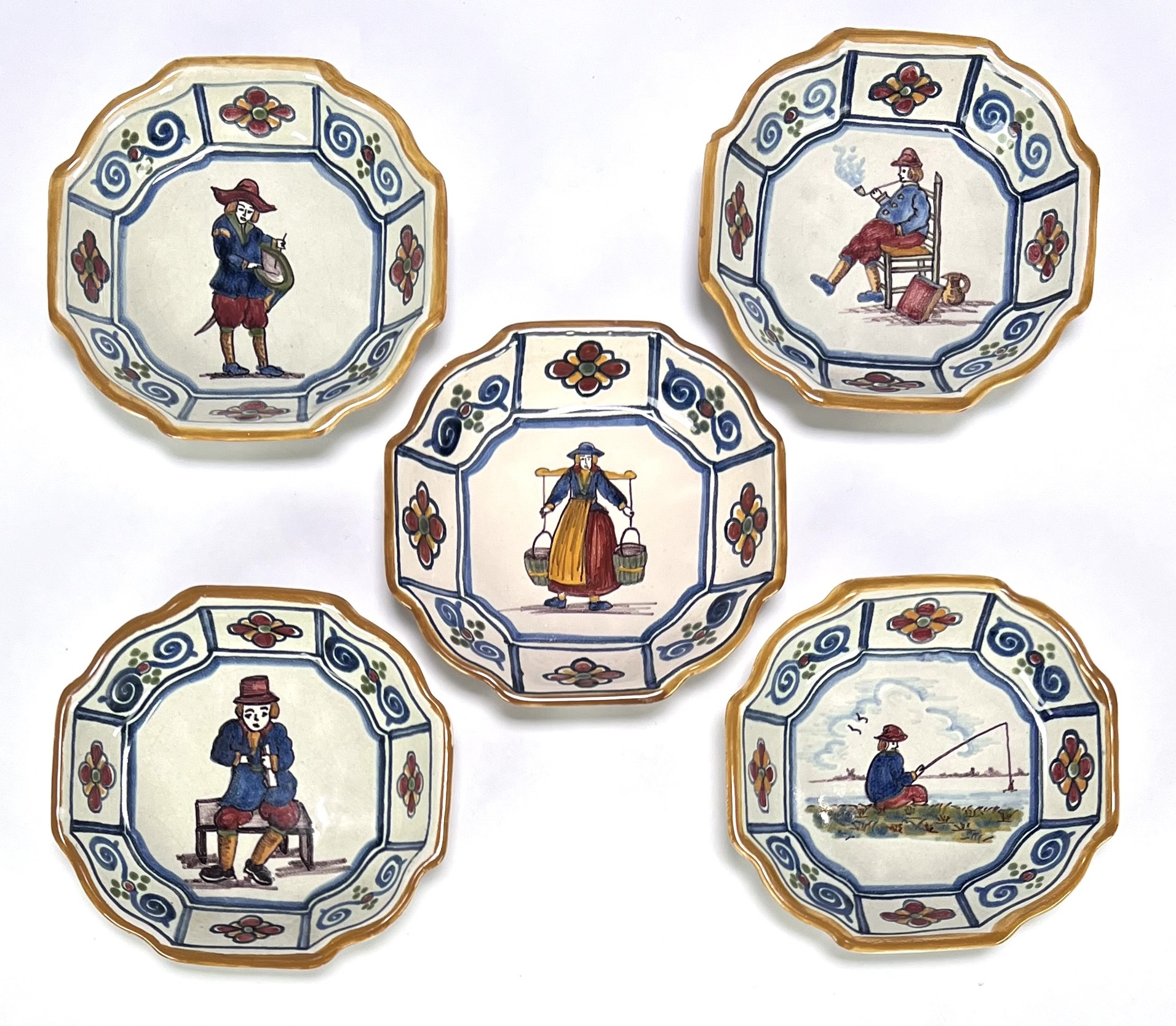 Majolica wandbordjes van Tichelaar Makkum, vervaardigd uit tin geglazuurd aardewerk met polychroom handbeschilderde decor. De vijf achthoekige bordjes tonen diverse Hollandse genretaferelen waaronder een visser, een melkmeisje en rokende figuren binnen een blauwe bies met florale ornamenten. Elk wandbord is gemerkt met het fabrieksmerk en schilders initialen. De bordjes dateren eind 20e eeuw en hebben een Nederlandse herkomst. Registreer nu en bied eenvoudig online mee op deze wandbordjes! |