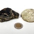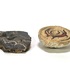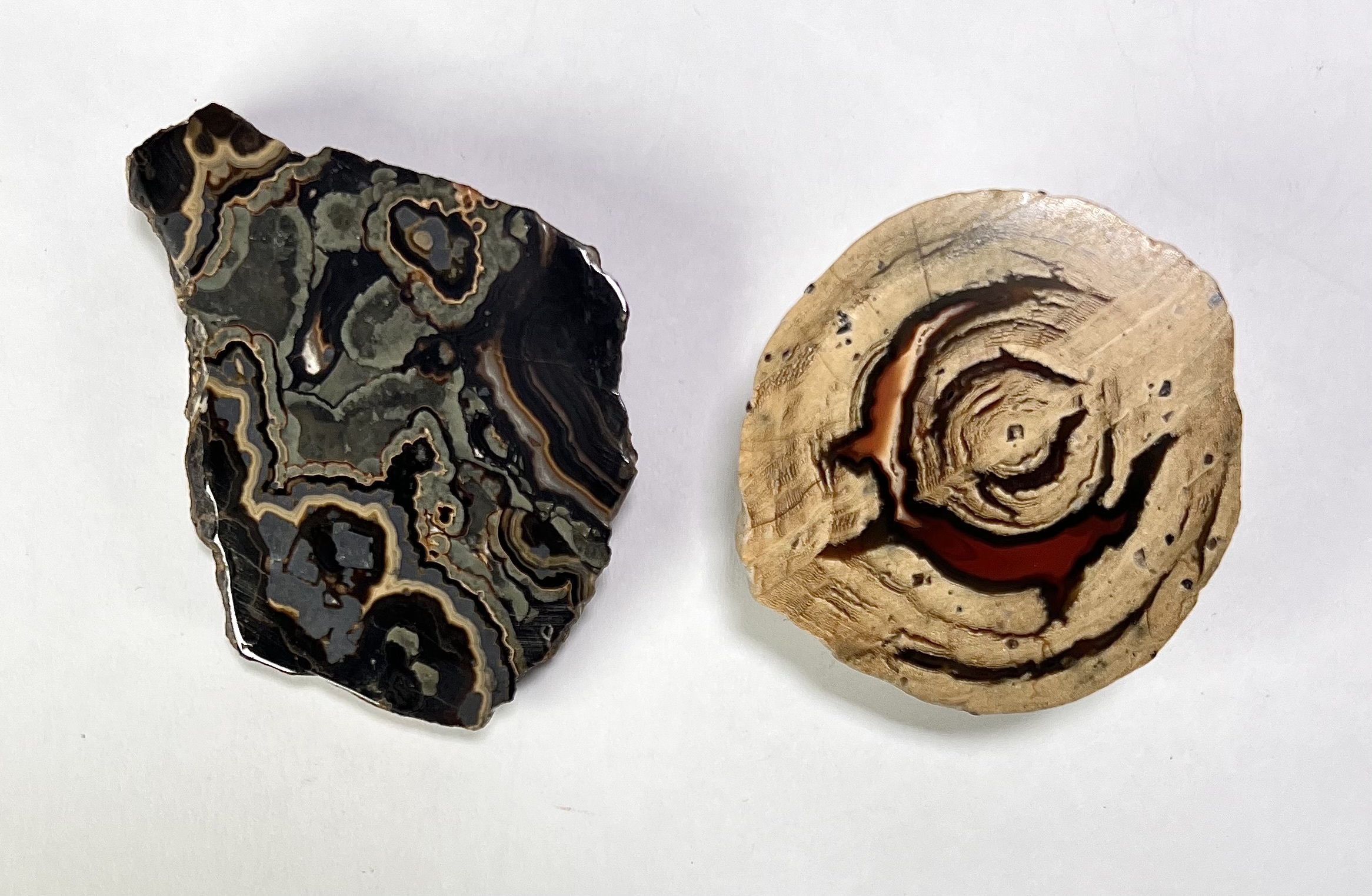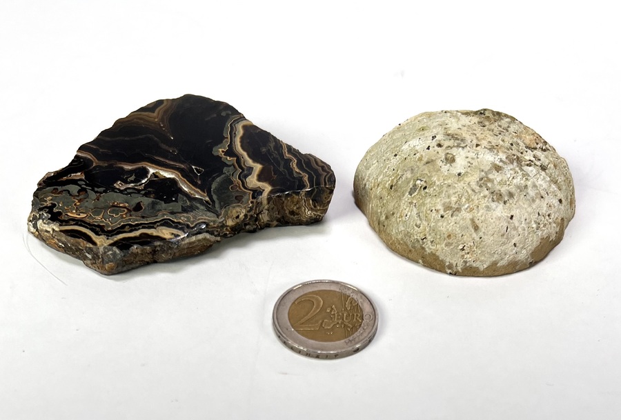 Paar stenen bestaande uit een gepolijste agaatgeode en een schijf versteend hout. De agaat toont karakteristieke concentrische banden in grijstinten en zwart, terwijl het versteende hout duidelijke botanische groeiringen en minerale kristallisatie vertoont. Beide exemplaren zijn aan de bovenzijde vlak geslepen en hoogglans gepolijst om de interne structuur te accentueren. Zuid-Amerikaanse herkomst. Eerst de stenen zien voordat je biedt? Bezoek onze kijkdagen op 10, 11 en 12 april! |