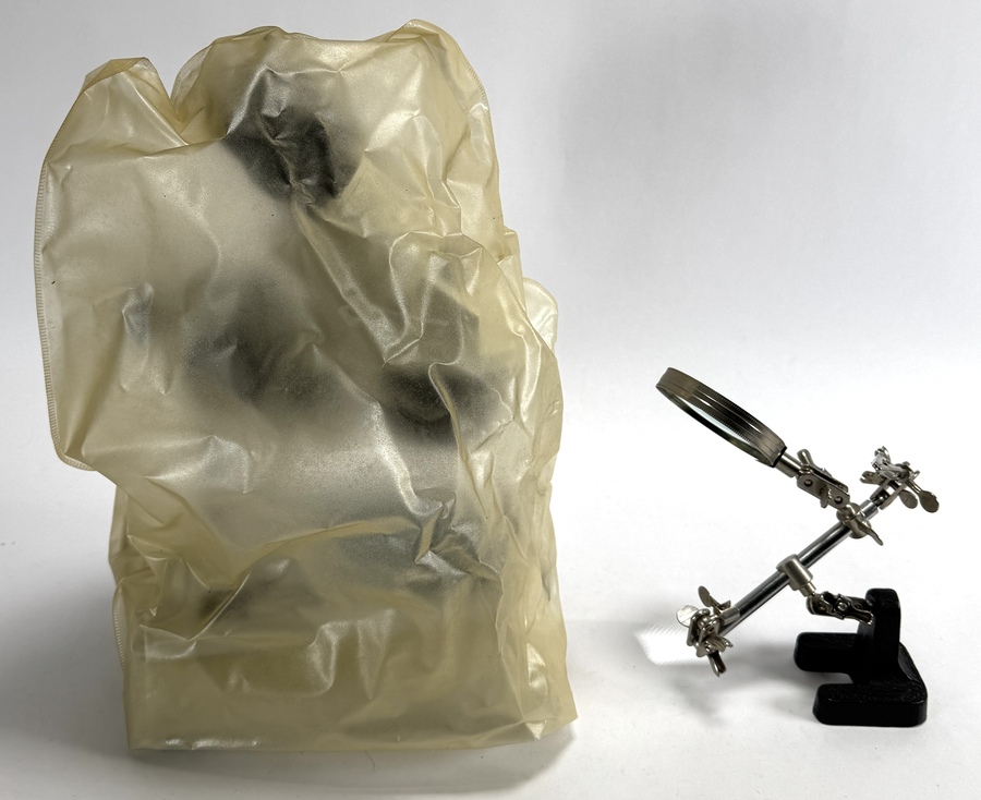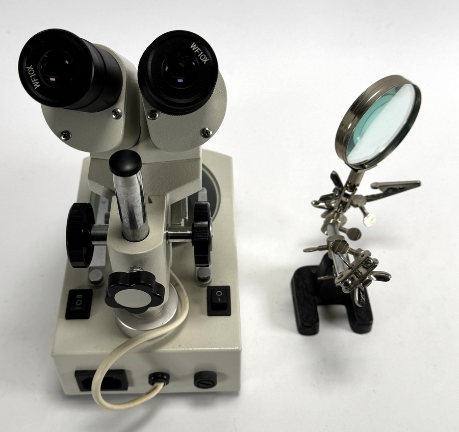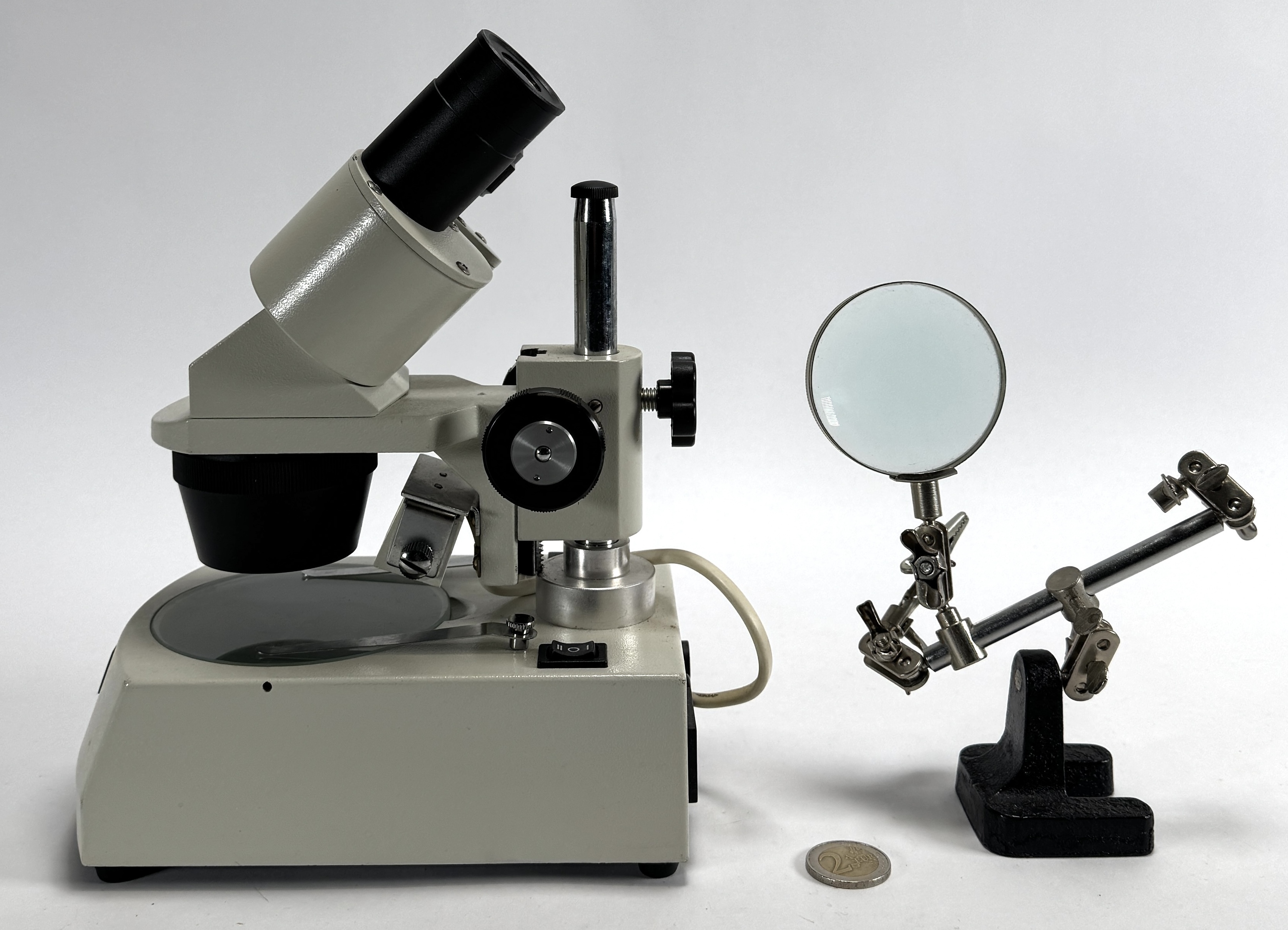 Stereomicroscoop van Byomic vervaardigd uit metaal en kunststof met optische glaselementen. De binoculaire BYO-ST31 configuratie is voorzien van WF10x oculairs en een 2x objectief voor stereoscopische waarneming. Bijgevoegd is een verstelbaar derde handje met vergrootglas en krokodillenbekklemmen op een verzwaarde gietijzeren voet. Begin 21e eeuw. Klaar om te bieden? Registreer je nu en doe mee aan de veiling! |