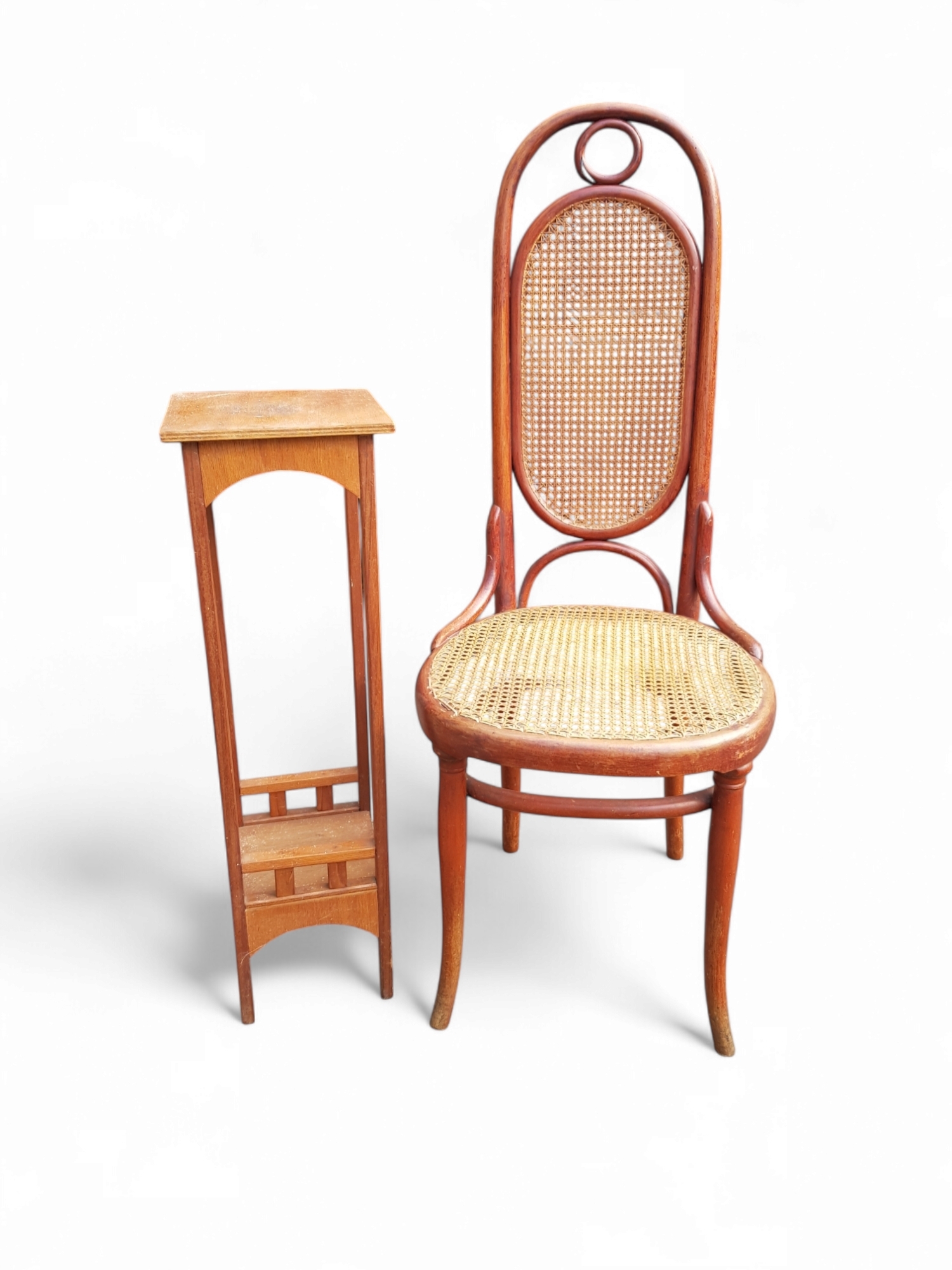 Stoel en plantentafel uit de Art Nouveau periode, vervaardigd uit gebogen beukenhout met gevlochten rotan zitting en rugleuning. De stoel toont een frame met cirkelvormige bekroning, de plantentafel heeft een geometrische opbouw met architecturale steunen. Daterend uit het begin van de 20e eeuw en een Midden-Europese herkomst. Wil je direct deelnemen? Plaats vanaf 3 april alvast een schriftelijk bod via onze website! |