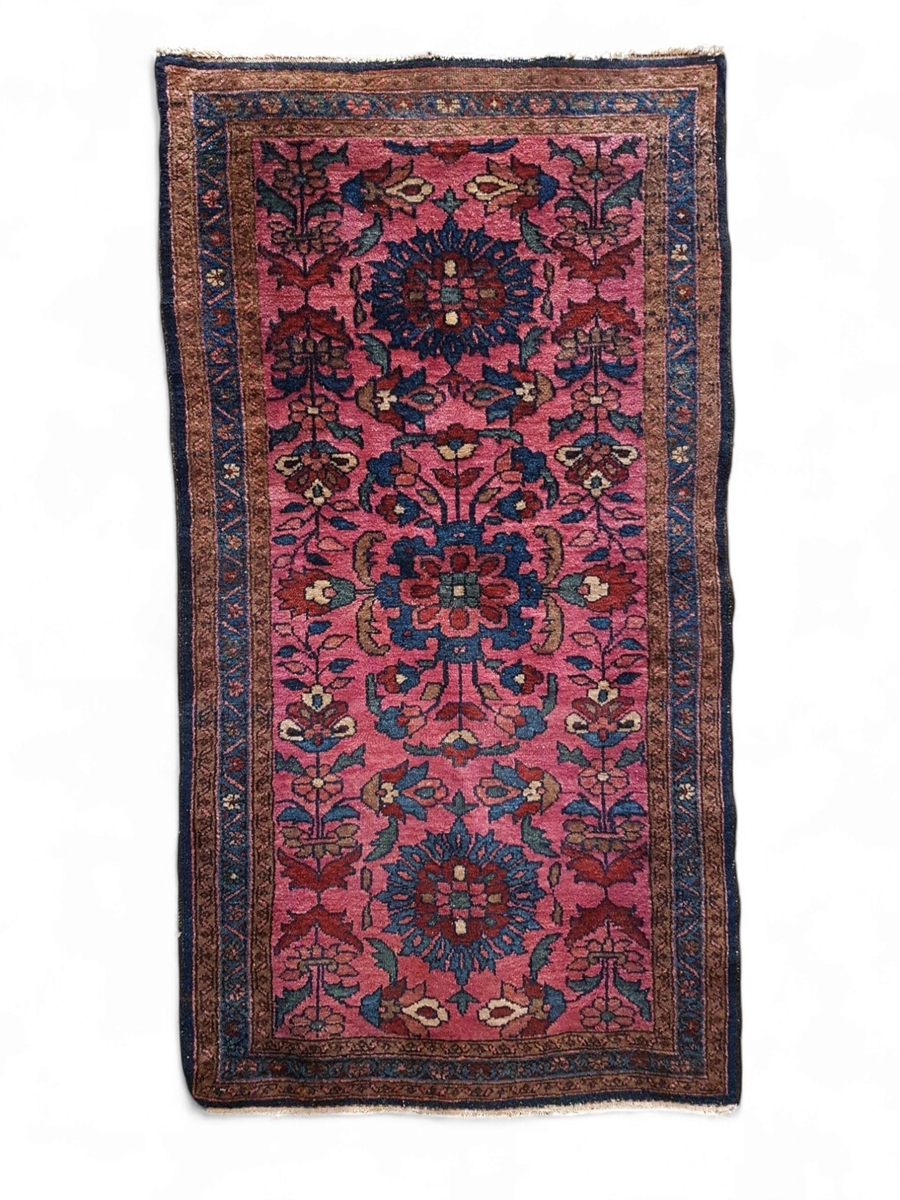 Sarouk kleed uit het midden van de 20e eeuw, vervaardigd met een asymmetrische Senneh-knoop in wollen pool op katoenen inslag. Het kleed toont een dicht floraal patroon van gestileerde bloemen en ranken in een diepe rozerode grondkleur. De hoofdborder in indigo blauw bevat doorlopende palmetten. Karakteristieke kleurvariaties zijn zichtbaar in de wol, een West-Perzische herkomst. Geïnteresseerd? Bezoek onze kijkdagen op 10, 11 en 12 april van 11:00 tot 17:00 uur! |
