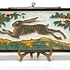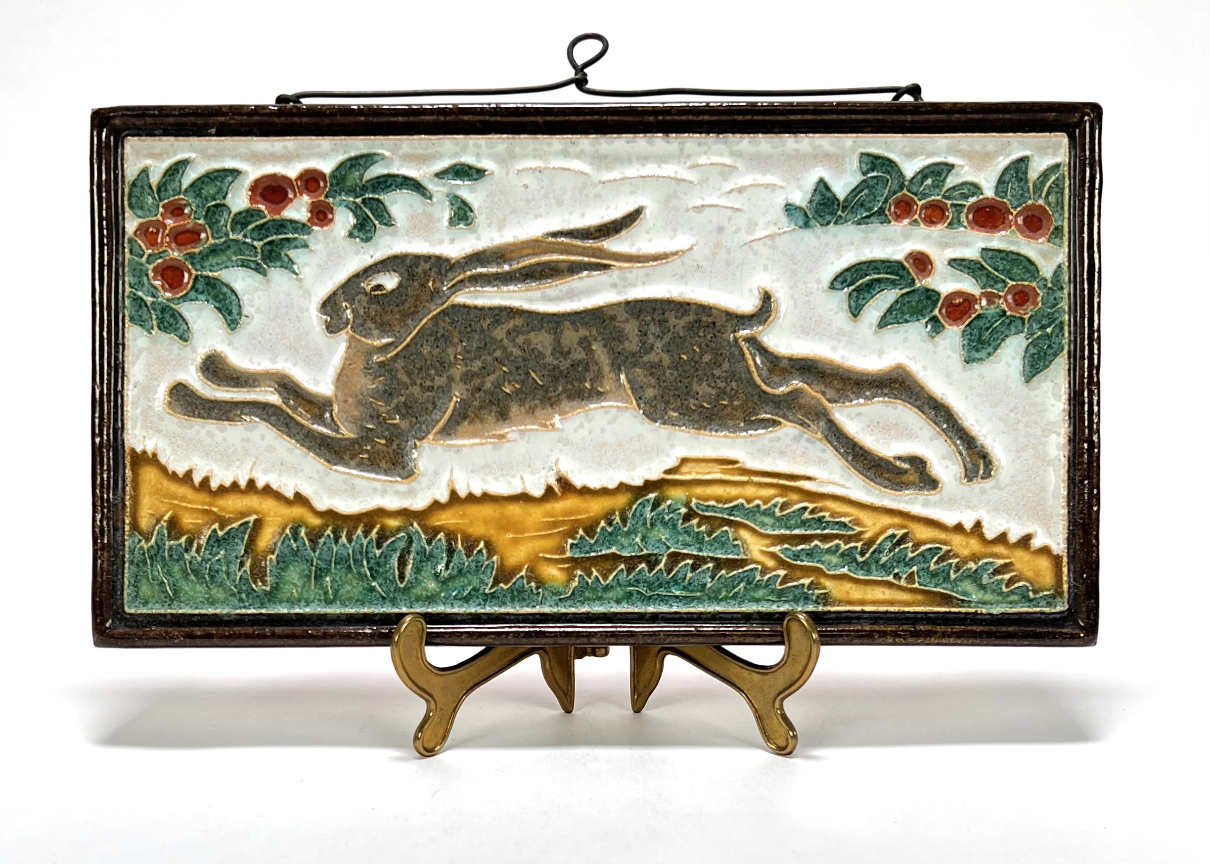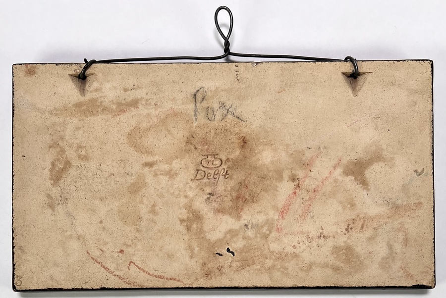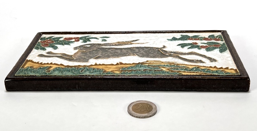Tegel van De Porceleyne Fles uit de Art Deco periode, vervaardigd uit keramiek in cloisonné techniek met reliëf geperste contouren en handbeschilderd tinglazuur. De tegel toont een springende haas in profiel, geflankeerd door bessentakken in groen en rood op crèmekleurige fond. Gemerkt aan de achterzijde met fabrieksstempel en opschrift Delft, de tegel dateert uit circa 1930 en heeft een Nederlandse herkomst. Deze tegel zelf beoordelen? Je bent welkom op onze kijkdagen op 10, 11 en 12 april! |